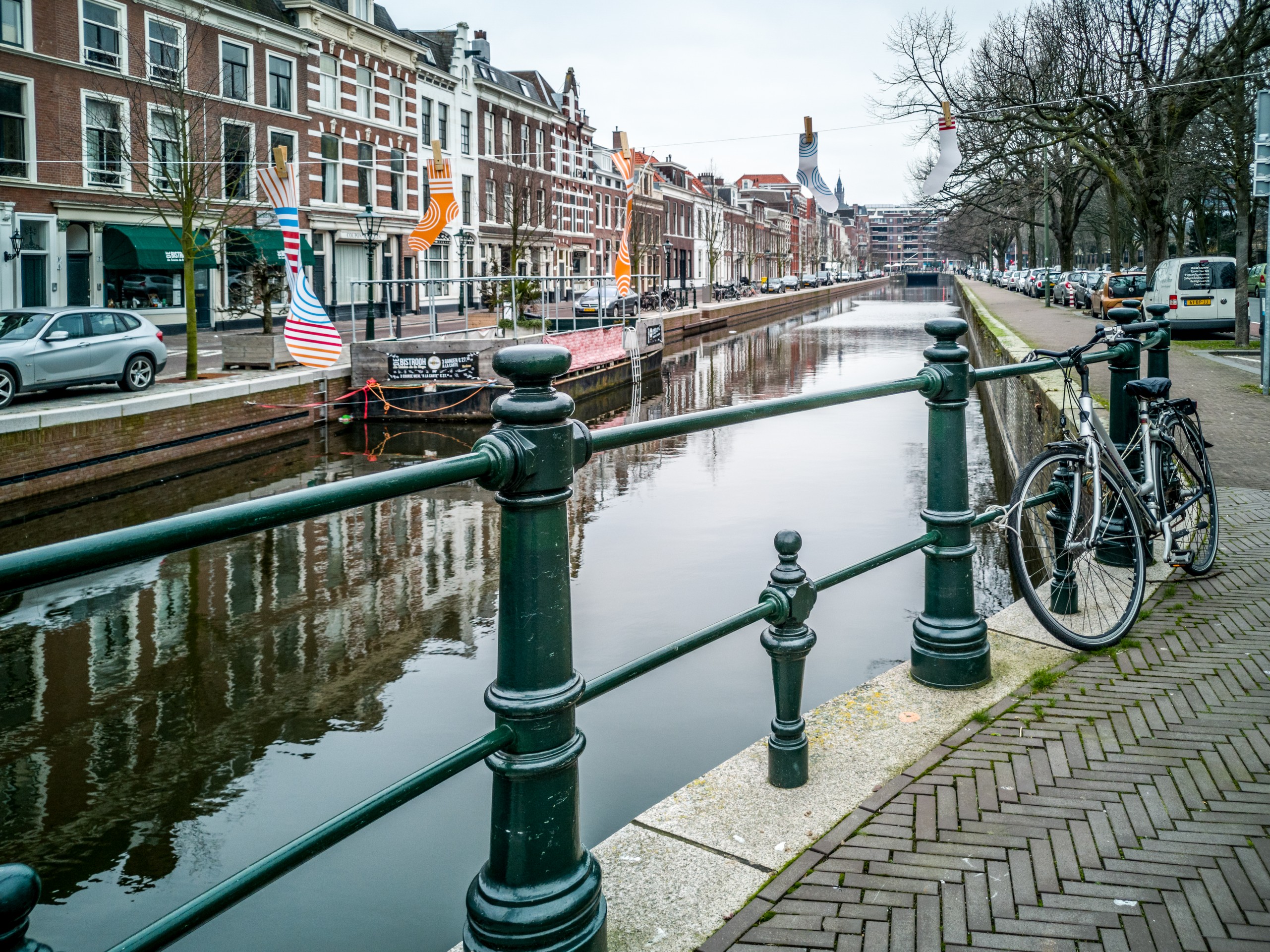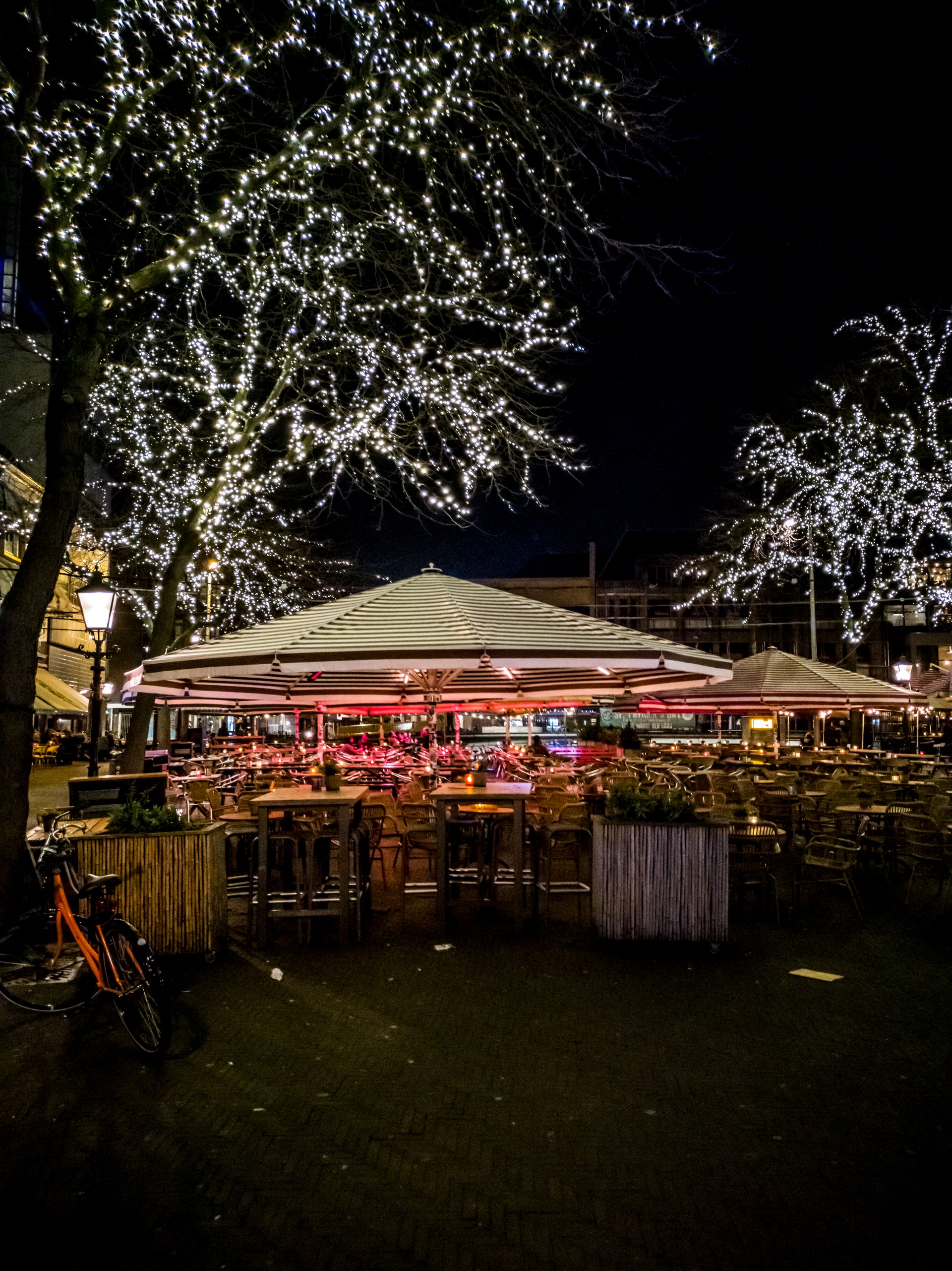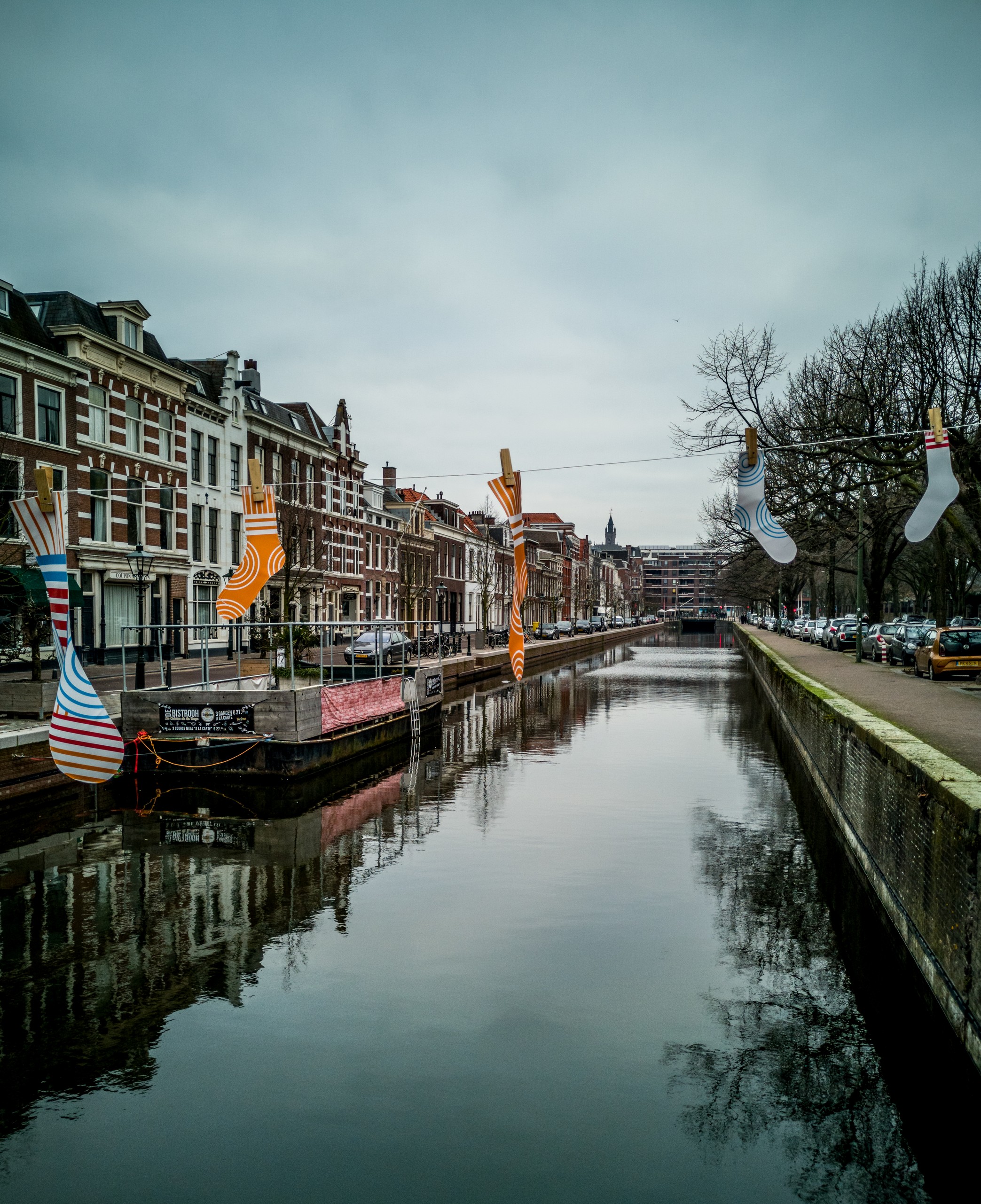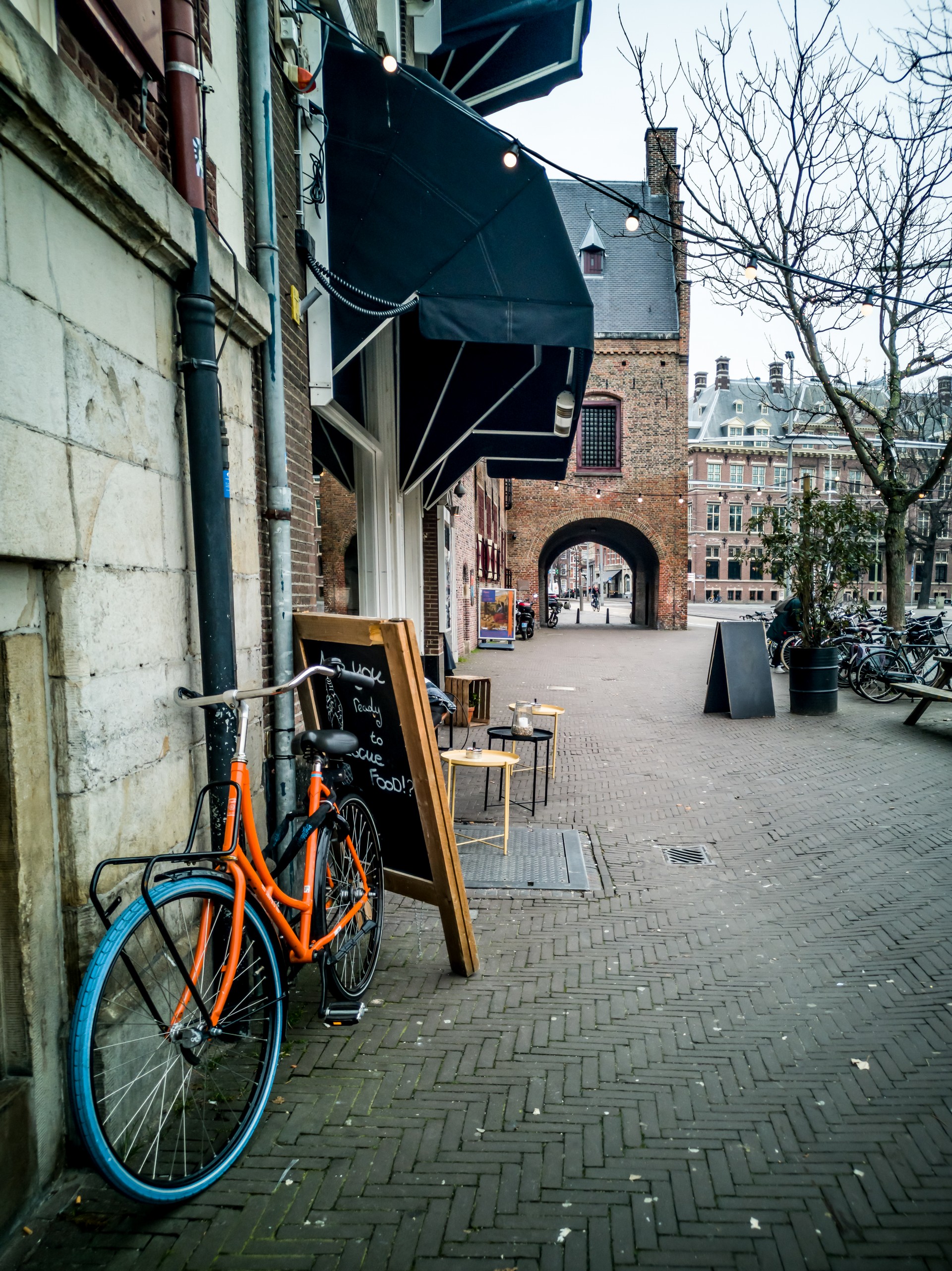 C’est la nuit tombée que je sors de mon OUIbus stationné derrière la Gare Centrale. Débarquer une fois le soleil tombé dans une ville que l’on ne connaît pas, ça fait toujours son petit effet. On ne se sait jamais très bien où on se trouve, ni a quoi la ville ressemble vraiment mais bien installée dans min tram, j’observe. D’autant plus que la coutume hollandaise veut que l’on ne tire pas les rideaux le soir, on peut donc observer des tas de petits intérieurs pendant que le véhicule file vers sa prochaine station. Je descends rapidement du tram juste avant le pont d’un petit canal. Sur l’autre rive, quelques jolis bâtiments typiquement hollandais, à l’avant-plan, un vélo est enchaîné à un réverbère. C’est donc sur un cliché parfaitement néerlandais que j’arrive à mon petit hôtel (je n’en parlerai pas, il ferme dans quelques semaines). Je me presse de déposer mes affaires. Il est déjà tard, près de 22h et trouver un restaurant avec une cuisine ouverte va être difficile ! Je me mets en route et la première chose que je remarque est le calme qui règne dans la ville. Presque personne dans les rues, quasi pas de voitures, les vélos passent presque en silence… Par contre, je remarque Princestraat, la rue empruntée pour rejoindre Rond de Grote Kerk, est remplie de petits café, boutiques et restaurants. Cette petite balade m’aura permis de me donner une première l’idée de La Haye et de me m’orienter le lendemain.