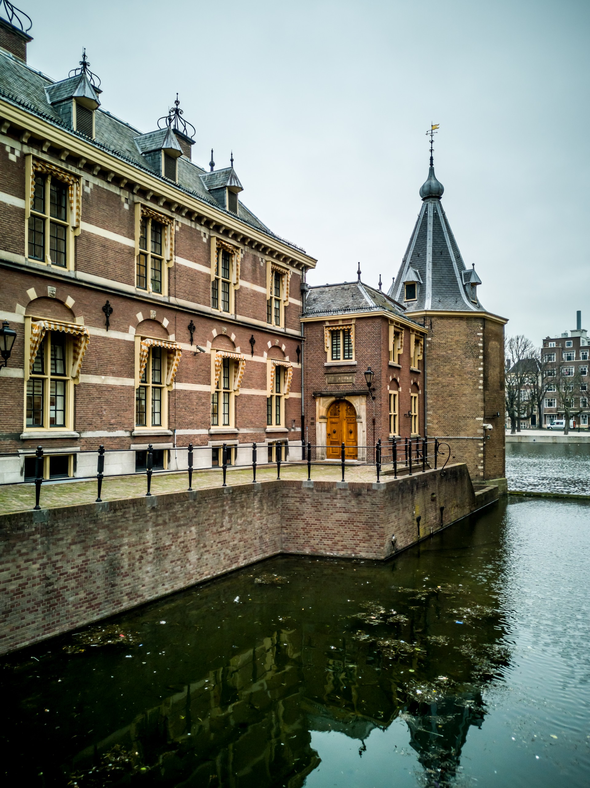 Je suis le fil de la monarchie (constitutionnelle) pour arriver au coeur du centre de décision : Binnenhof. Le Binnenhof (la « cour intérieure »), encadrée par un canal et par un étang, le Hofvijver, est le lieu où sont concentrés les pouvoirs législatifs et exécutifs avec le cabinet du Premier Ministre (son bureau est situé dans une jolie petite tour devant l’étang, il n’est pas trop mal placé) et les deux chambres qui forment les Etats Généraux, le parlement du pays. Au milieu de tout ça, s’élève la Ridderzaal, la salle des chevaliers, un bâtiment gothique qui sert de lieu d’apparat. Chaque année, le roi arrive en grande pompe, passe les portes du Binnenhof dans son carrosse, rentre dans la salle où sont réunis les parlementaires avant d’ouvrir la nouvelle session de l’année et de voter le budget. Cet évènement se déroule toujours le 3ème jeudi de septembre : le Prinsjesdag. En plus d’admirer la Ridderzaal et les bâtiments environnants, ce qu’il y a de plus fun à faire ici, c’est d’observer la foule : un étrange mélange de touristes appliqués sur leurs guides ou leurs appareils photos, de groupes scolaires de tous âges qui se baladent en riant, tous affublés d’un auto-collant de visiteurs bien évidemment orange (la couleur des Pays-Bas) et un ballet incessant de Messieurs-Dames en costume-cravate ou en tailleur, dossiers sous les bras, qui entrent et sortent du parlement. Il y a aussi les chauffeurs, qui patientent à côté de grosses berlines, attendant sans doute l’un ou l’autre ministre. On sent vraiment toute l’énergie qui est contenue dans cette petite enclave un peu protégée du reste de la ville.