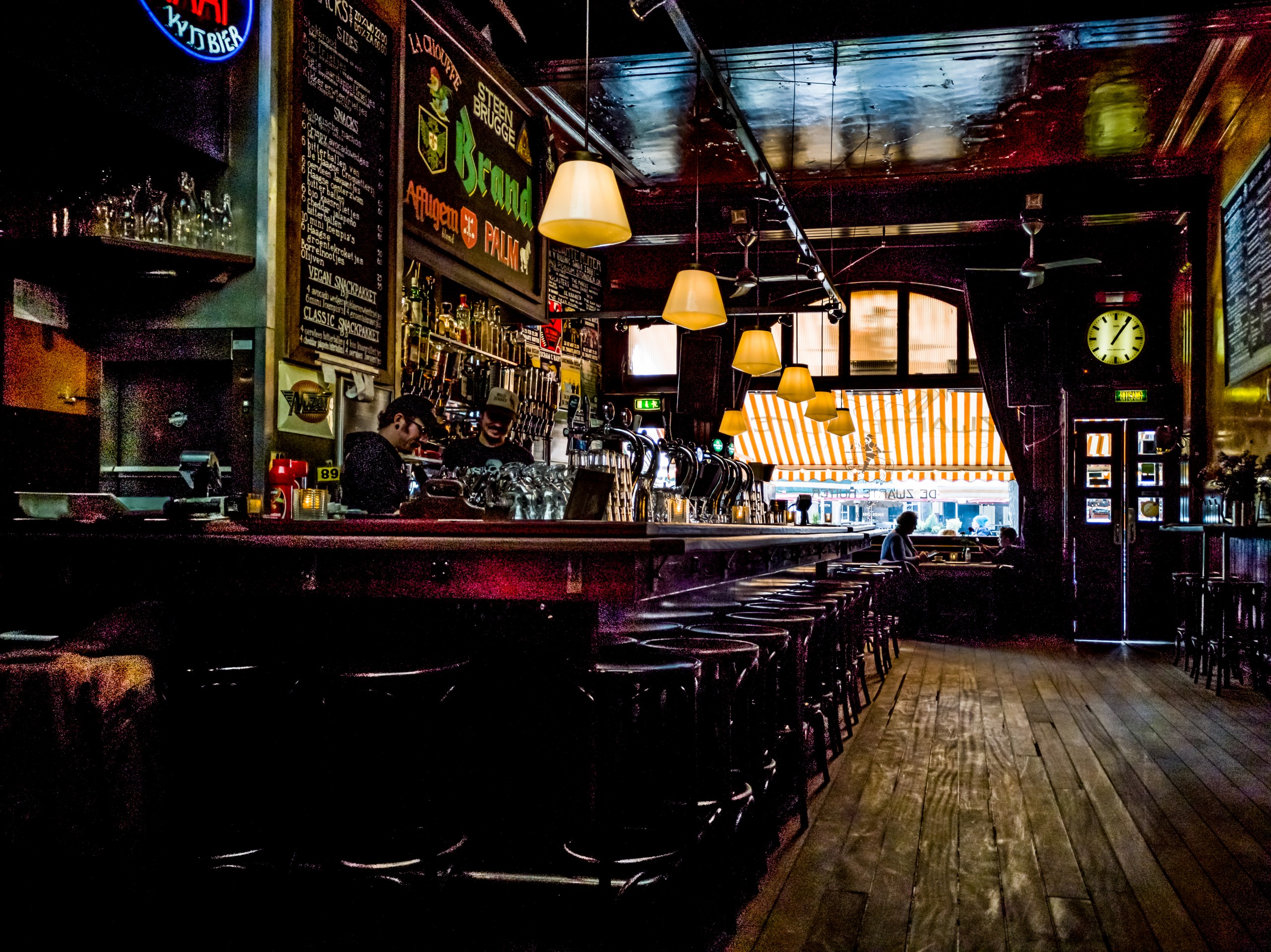 Ma pause lunch se déroulera au Zwarte Ruiter, à la fois café, brasserie et salle de concert avec une forte affinité pour le rock ! L’intérieur est vraiment immense, tout de bois sombre. La première partie du café fait la part belle à l’immense comptoir et la deuxième partie est complètement ouverte, avec un étage qui permet de voir la scène. Quant à la carte, on y trouve une cuisine de brasserie à base d’ingrédient bio : soupe, salade, taco, burger, les inévitables satés… Comme je suis pressée, je vais me contenter de frites bio, histoire de comparer avec la recette belge. Je reçois donc un paquet de grosses frites, plus grosses que celles dont j’ai l’habitude, mais plutôt bonnes. Manque un peu de croustillant, mais le goût y est !