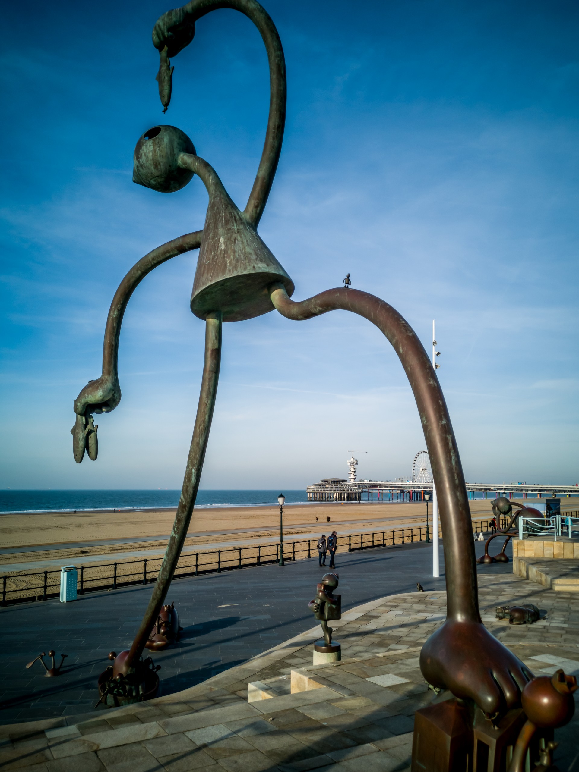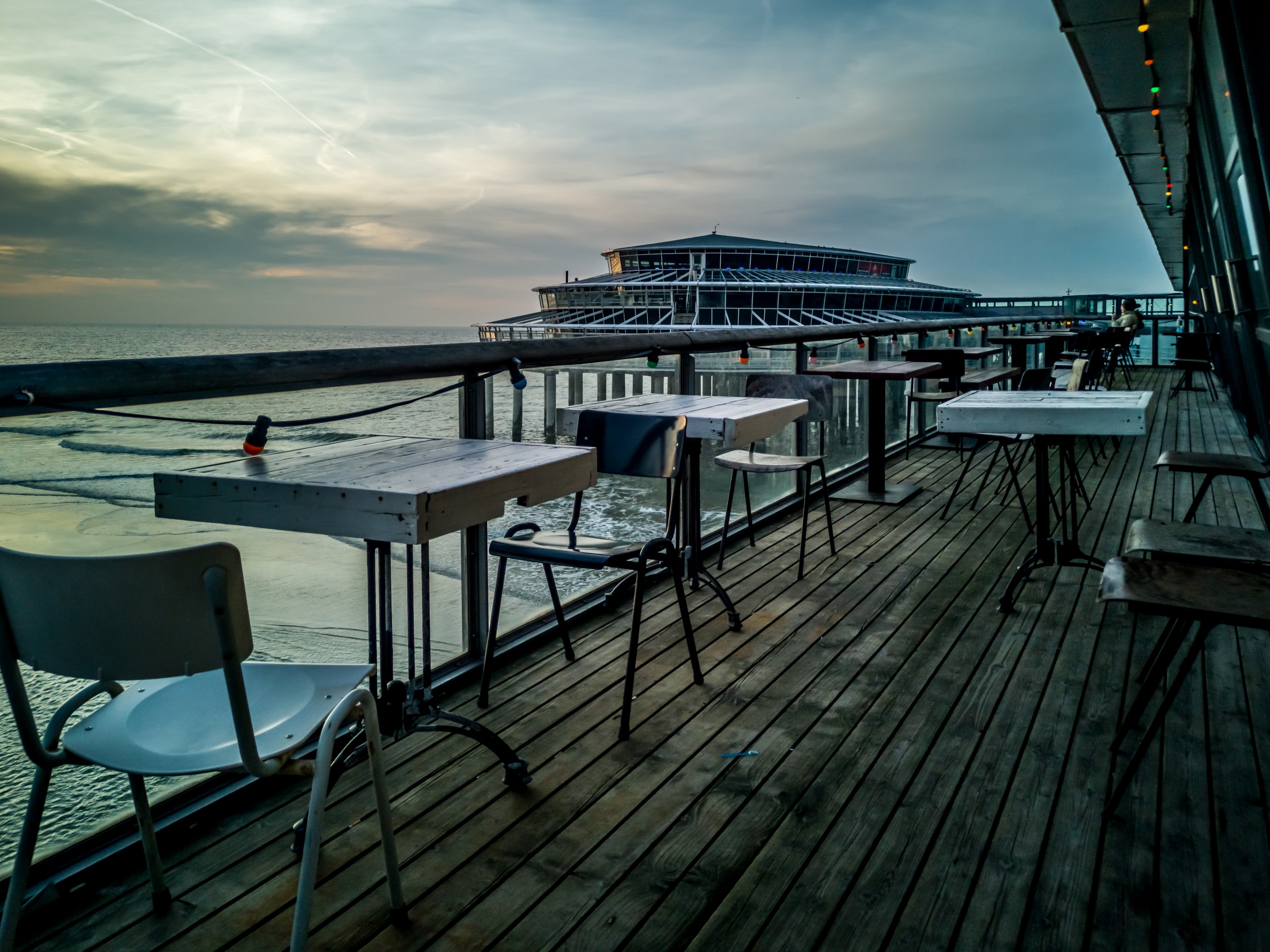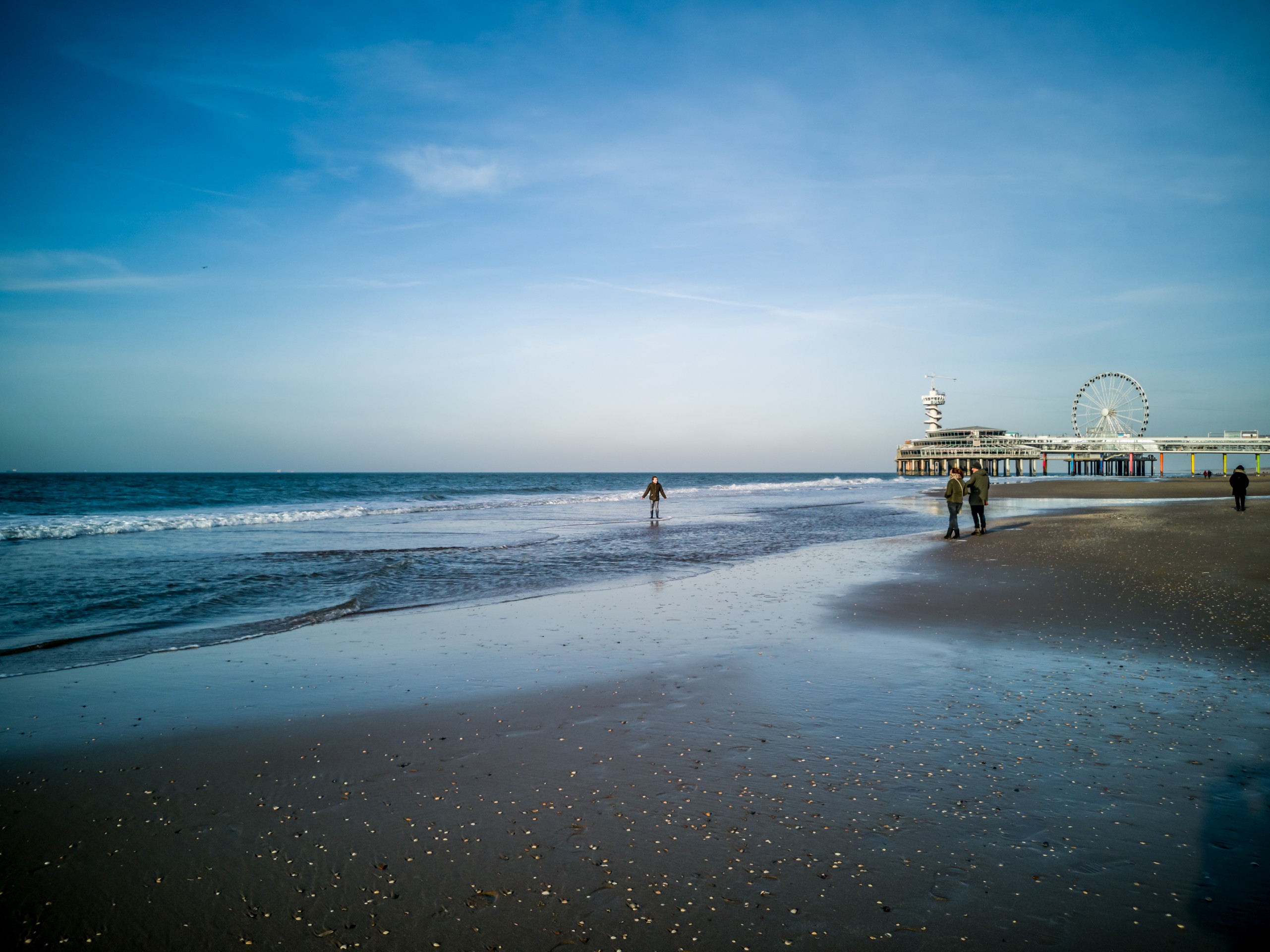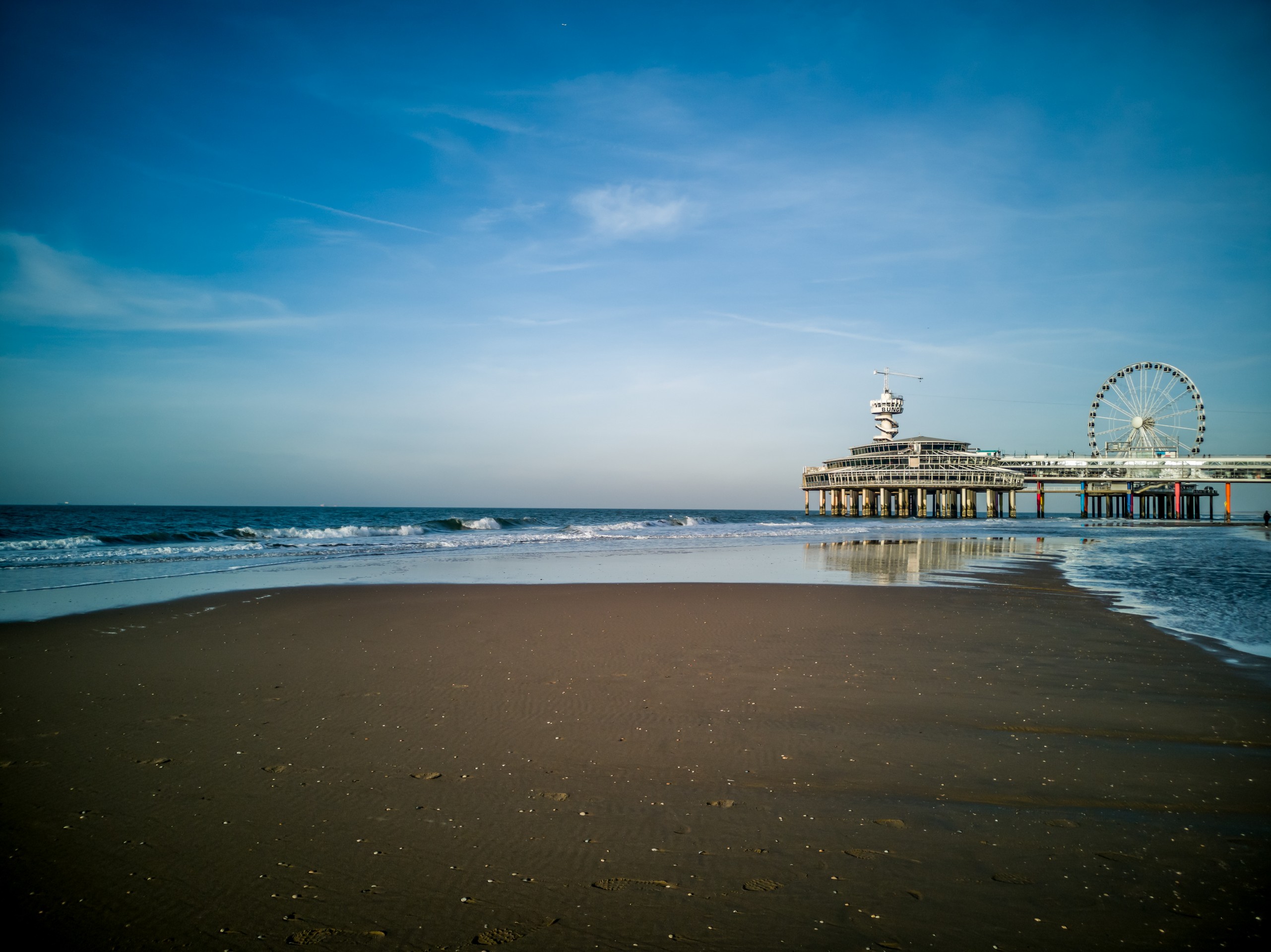Qu’il est loin le temps où Scheveningen était un village de pêcheurs. Un peu moins loin, l’époque des premiers bains de mer, mais il reste les élégantes maisons du XIXème. Le front de mer, lui, a subi les mêmes outrages que les côtes belges. Il y a des moches bâtiments en forme de barre. Alors tournez votre regard vers la mer et admirez l’immense étendue de sable (11 km de plage sur la Mer du Nord). Si vous vous baladez sur la digue, vous croiserez sûrement de nombreuses oeuvres d’art. Ce sont les sculptures du parcours Beelden aan Zee qui égaient la promenade. Par contre, on ne peut pas manquer le plat de résistance de la plage de Scheveningen : sa jetée. La Jetée de Scheveningen s’étire loin, suspendue au-dessus de la mer. Elle est terminée par une rotonde et flanquée d’une grande roue. On peut même sauter à l’élastique ! La jetée en elle-même est un véritable centre de loisir. Premièrement, elle est à deux étages (un étage complètement fermé et l’autre, ouvert) et à l’intérieur du premier, on trouve des boutiques, restaurants et bars, certains avec terrasse. Je ne me le fais pas dire deux fois et après une longue promenade sur la plage, je vais tranquillement m’installer dans un canapé face au soleil couchant, bien au chaud à admirer la vue et les gens qui déambulent sur le sable.