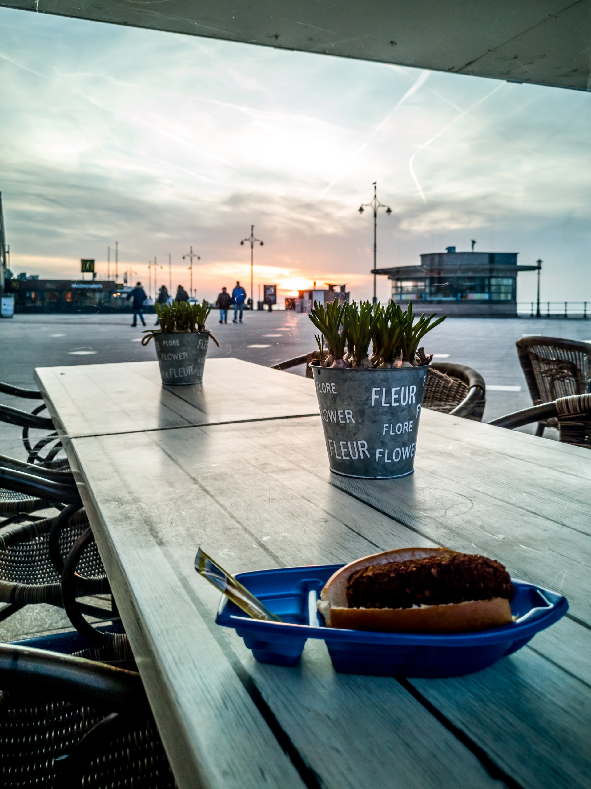 Mais revenons à notre baraque à poisson. Qu’y trouve-t-on ? Plusieurs sortes de poissons frits, dont les fameux kibbelings, des petits morceaux de cabillaud frit, servis soit en sandwiches, soit en plat avec des frites. Le tout est préparé minute, il faut donc attendre un peu, ce n’est pas un vrai fast-food. De mon côté, j’ai opté pour une croquette de crevette, un incontournable de la mer du nord, servie dans un petit pain mou. La croquette avait un peu trop cuit mais la farce de crevettes était bien coulante et goûteuse et on pouvait voir à l’intérieur les petits morceaux de carottes et de persil. Elle est validée ! Me voilà calée en attendant d’aller au resto. C’est sous une bise froide, dans la lumière d’un soleil rouge, que je vais retrouver l’arrêt de tram.