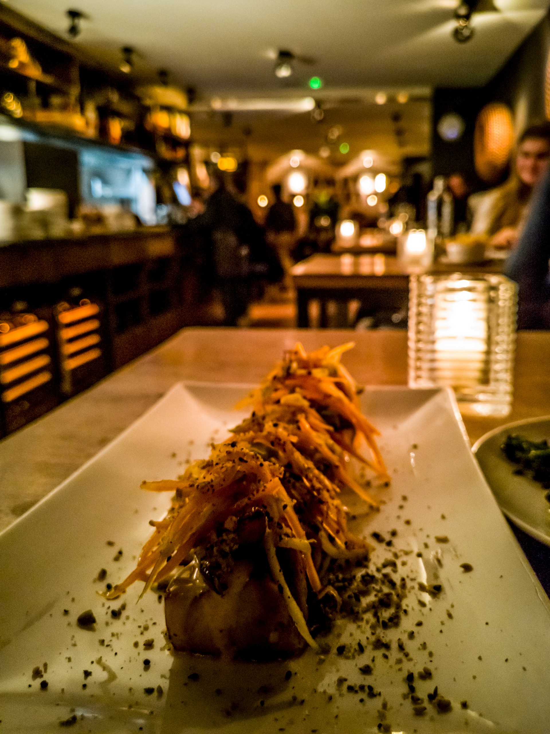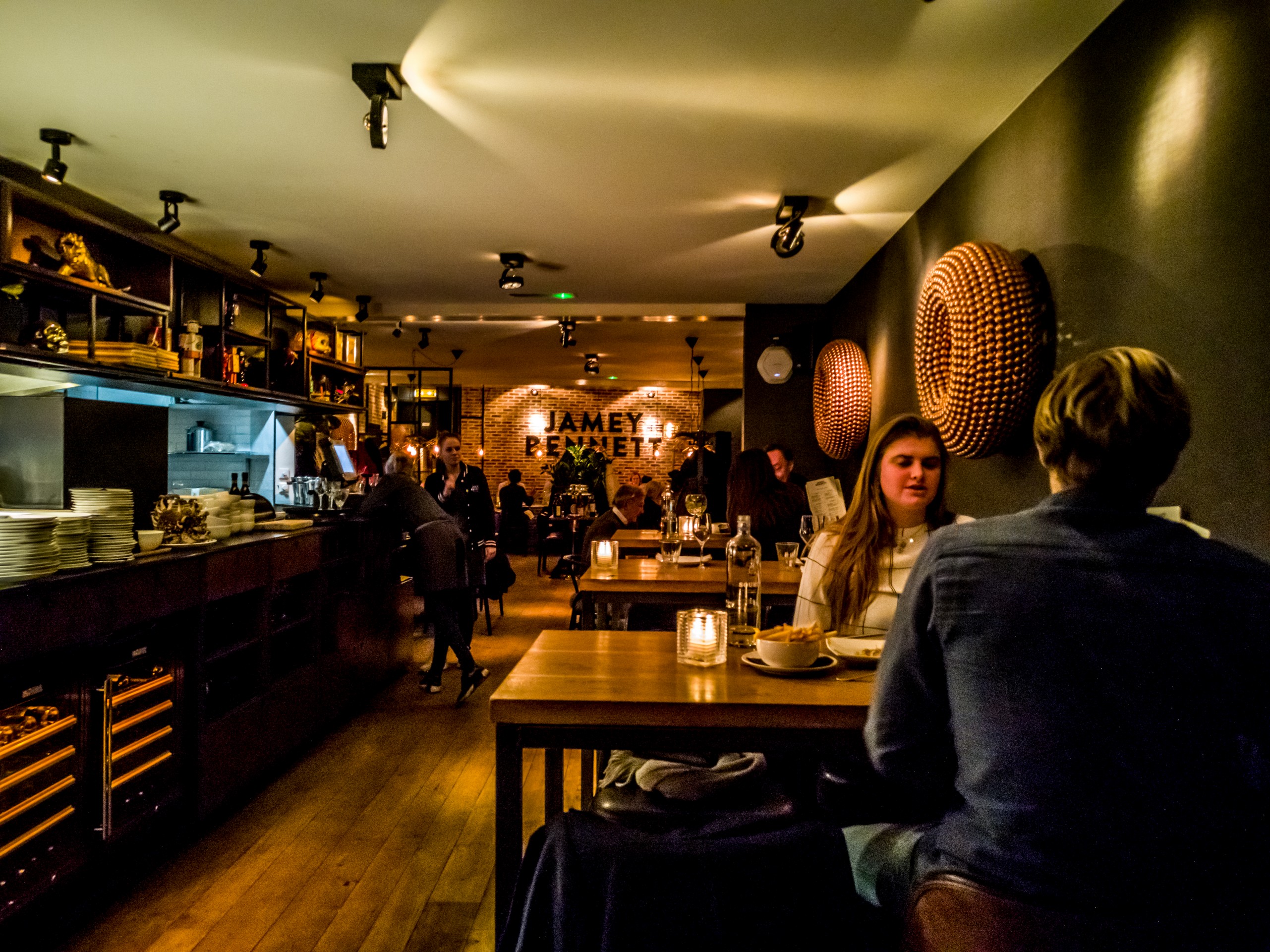 Je tombe sur Jamey Bennett. A travers la vitre, je distingue à l’avant de confortables chesterfields et des tables à l’arrière. Hmmm… ça me dit, j’entre. Et il y a de la place, me voilà donc juchée sur un tabouret à consulter le menu. On pourrait qualifier la carte de « fusion » avec un accent mis sur la viande et des accents japonisants dans les accompagnements. J’avais opté pour une poitrine de porc iberico avec de drôle de légumes asiatiques dont j’ai oublié le nom. Verdict ? C’était bon (la viande est de qualité) mais rien d’extrêmement transcendant. Peut-être à cause des légumes qui ont un gout un peu fade. Par contre, le rapport qualité prix y était (9,5 Euros).