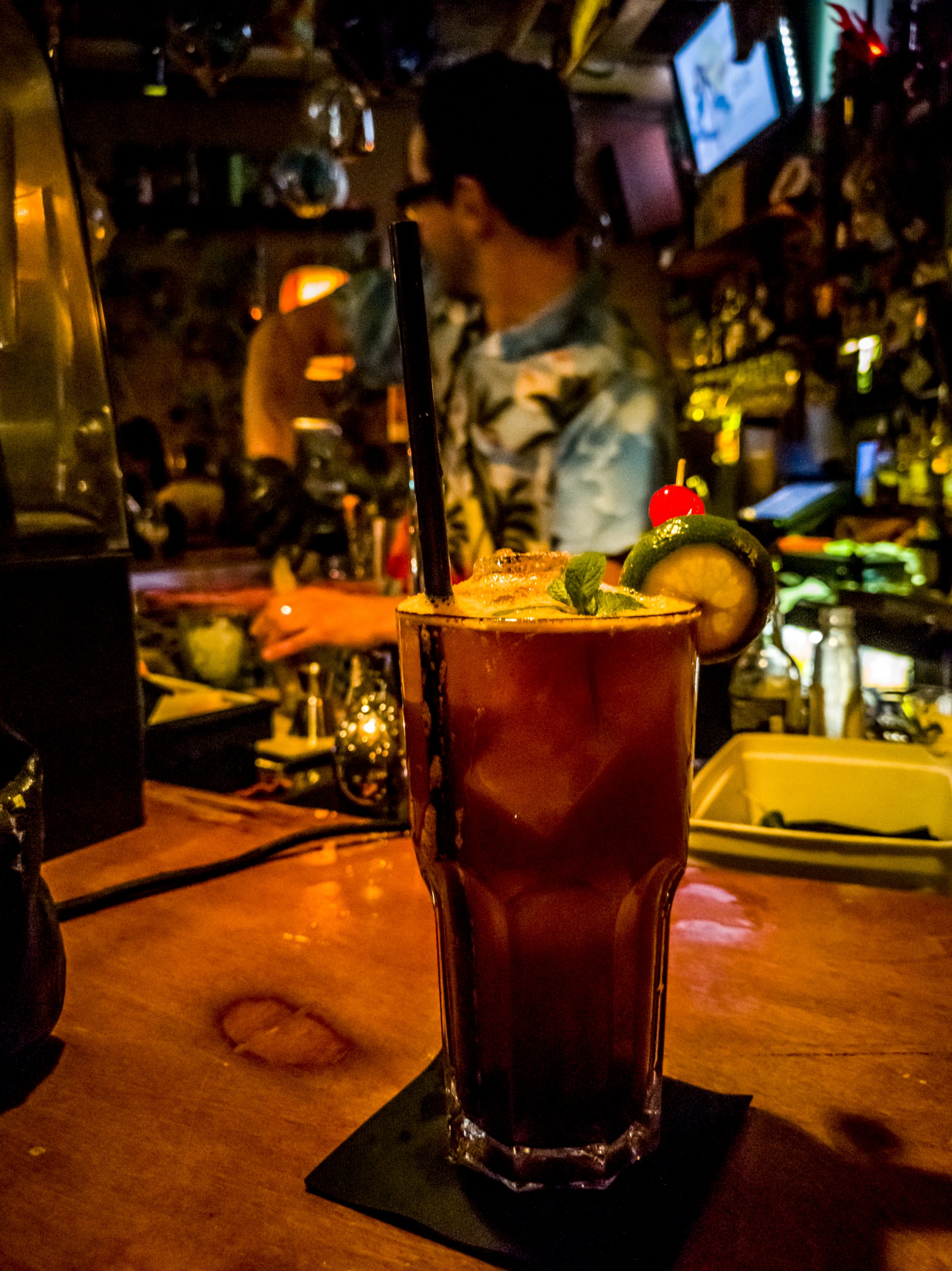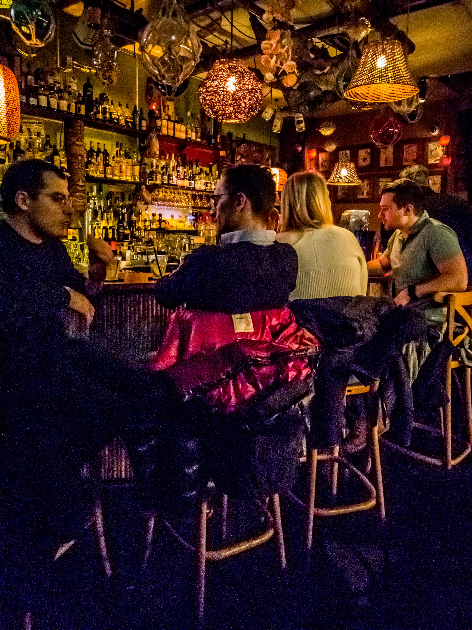 Mes pas me conduisent à nouveau sur la Grote Markt où j’avais aperçu un plus tôt un bar qui m’avait l’air plutôt sympathique : le Va Voom Tiki Room. Le Va Voom, c’est un vrai Tiki bar : ambiance tropicale, lumières multicolores et barmen à chemises hawaïennes sont de mises. Justement ce qu’il me fallait pour oublier l’hiver. Si l’ambiance est détendue dans le bar, les barmen eux, sont concentrés sur leurs concoctions et vous savez quoi ? J’approuve ! Mon « Captain Mike’s Wench » était bien balancé, pas trop sucré et c’est joyeuse que je peux enfin rentrer à l’hôtel pour me reposer.