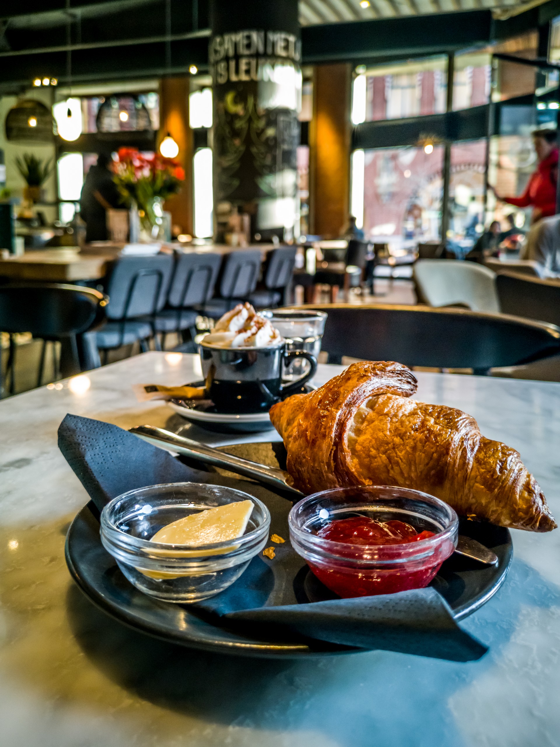 J’ai juste le temps de prendre mon petit-déjeuner à l’aise avant de partir. Sur le chemin de la gare, je m’arrête donc chez Anne&Max, l’endroit est tout simplement gigantesque. Il y a de l’espace, un joli mélange entre le sol en béton ciré, du carrelage géométrique, des meubles en bois avec un côté brut, des fauteuils qui vous donne envie d’y passer des heures… et plein de lumière. Quand arrive ma tasse de café et mon croissant, je me régale. Le café est juste bien et le croissant, encore chaud et bien feuilleté. Une dernière expérience qui me faire regretter de partir si tôt.