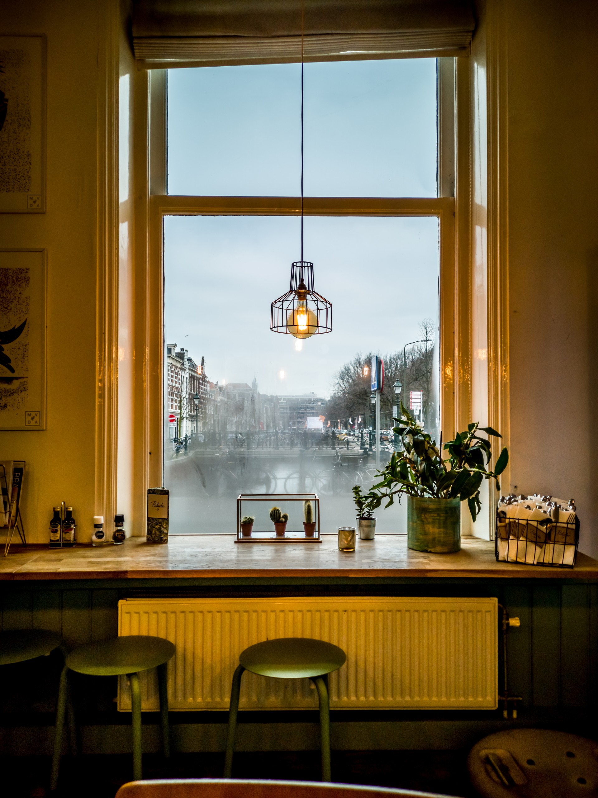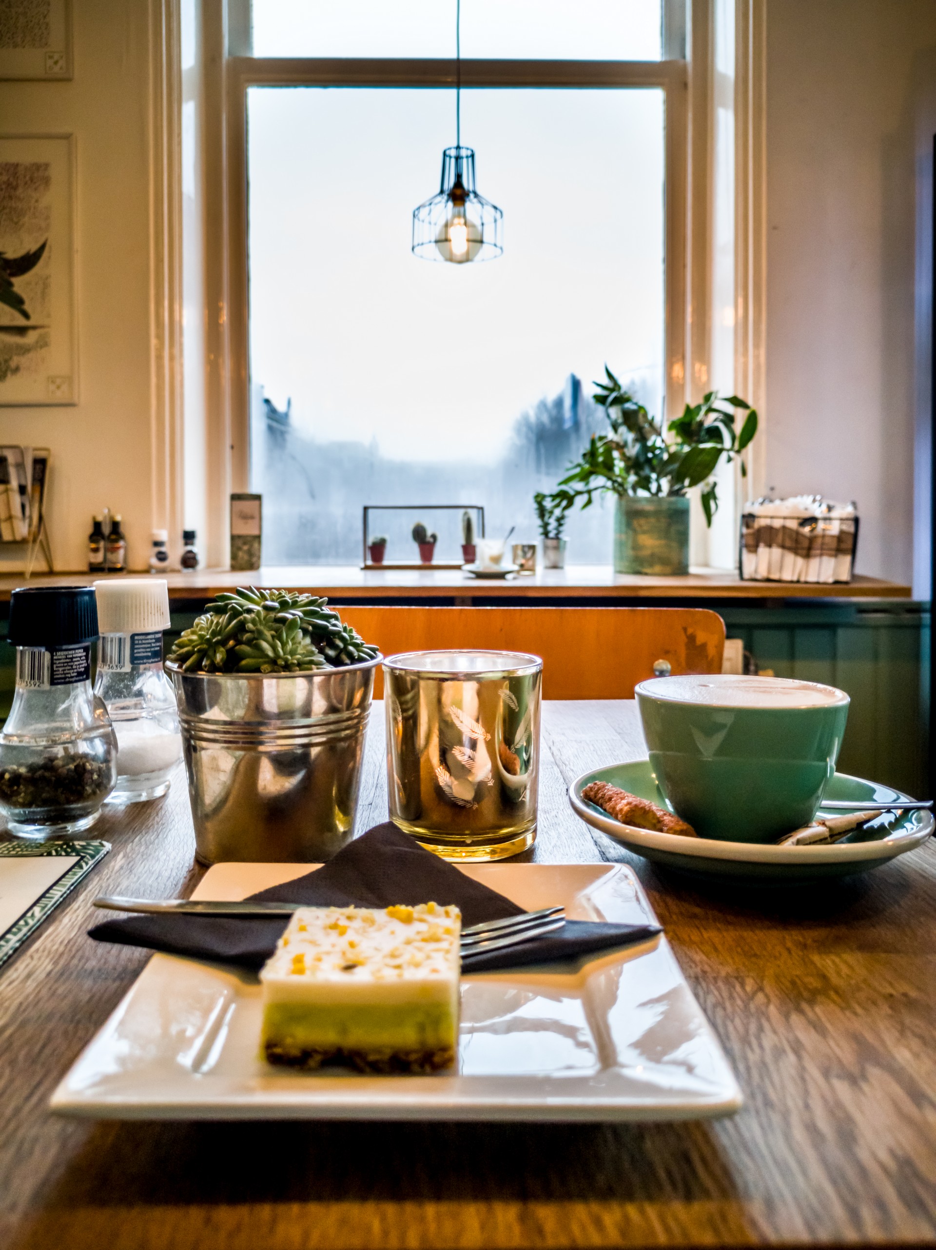 Comme le café en dessous de mon hôtel n’ouvrait qu’à dix heures, j’irai prendre le petit-déjeuner au Pistache Café, juste de l’autre côté du canal. Situé dans un immeuble en coin, on peut venir y manger un petit-déjeuner ou un lunch et même commander un pic-nic pour profiter pleinement du parc de Palais Noordeinde tout proche. Evidemment, quand on entre, on ne peut pas manquer de remarquer les murs… vert pistache. Ça donne un côté frais à l’ensemble. On rajoute des tables en bois, des coussins aux couleurs de la nature, pas mal de plantes, deux énormes fenêtres pour inonder le café de lumière… Ça met en appétit et la carte est plutôt alléchante avec ses nombreuses pâtisseries, ses préparations à bases œufs, ses sandwiches tout frais… et bien entendu, plein de sortes de cafés. On est bien !