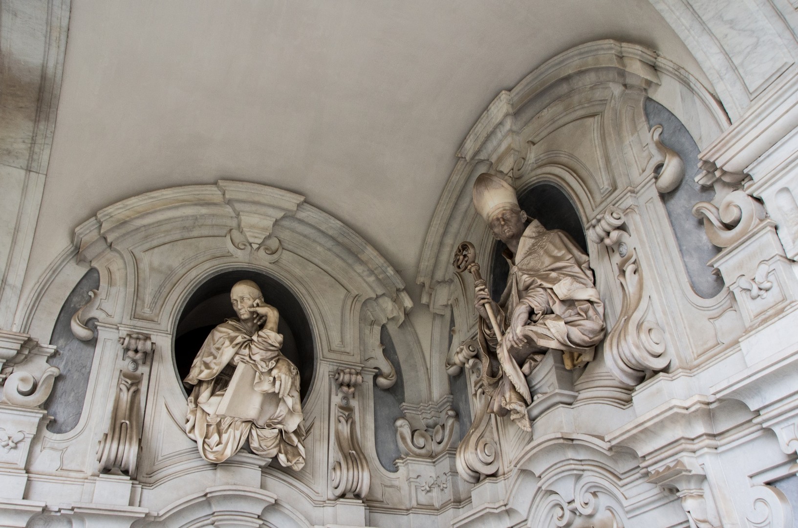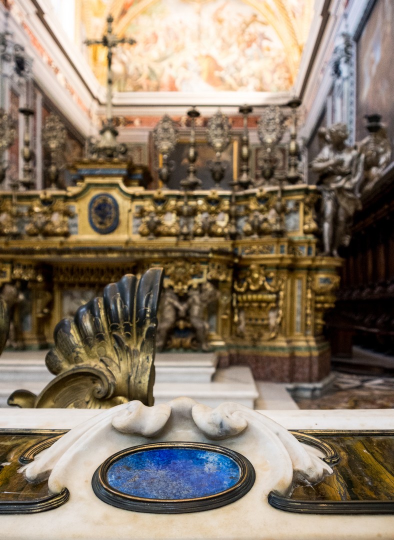 Lorsque l’on rentre dans la cour d’honneur, plutôt sobre avec ses murs blancs et ses pierres grises, on ne soupçonne pas l’extravagance qui se cache à l’intérieure. Construite sous les Angevins aux XIVème siècle et donnée au Chartreux (l’ordre préféré des grandes familles françaises), la chartreuse fut « relookée » pendant la période baroque et on a pas ménagé l’argent pour la rendre étincelante.