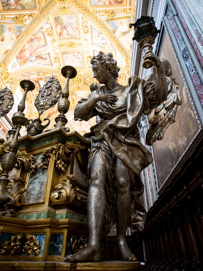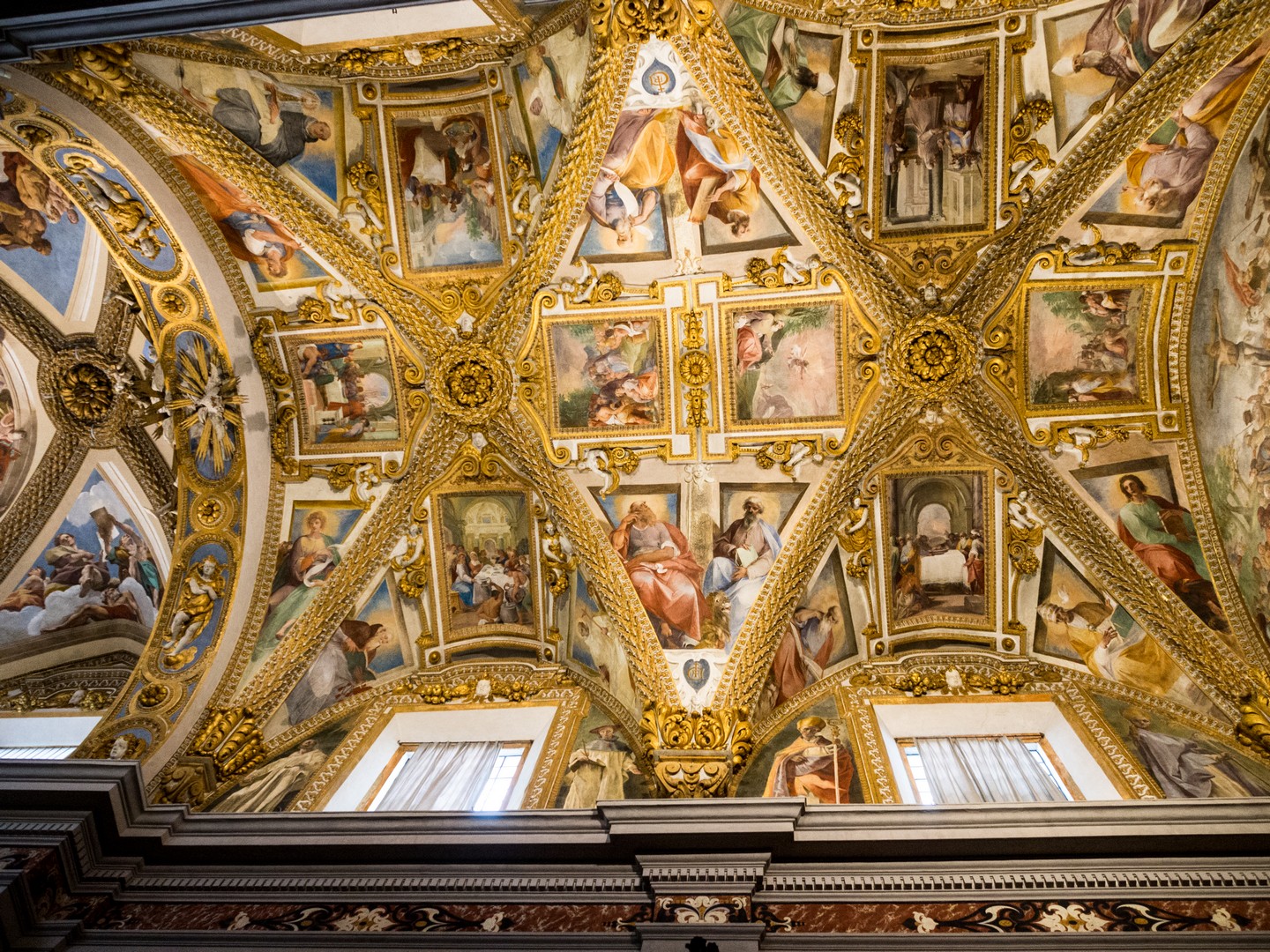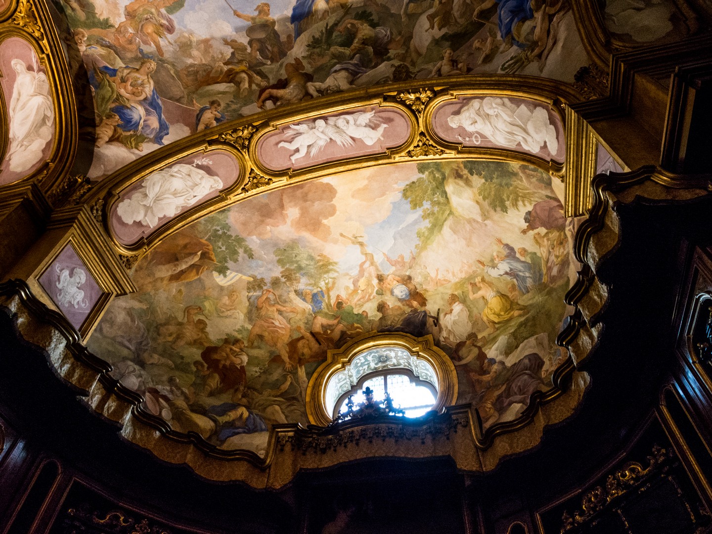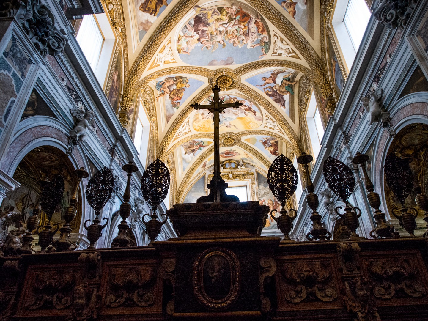 On commence par l’église, un véritable théâtre avec des motifs de marbre du sol presque au plafond ! S’il n’y en a pas là-haut, c’est tout simplement parce que le plafond entier est recouvert de peintures !