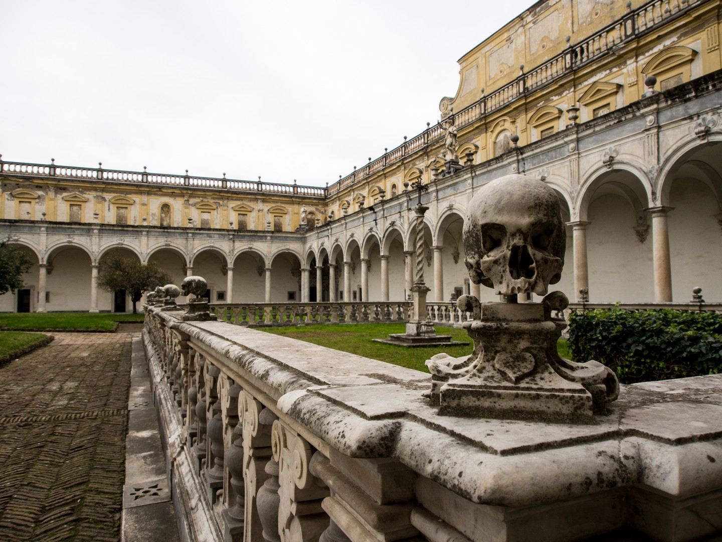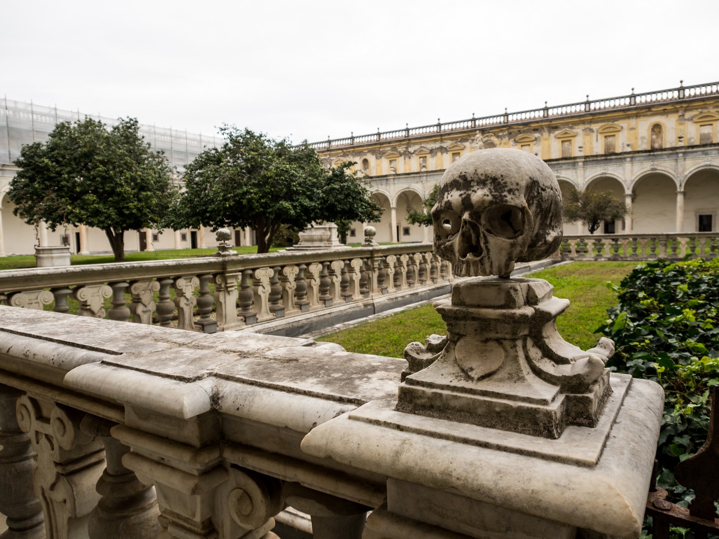La visite se termine par le grand cloître, lieu de méditation et d’enterrement pour les chartreux. Cette grande cour est entourée de galeries soutenues par des colonnes blanches et sur balustrades du cimetière, on y a parsemé des crânes en marbre, pour rappeler la fugacité de la vie et que d’où que soit leur provenance, les moines étaient égaux dans la mort.