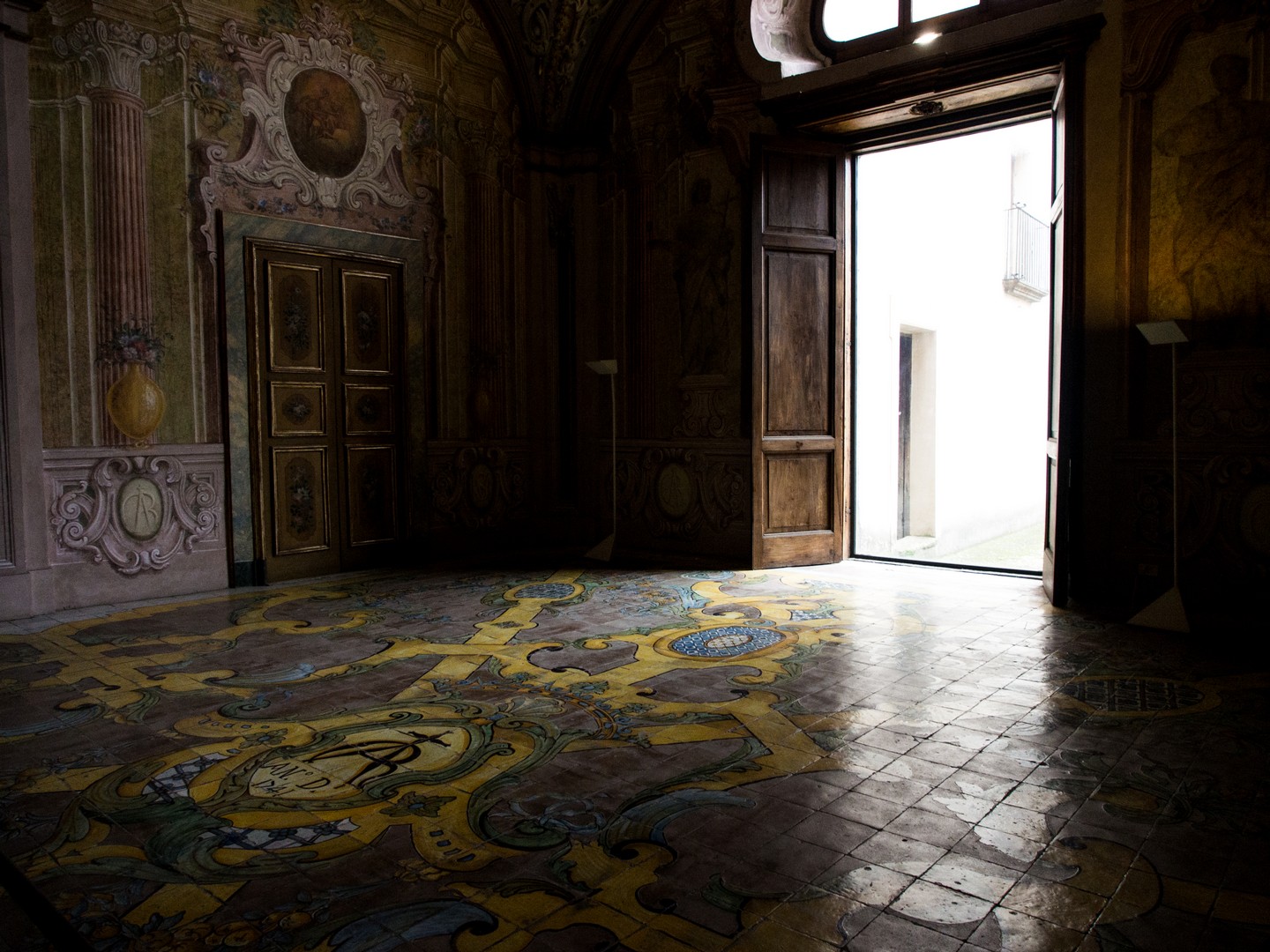 On découvre l’ancienne bibliothèque (fort sombre quand même pour ce genre de fonction) mais dont le sol est complètement recouvert de majolique.