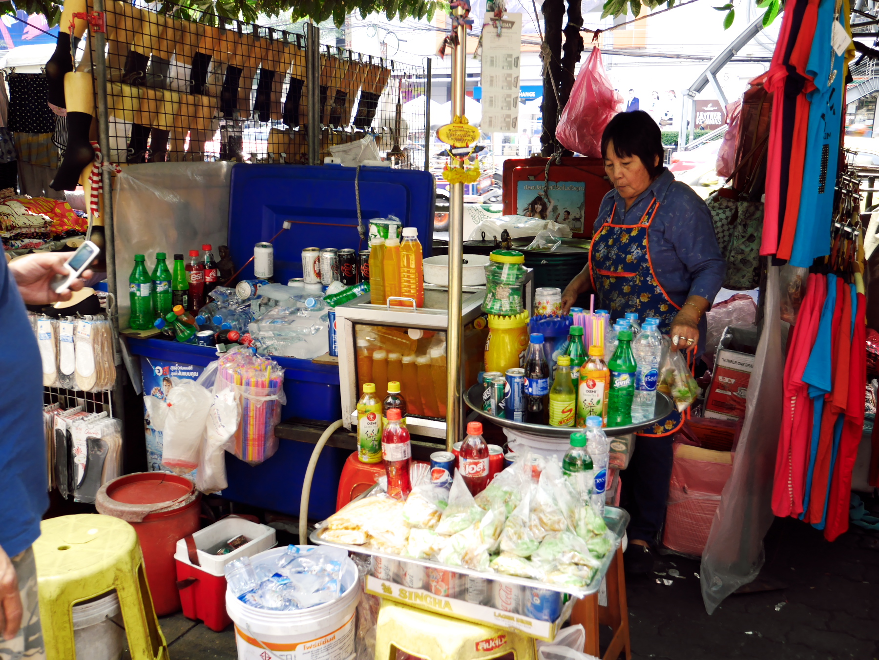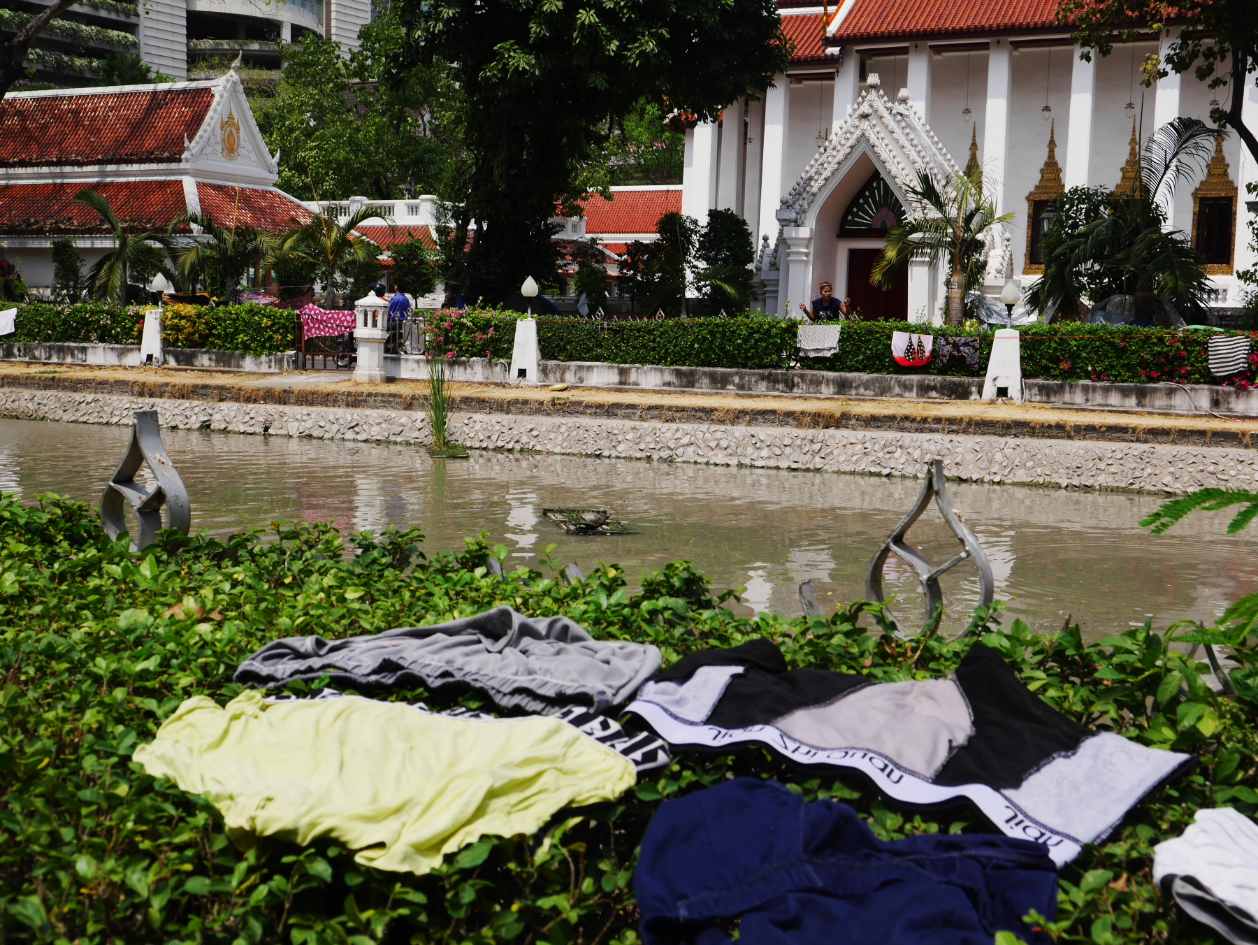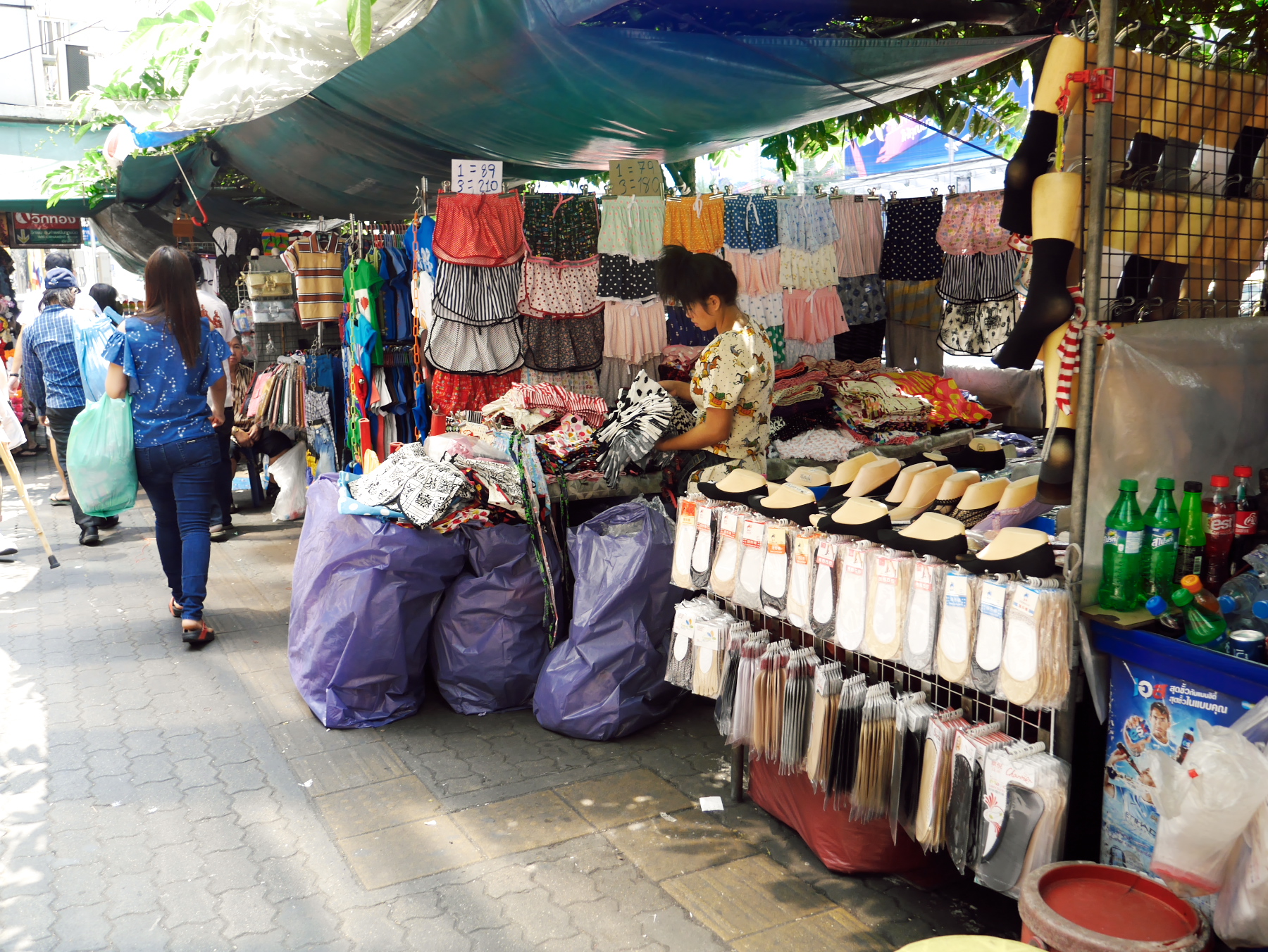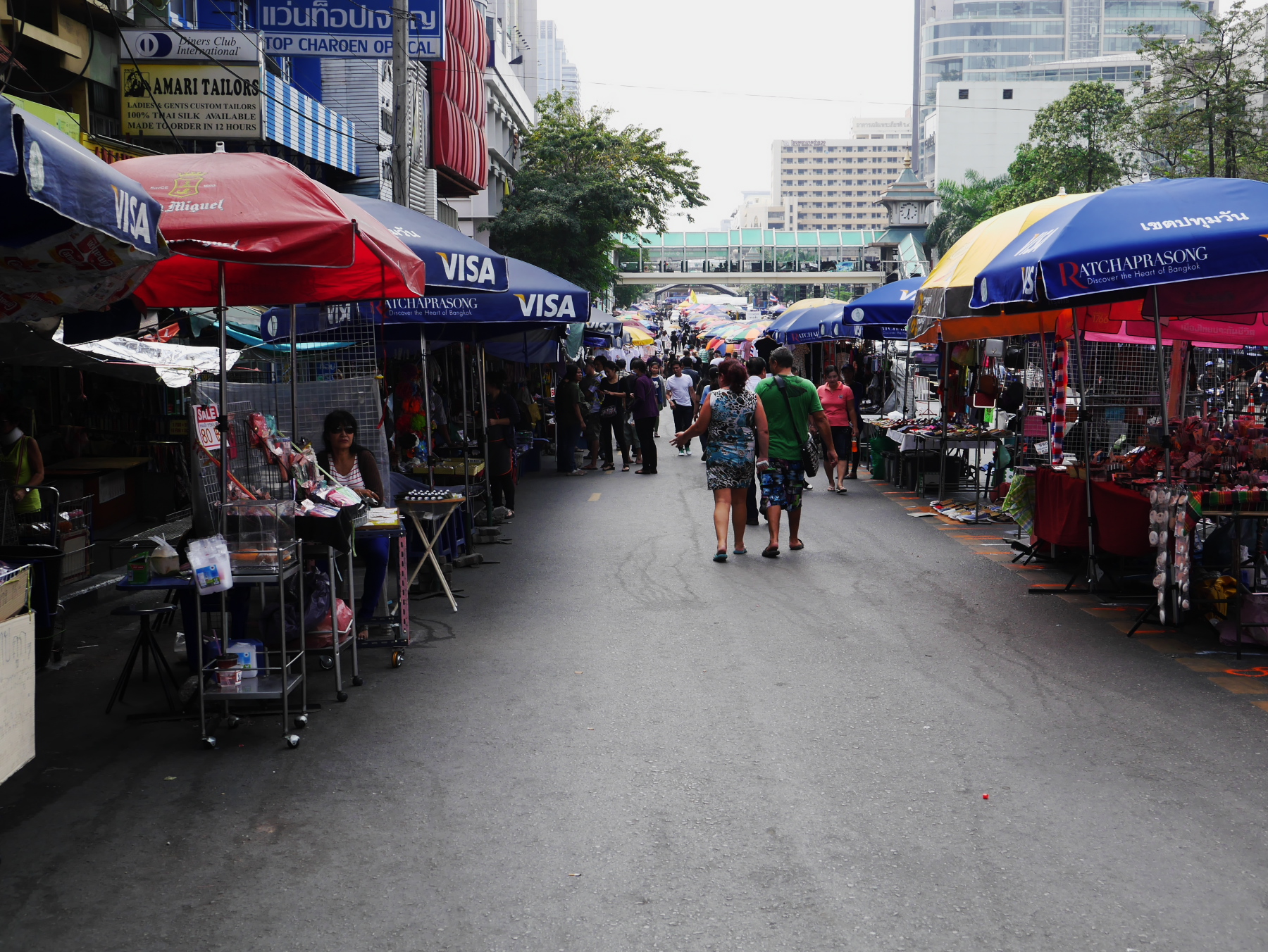 Pratunam est plein de vie. Le cœur du quartier, c’est avant tout son grand marché aux vêtements. Il y a le marché central sur Ratchathewi, que je n’ai pas eu l’occasion de voir mais le long de Petchaburi, la grande artère qui en forme la « frontière » sud, l’activité n’en est pas moins intense. En fait, on dirait même une extension du marché! Vendeur de t-shirts et de valises se disputent chaque morceau de trottoir (en alternance avec un marchand de fruit, ou un stand de nourriture). La circulation est intense et les trottoirs, bien étroits pour tout ce monde. Mais c’est Bangkok!