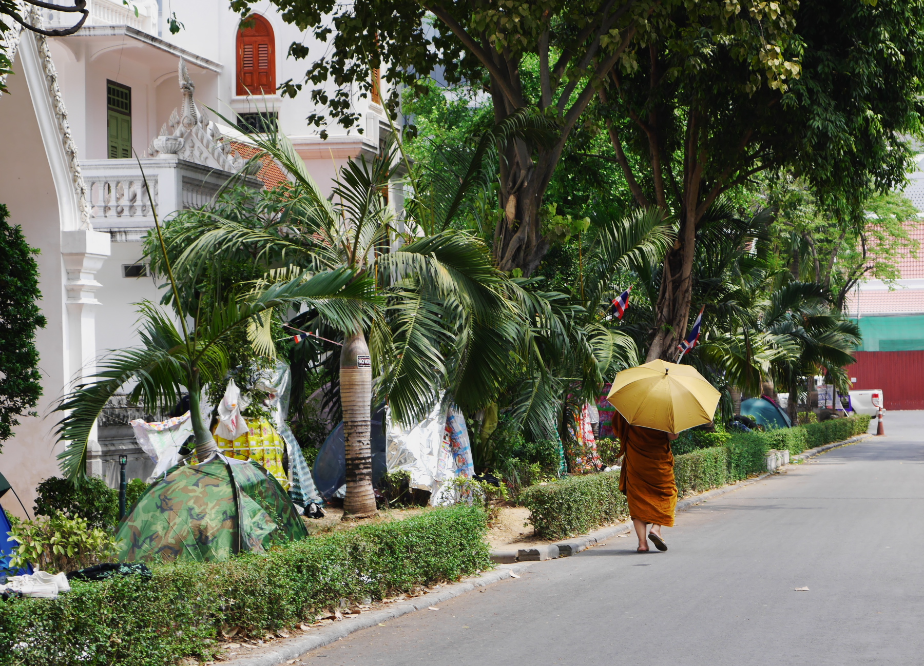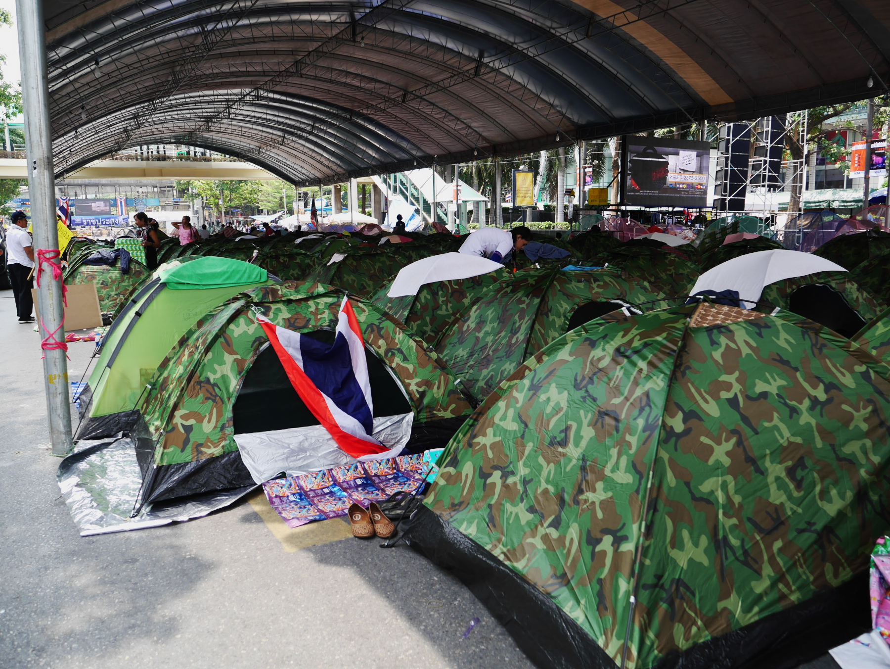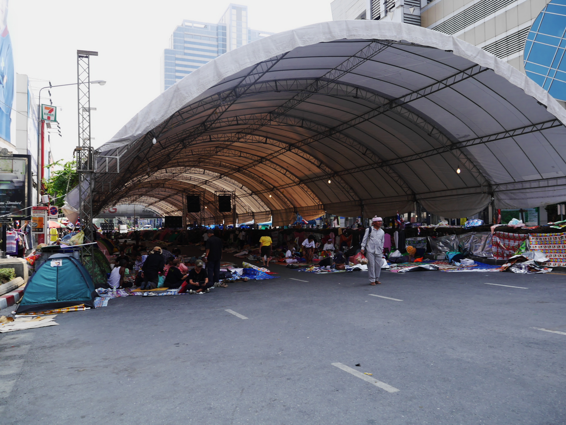Au fur et à mesure que l’on s’approche de Siam, les voitures disparaissent. Les rues sont mêmes bloquées et c’est là qu’apparaissent les premiers villages de tentes des protestataires Lorsque j’étais là, la contestation « anti-Yingluck Shinawatra » était sur la fin de son mouvement de plusieurs mois. Les « chemises jaunes », royalistes et plutôt urbaines, campaient et bloquaient le centre de Bangkok depuis des mois. Un accord avait été trouvé et dans les jours qui allaient suivre, le blocage allait être levé. On sait maintenant qu’il ne s’agissait que d’une accalmie. Mais pour le moment, j’entre dans le « village ». Les entrées sont gardées par des policiers plutôt relax, on me laisse passer sans à peine me regarder. Ce qui frappe quand on pénètre dans l’antre de la contestation, c’est l’ordre et le calme qui y règne. Les tentes sont disposées sous de grands auvents, pour les protéger du soleil, ou sous les ponts, comme ceux du Skytrain. On y trouve plusieurs infirmeries, les vendeurs de rues sont là pour nourrir tout ce petit monde et à chaque implantation, des écrans géants relaient les discours des leaders politiques qui se passe un peu plus loin, tout à côté de Siam Square sur une scène comparable à celle qu’on pourrait installer pour un concert (écran géants compris). Je n’ai jamais vu un mouvement d’opposition à qui on laissait autant de latitude pour protester. Je me demande aussi d’où vient tout cet argent pour financer tout ce mouvement. Peut-être en partie de la vente des t-shirts « Restart Thailand » ? Lesquels sont légitimes, et lesquels ne sont en fait des petits malins ayant trouvé une manne financière.