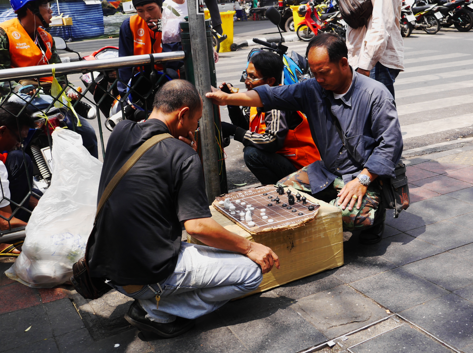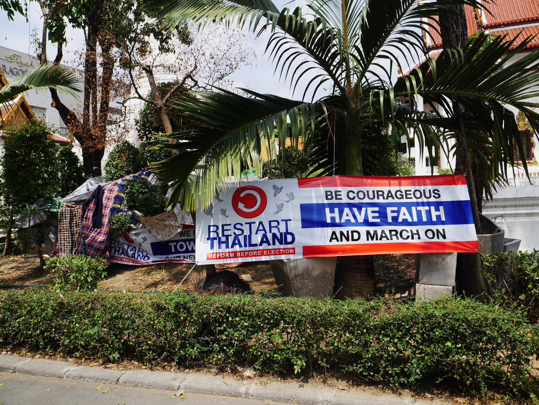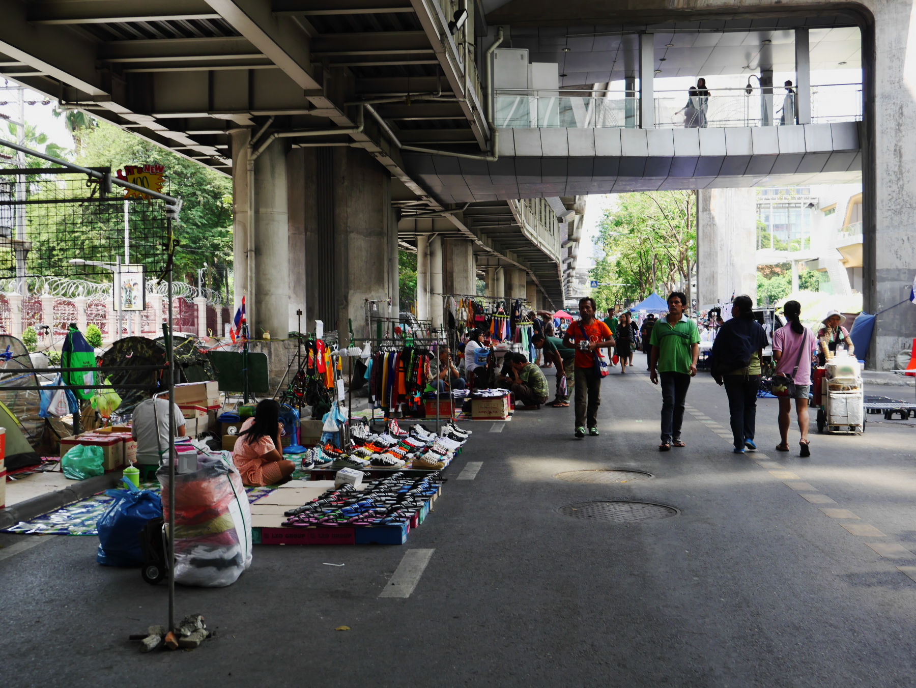 Au fur et à mesure que l’on s’approche de Siam, les voitures disparaissent. Les rues sont mêmes bloquées et c’est là qu’apparaissent les premiers villages de tentes des protestataires Lorsque j’étais là, la contestation « anti-Yingluck Shinawatra » était sur la fin de son mouvement de plusieurs mois. Les « chemises jaunes », royalistes et plutôt urbaines, campaient et bloquaient le centre de Bangkok depuis des mois. Un accord avait été trouvé et dans les jours qui allaient suivre, le blocage allait être levé. On sait maintenant qu’il ne s’agissait que d’une accalmie. Mais pour le moment, j’entre dans le « village ». Les entrées sont gardées par des policiers plutôt relax, on me laisse passer sans à peine me regarder. Ce qui frappe quand on pénètre dans l’antre de la contestation, c’est l’ordre et le calme qui y règne. Les tentes sont disposées sous de grands auvents, pour les protéger du soleil, ou sous les ponts, comme ceux du Skytrain. On y trouve plusieurs infirmeries, les vendeurs de rues sont là pour nourrir tout ce petit monde et à chaque implantation, des écrans géants relaient les discours des leaders politiques qui se passe un peu plus loin, tout à côté de Siam Square sur une scène comparable à celle qu’on pourrait installer pour un concert (écran géants compris). Je n’ai jamais vu un mouvement d’opposition à qui on laissait autant de latitude pour protester. Je me demande aussi d’où vient tout cet argent pour financer tout ce mouvement. Peut-être en partie de la vente des t-shirts « Restart Thailand » ? Lesquels sont légitimes, et lesquels ne sont en fait des petits malins ayant trouvé une manne financière.