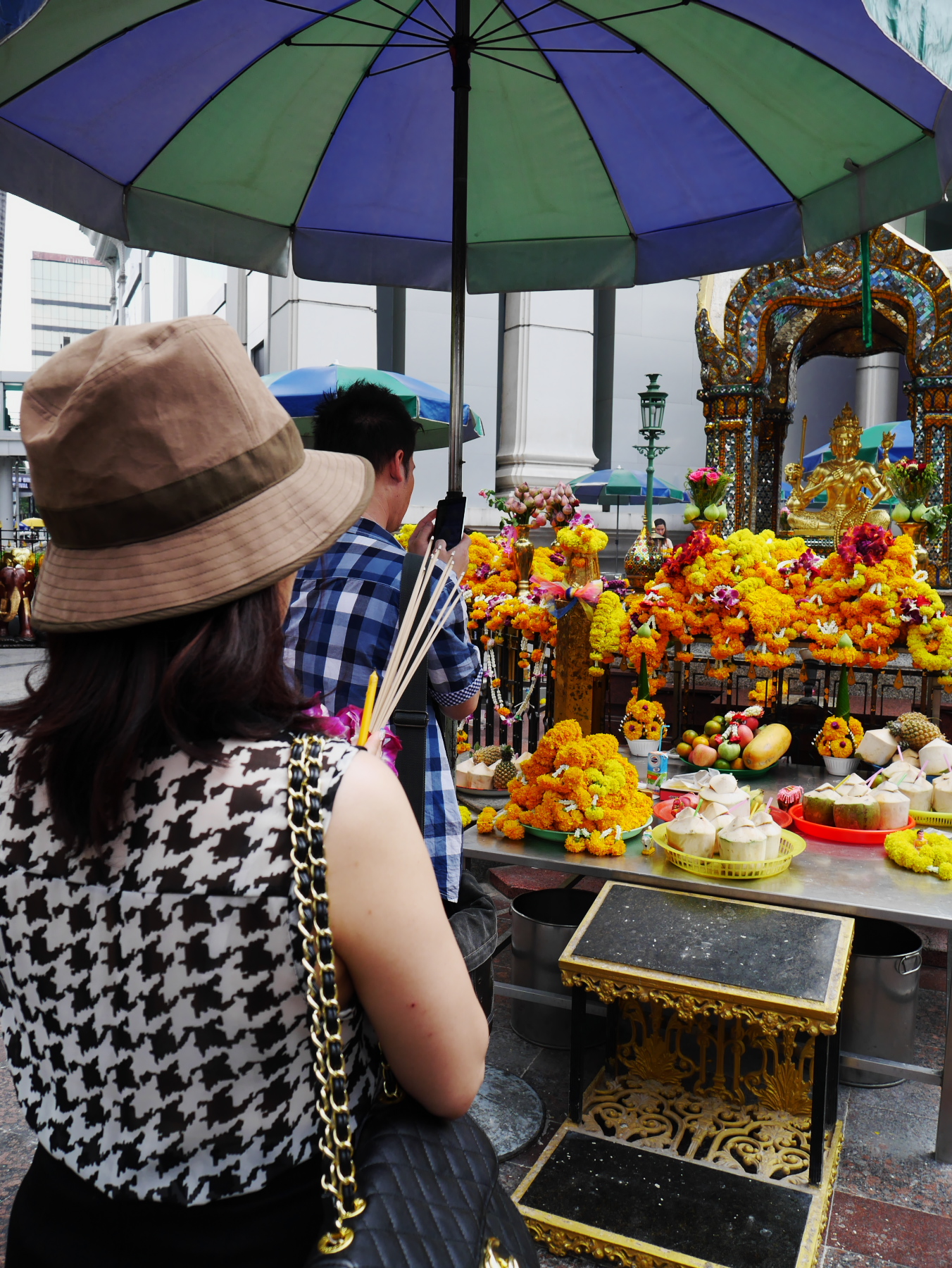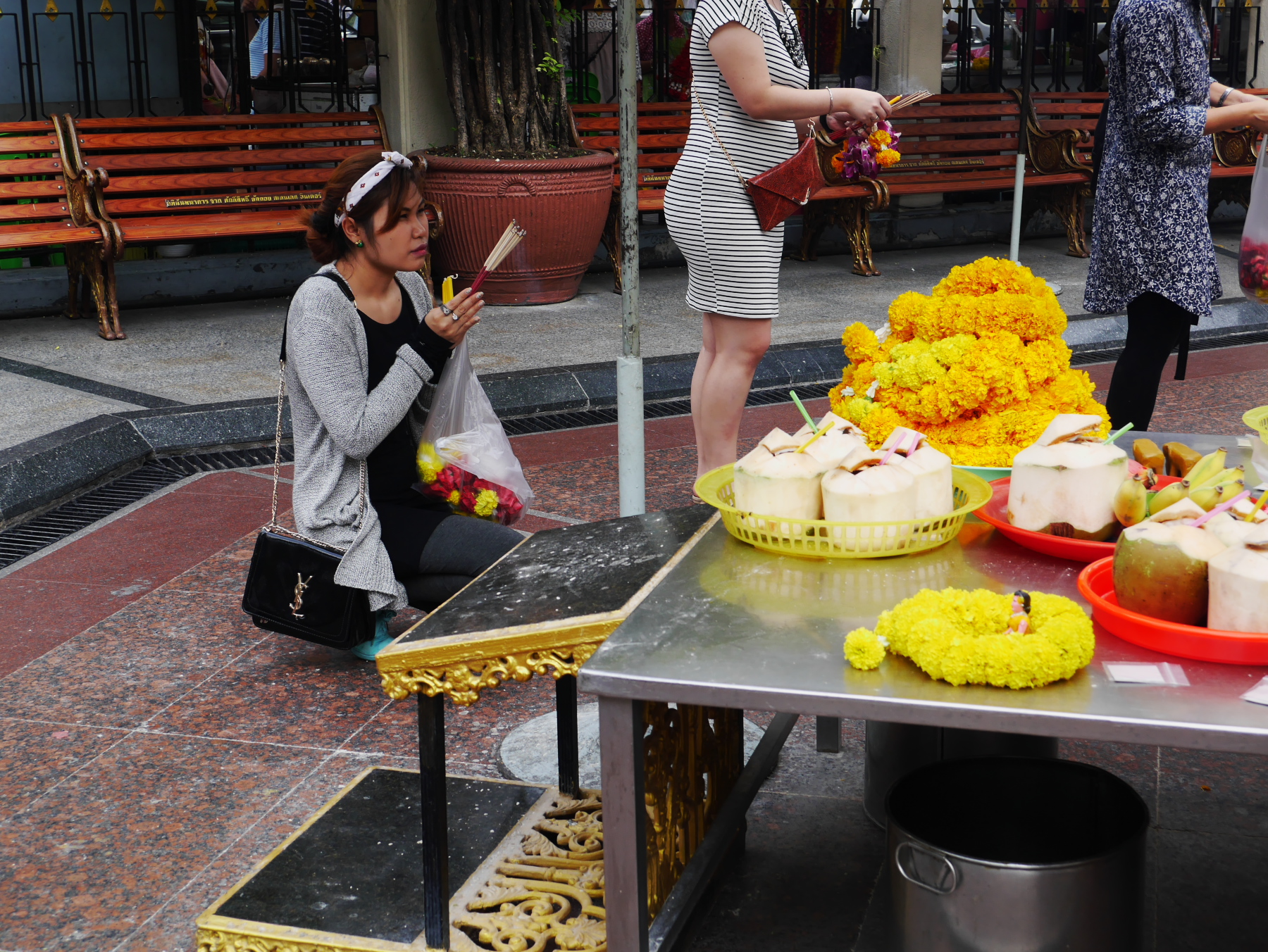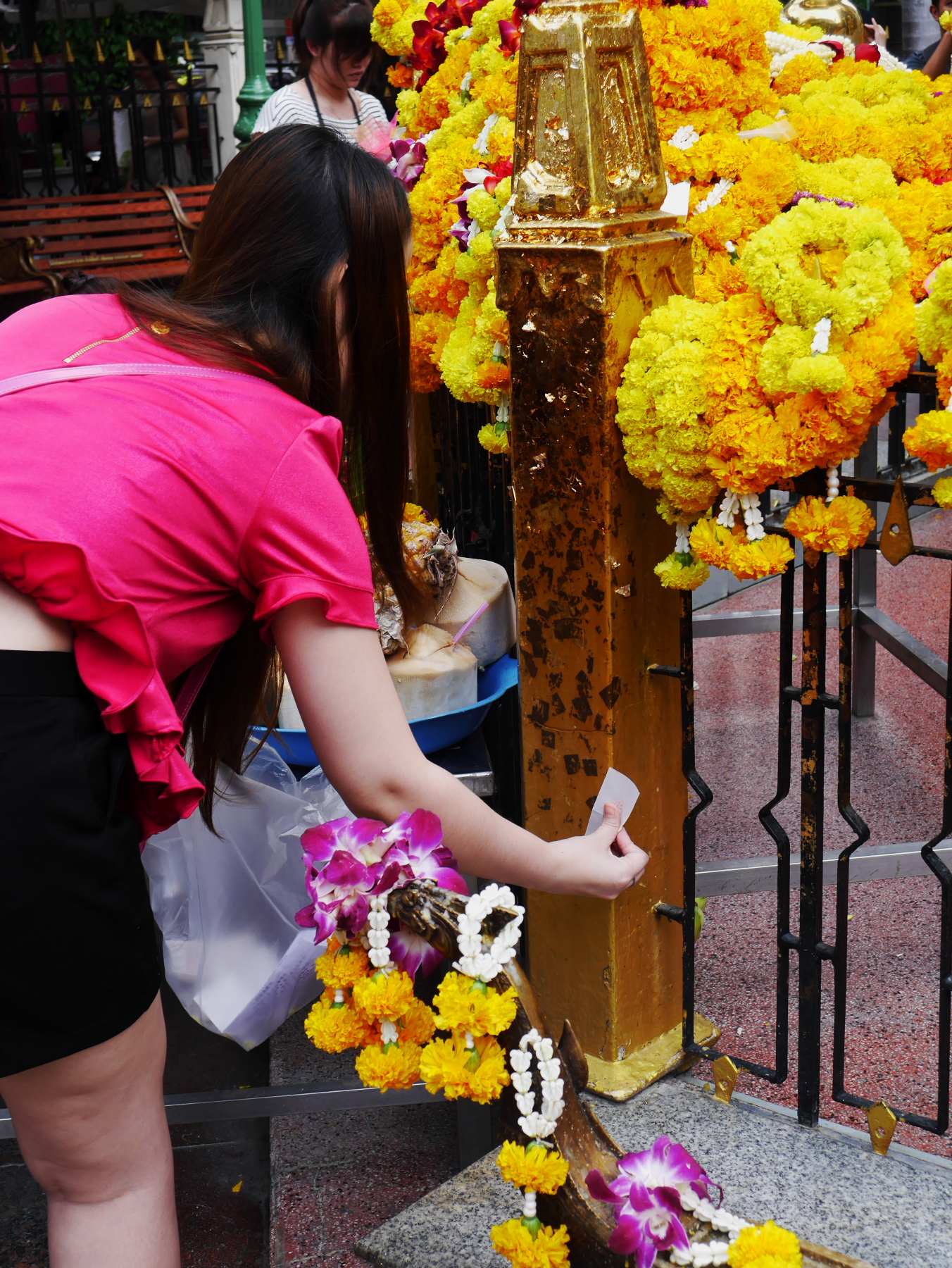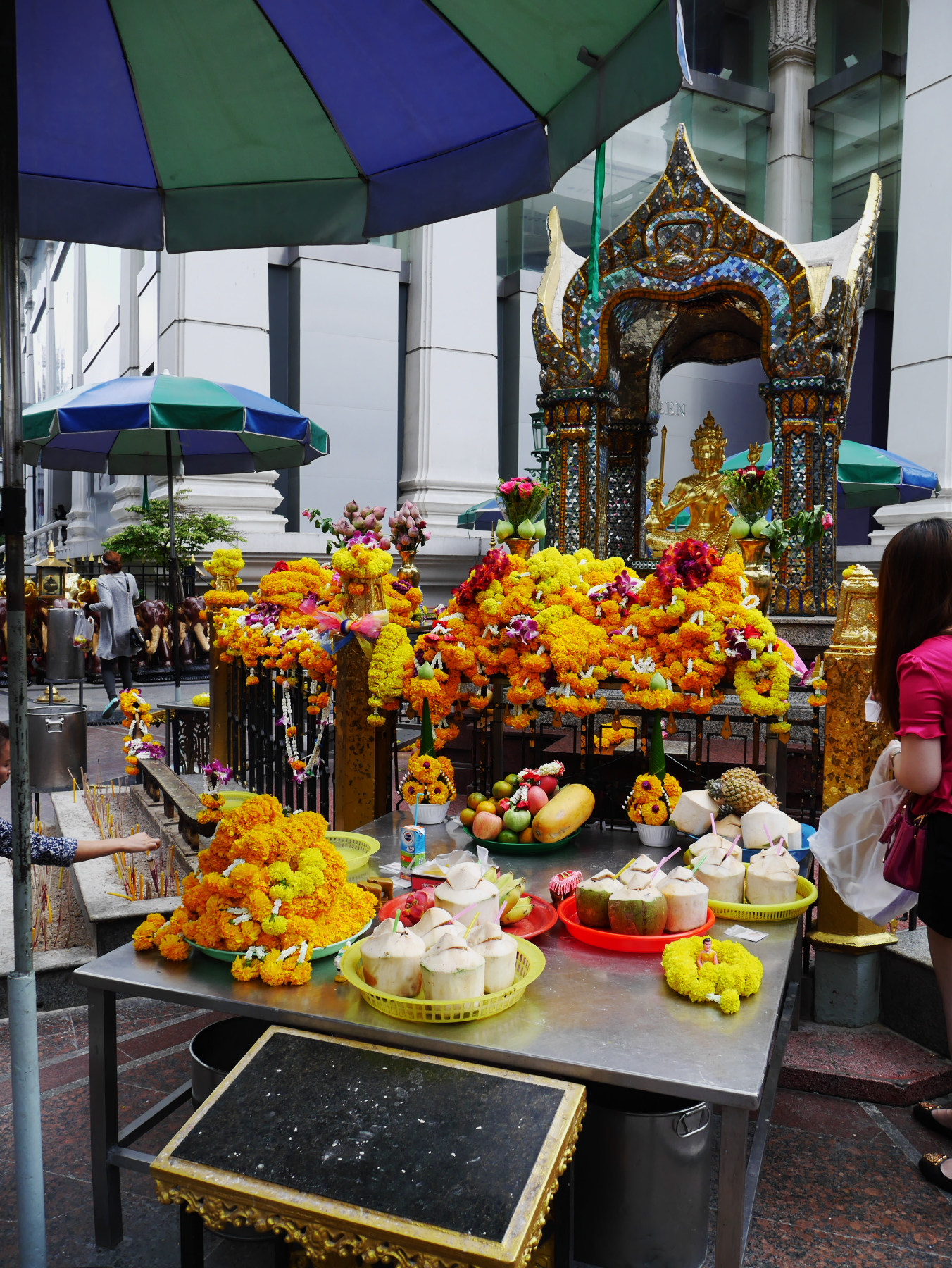 Premier arrêt: le Sanctuaire d’Erawan, un autel dédié à Brahmā, le dieu hindou au quatre visages que les Thaïs viennent honorer. L’ambiance est surprenante ! Nous sommes en plein air, au beau milieu de l’agitation urbaine mais pourtant, le recueillement est de mise, profond, sincère. Des jeunes filles en robes fleuries côtoient de vieilles dames modestes, d’élégantes dames prient à côté des vendeurs de rue venus s’attirer la bonne fortune pour la journée. Cet autel, c’est un peu le grand égalisateur social, pour quelques minutes dans la vie de ces habitants. Je fais fi des conseils qui veut qu’on ne doit pas acheter ses offrandes à côté du temple (les prix sont gonflés) et choisis un collier de fleurs et des bougies. Je prend un moment pour réfléchir. Réfléchir à mon parcours, réfléchir à la chance que j’ai d’être ici et de vivre ce moment, les images de ce début d’année, de tous les paysages déjà vus, de toutes les rencontres déjà faîtes défilent à toute vitesse et une espèce de gratitude envers tout et tous commence à m’envahir. Moment suspendu pendant lequel je vais me sentir en accord avec le monde. Ca fait deux fois que la Thaïlande m’offre un pareil moment.