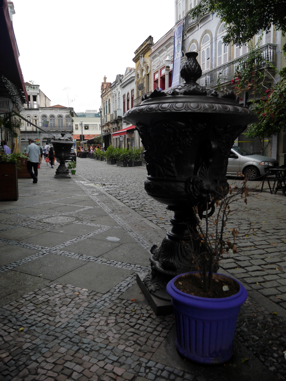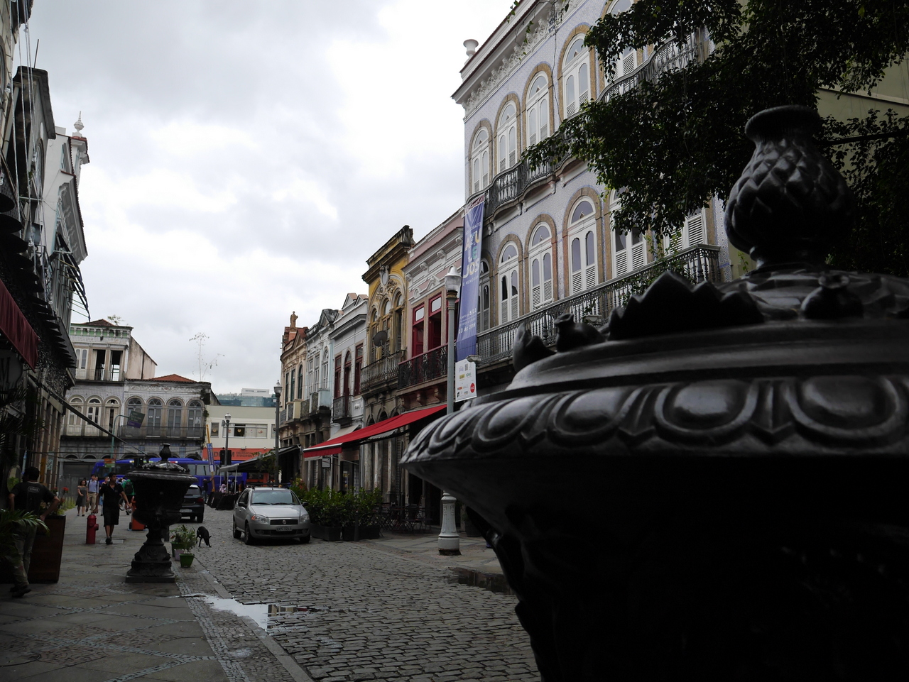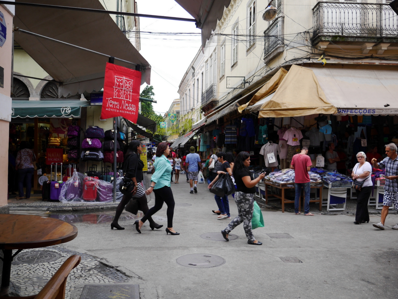 De là, on peut rejoindre la Praça Tiradentes, un espace assez imposant avec une fontaine centrale représentant les grands fleuves du Brésil. Je l’ai trouvé un peu solennelle et inhospitalière et ai préfère aller perdre dans les petites rues commerçantes du centre. Nous sommes vendredi après-midi et il semble que tout Rio soit venu faire son shopping ! Une foule de petites boutiques se suivent, les unes après les autres, dans de vieilles bâtisses du XIX-XXe siècles, qui semblent avoir connus de meilleurs jours. C’est sans doute ce mélange de grandeur et décadence qui fait le charme du vieux centre de Rio… et le fait qu’on puisse être au plus près des Cariocas, même si on ne les comprend pas.