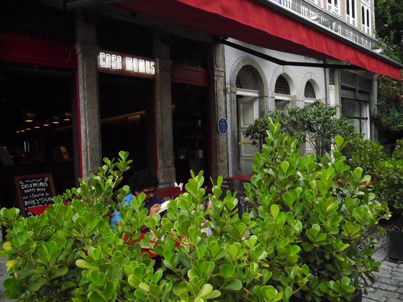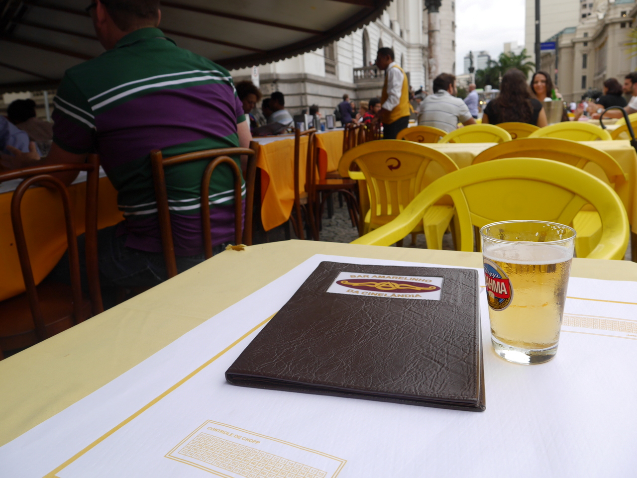 A partir de là, je décide de rejoindre mon point de départ, la Praça Floriano, pour rejoindre les Cariocas qui prennent l’apéritif. Les cafés sont bondés, mais je déniche une place au Café Amarellinho (qu’on ne peut pas louper avec son enseigne jaune). Enfin, la première « choppe » (à prononcer « choppi ») du voyage. Je peux prendre un peu de temps pour moi… avant d’être rejoins par un groupe de Québecois, tous au-dessus de la cinquantaine, et qui terminent ici un voyage de bénévolat à travers l’Amérique latine, tout contents d’être à Rio. Ils seront ma première rencontre de voyage, en espérant qu’ils en aient beaucoup d’autres !