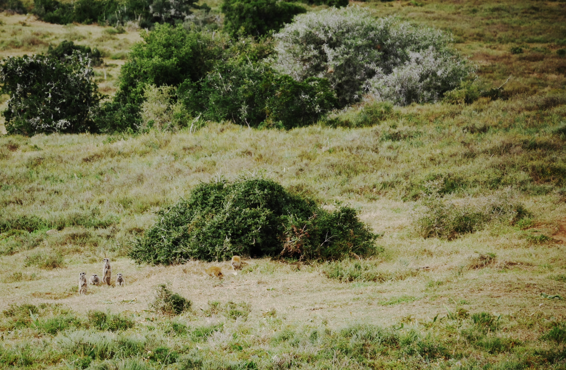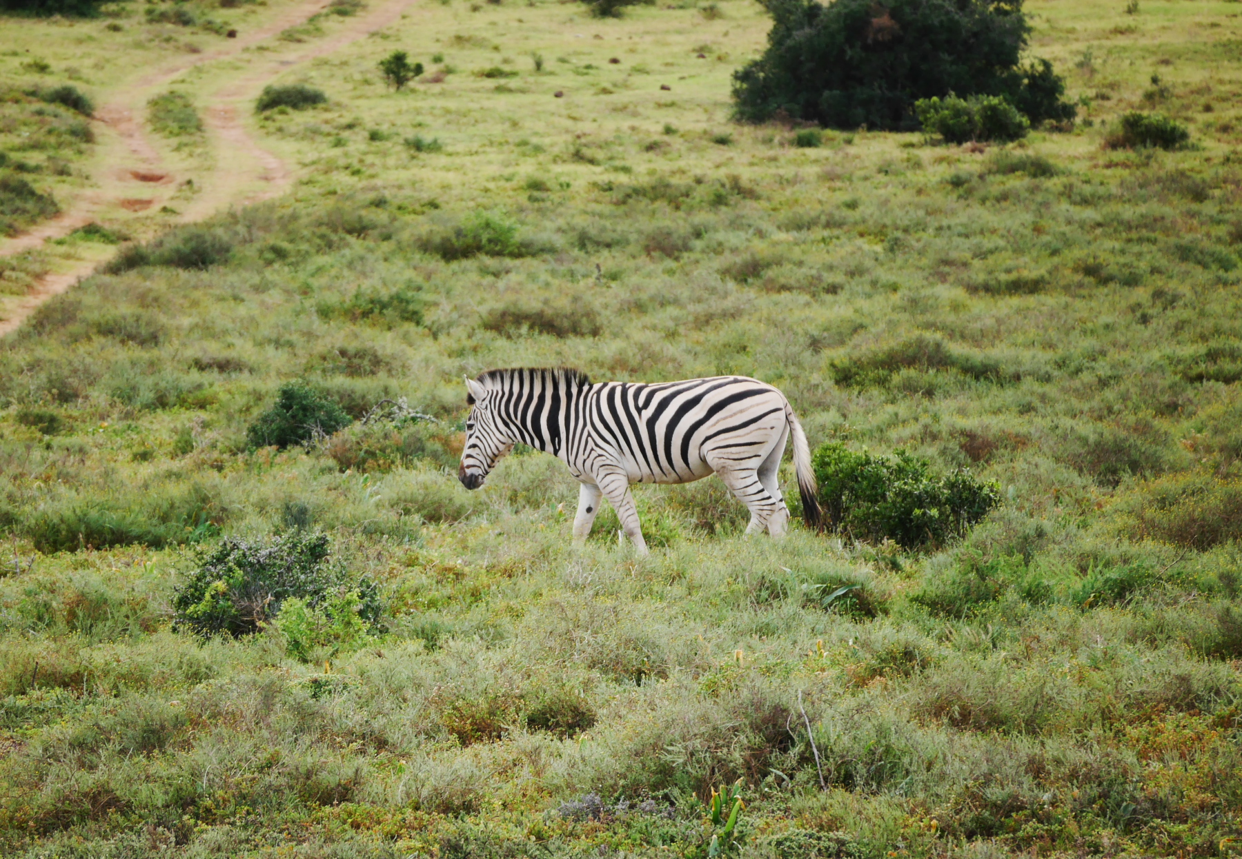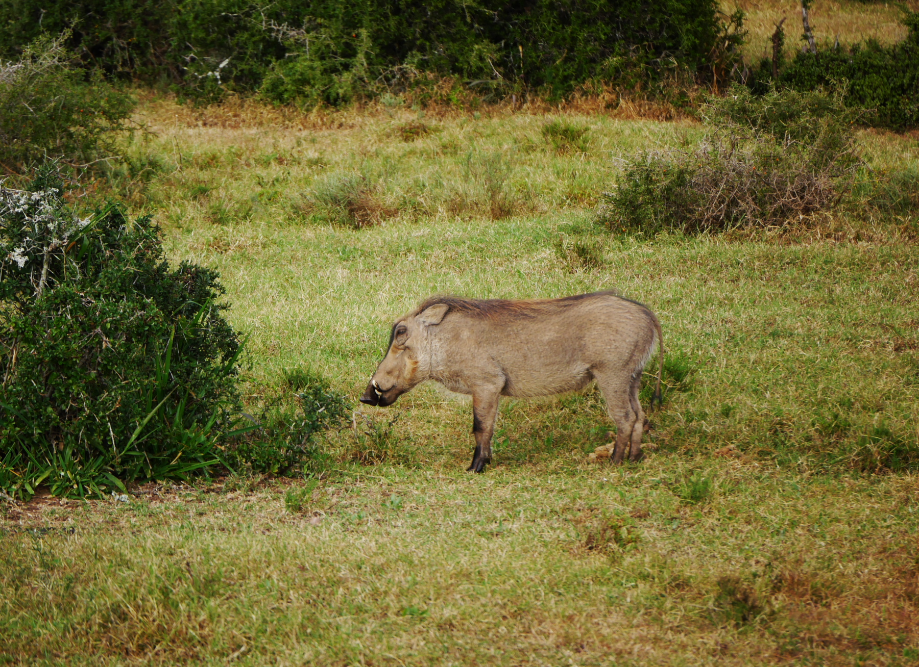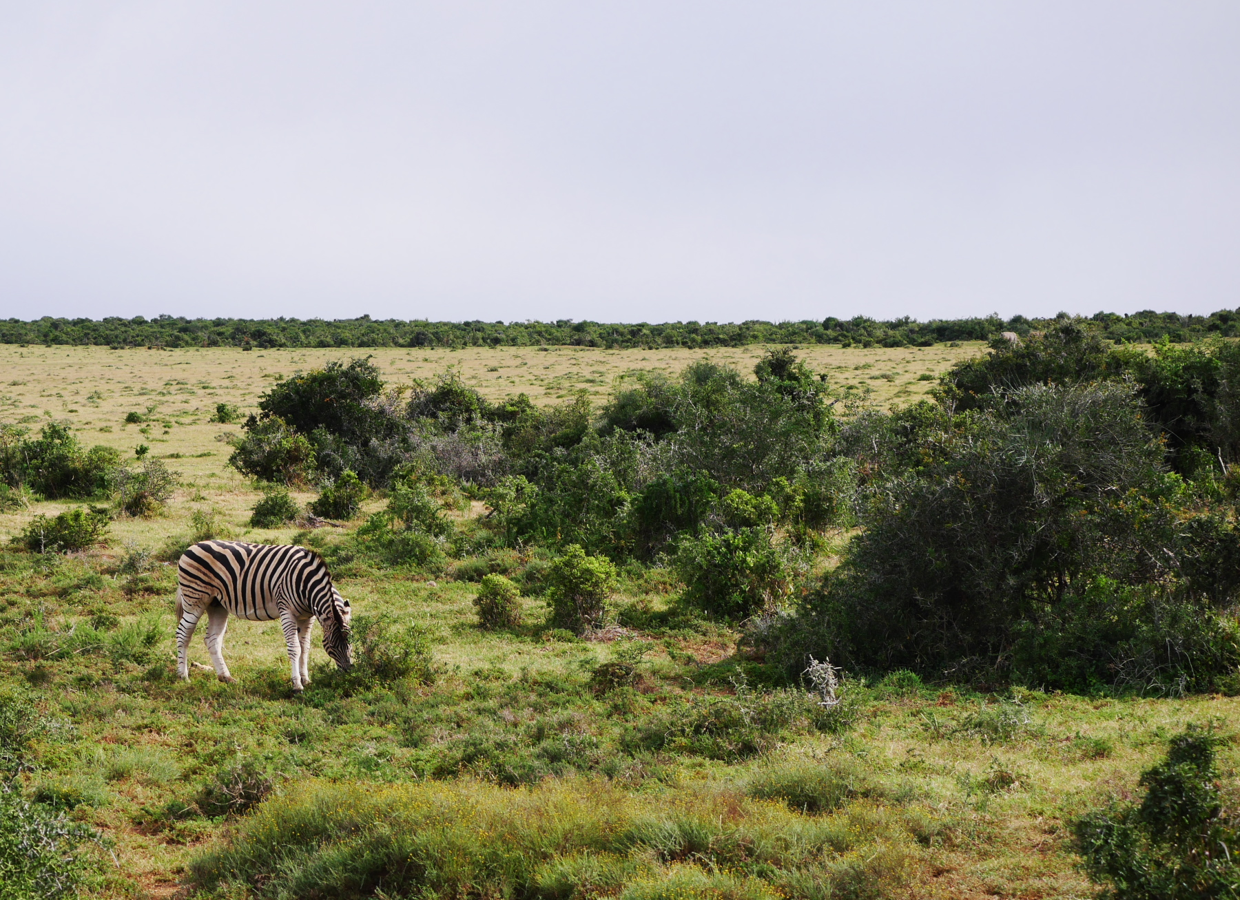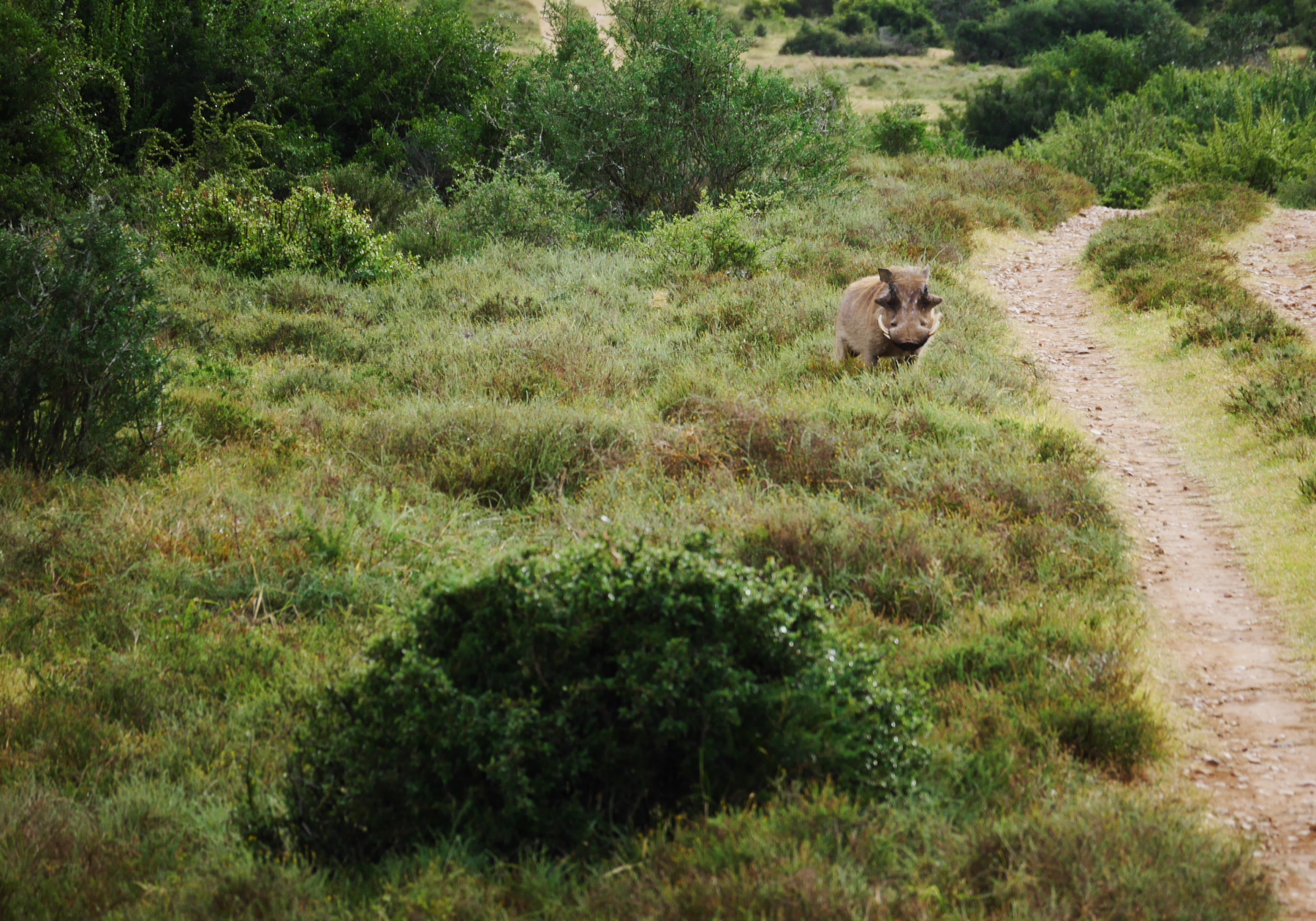 Après le petit arrêt réglementaire à l’entrée du parc, nos deux bus s’avancent pour commencer un tour de deux heures… La pluie s’est arrêtée pour le moment, mais il est déjà un peu tard dans la matinée (les animaux sont mieux visibles peu après le lever et un peu avant le coucher du soleil). Les premiers à se montrer sont les phacochères, jamais spécialement farouches, cette espèce de croisement entre le cochon et le sanglier est probablement l’animal le plus courant dans le parc. Suivent quelques inévitables kudus (l’antilope qui est l’emblème des parc nationaux sudafricains), quelques bubales roux, une colonie de suricates faisant copain-copain avec une mangouste dorée, un buffle du Cap solitaire (alors qu’ils sont plutôt en troupeau, bizarre) et, à ma grande joie, plusieurs troupeaux de zèbres, que je n’avais pas vu lors de ma première visite. Mais d’éléphants, point ! Ou si. Un mâle, de loin.