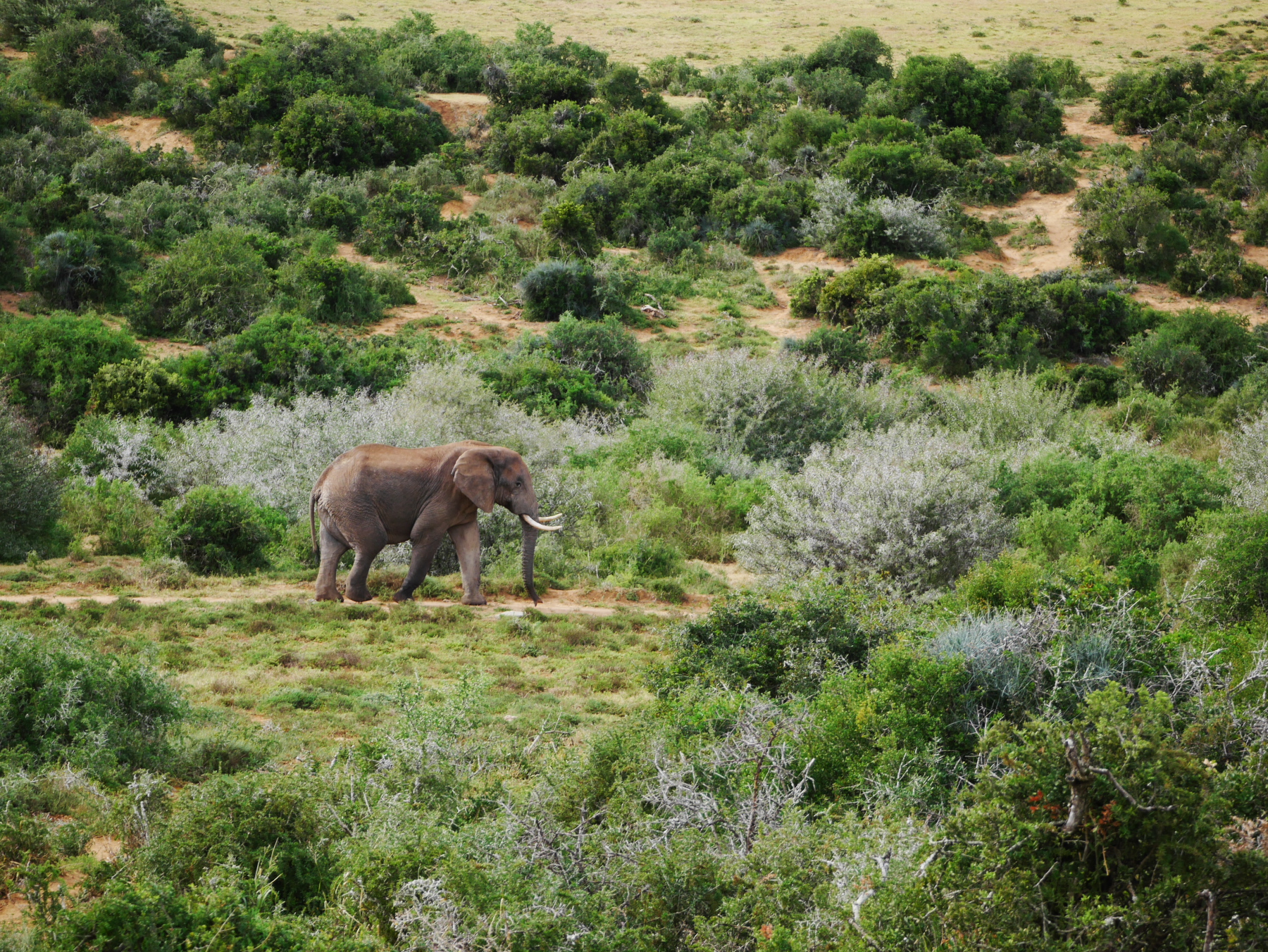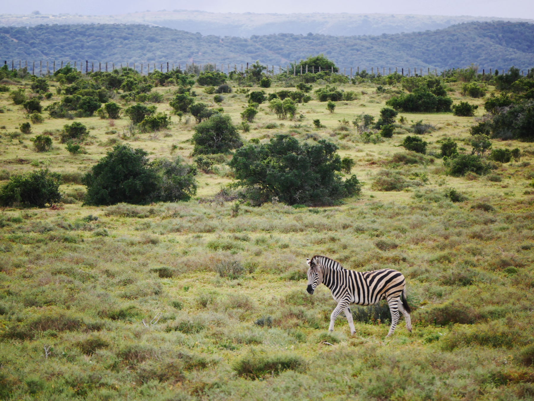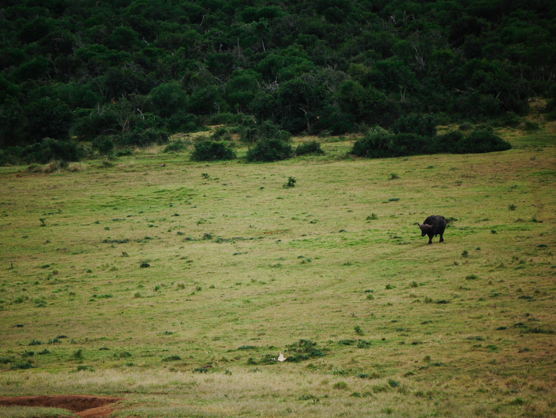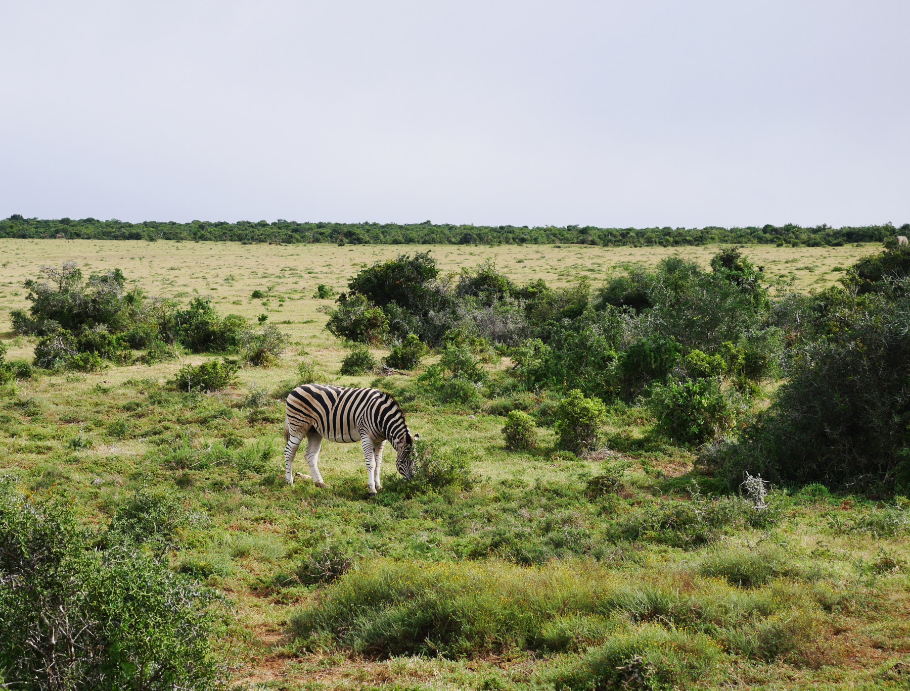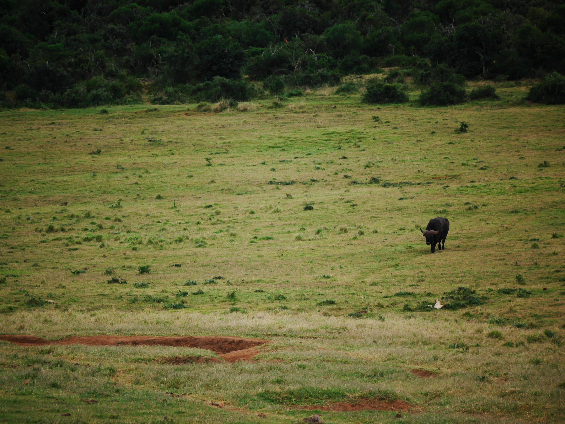 Après le petit arrêt réglementaire à l’entrée du parc, nos deux bus s’avancent pour commencer un tour de deux heures… La pluie s’est arrêtée pour le moment, mais il est déjà un peu tard dans la matinée (les animaux sont mieux visibles peu après le lever et un peu avant le coucher du soleil). Les premiers à se montrer sont les phacochères, jamais spécialement farouches, cette espèce de croisement entre le cochon et le sanglier est probablement l’animal le plus courant dans le parc. Suivent quelques inévitables kudus (l’antilope qui est l’emblème des parc nationaux sudafricains), quelques bubales roux, une colonie de suricates faisant copain-copain avec une mangouste dorée, un buffle du Cap solitaire (alors qu’ils sont plutôt en troupeau, bizarre) et, à ma grande joie, plusieurs troupeaux de zèbres, que je n’avais pas vu lors de ma première visite. Mais d’éléphants, point ! Ou si. Un mâle, de loin.