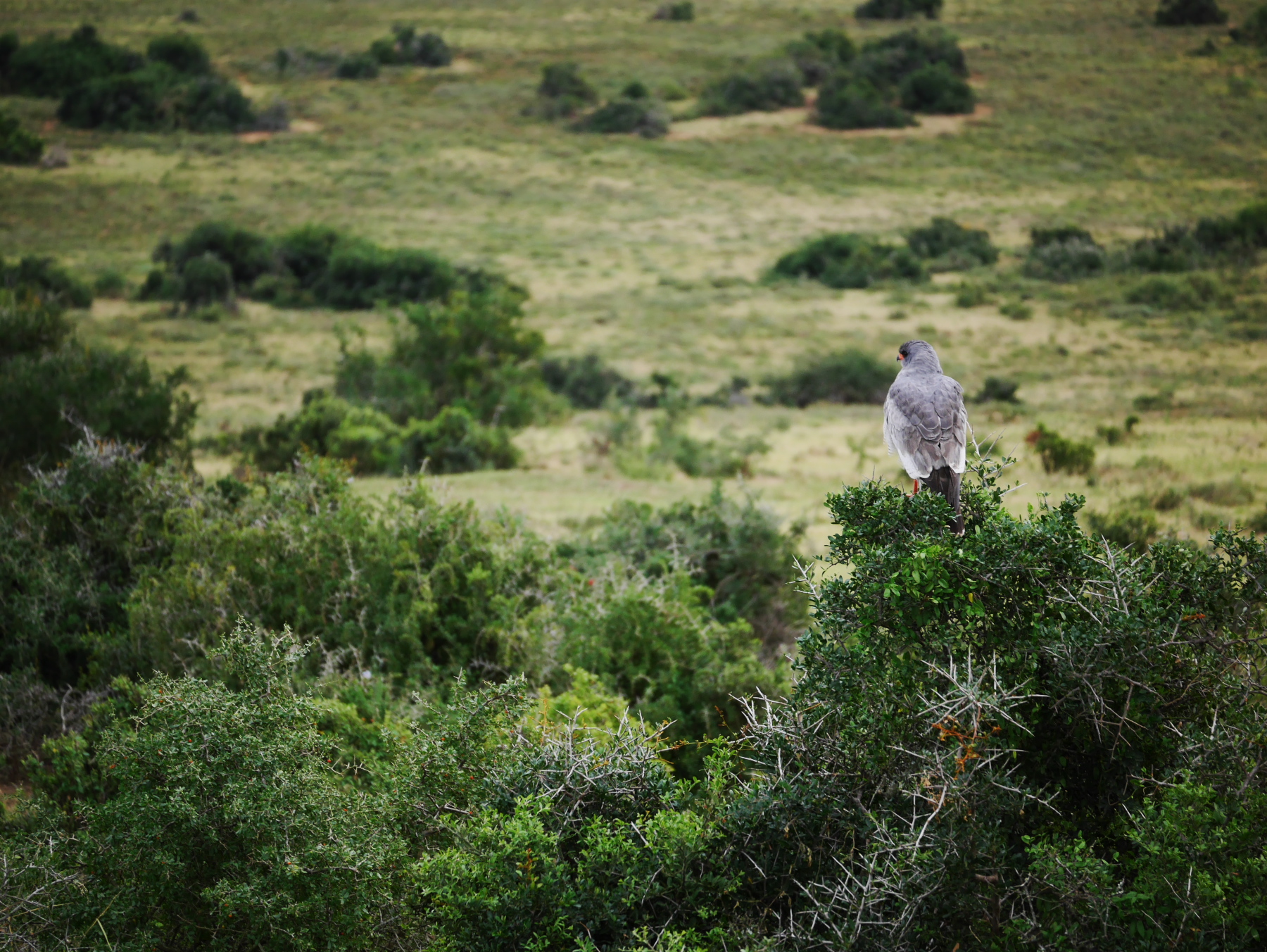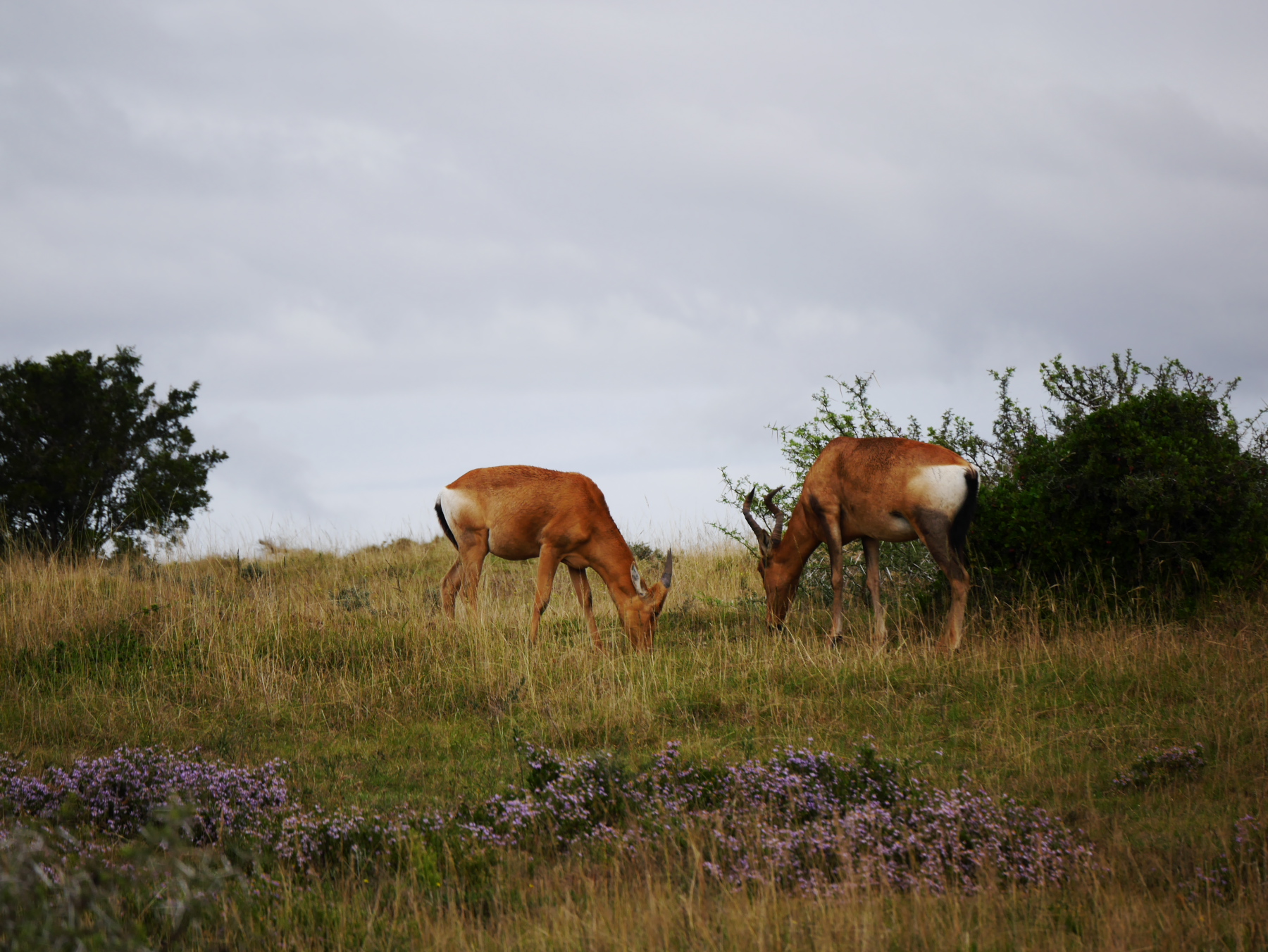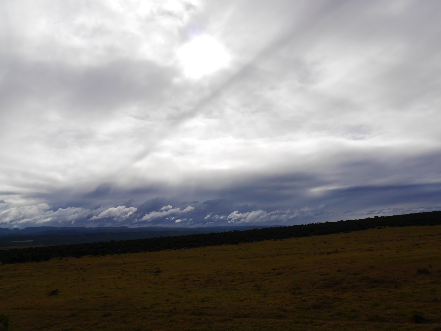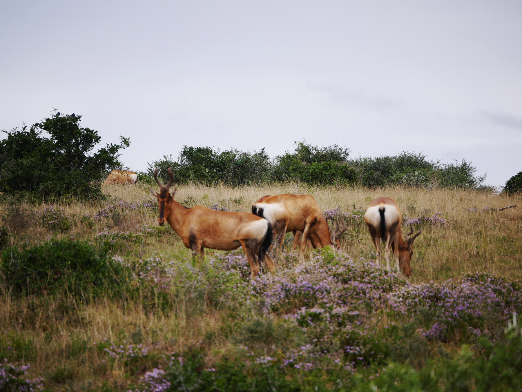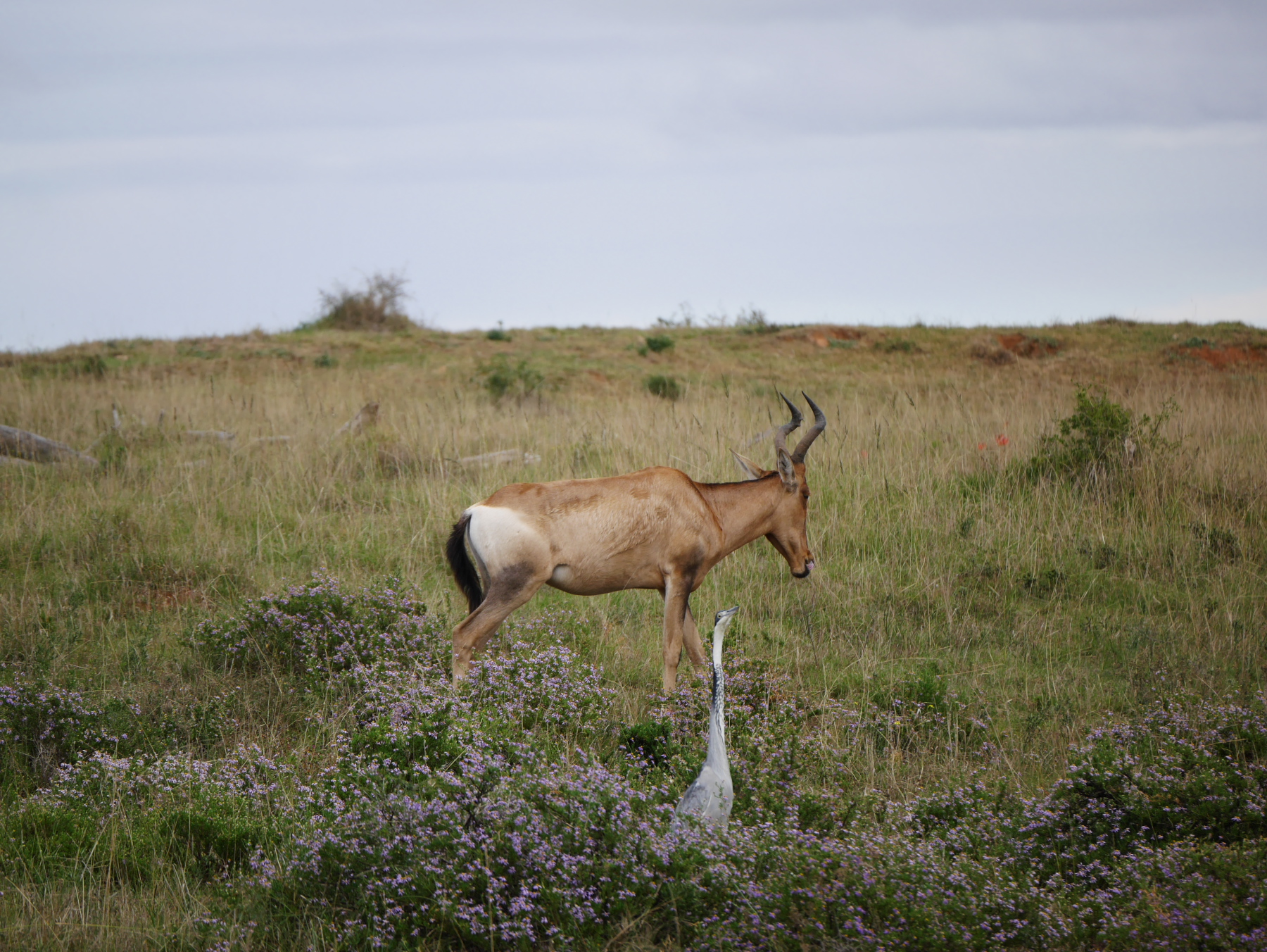 Après le petit arrêt réglementaire à l’entrée du parc, nos deux bus s’avancent pour commencer un tour de deux heures… La pluie s’est arrêtée pour le moment, mais il est déjà un peu tard dans la matinée (les animaux sont mieux visibles peu après le lever et un peu avant le coucher du soleil). Les premiers à se montrer sont les phacochères, jamais spécialement farouches, cette espèce de croisement entre le cochon et le sanglier est probablement l’animal le plus courant dans le parc. Suivent quelques inévitables kudus (l’antilope qui est l’emblème des parc nationaux sudafricains), quelques bubales roux, une colonie de suricates faisant copain-copain avec une mangouste dorée, un buffle du Cap solitaire (alors qu’ils sont plutôt en troupeau, bizarre) et, à ma grande joie, plusieurs troupeaux de zèbres, que je n’avais pas vu lors de ma première visite. Mais d’éléphants, point ! Ou si. Un mâle, de loin.