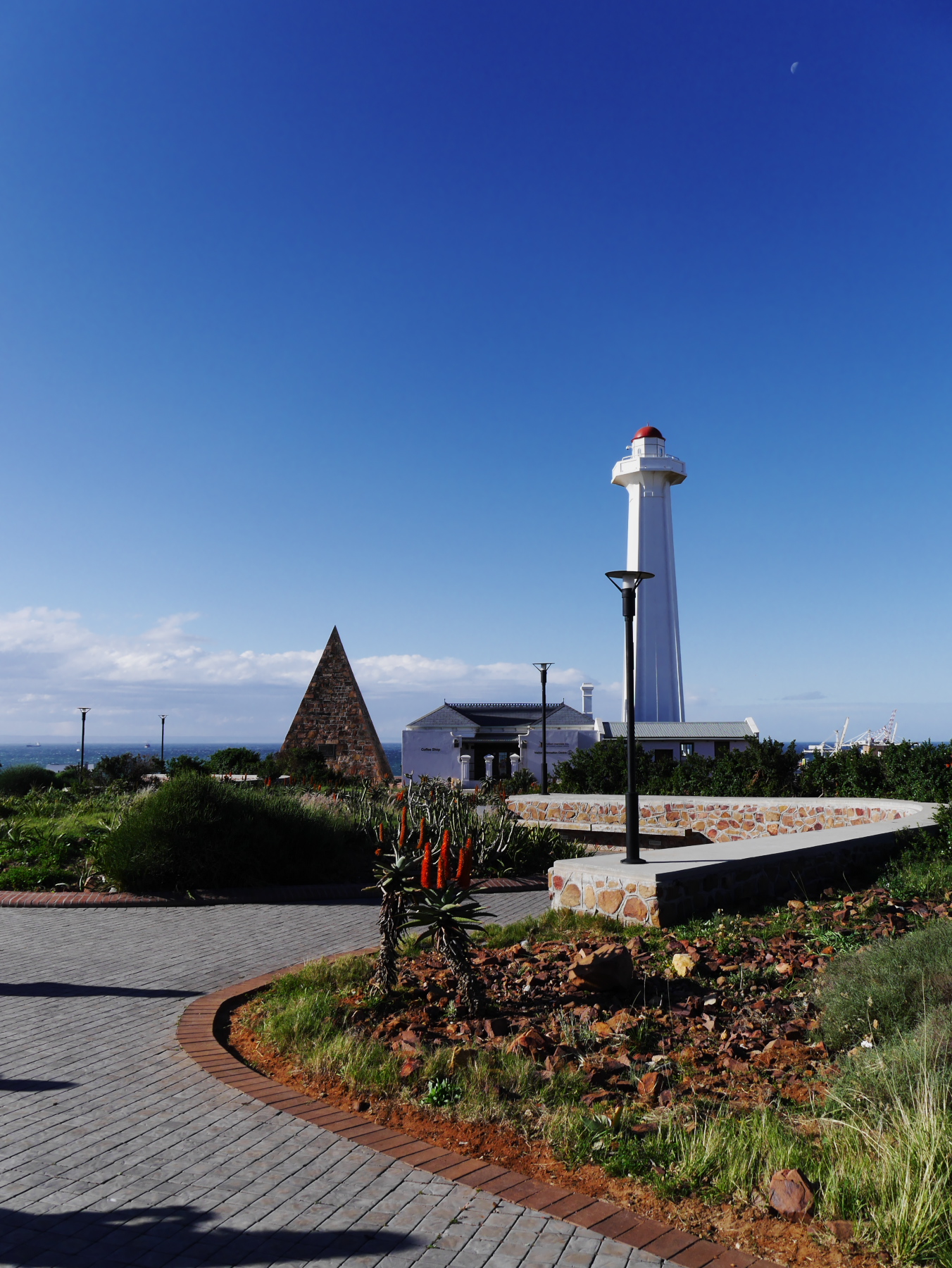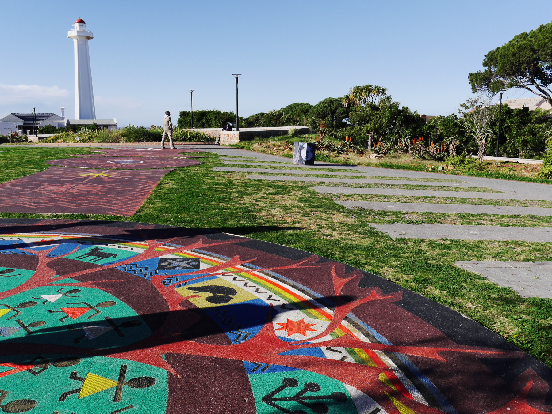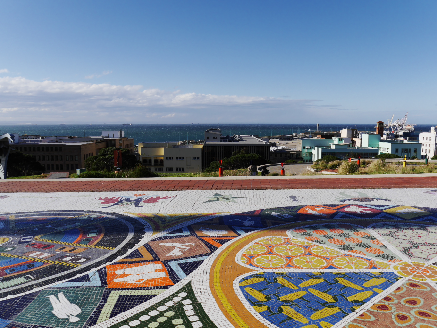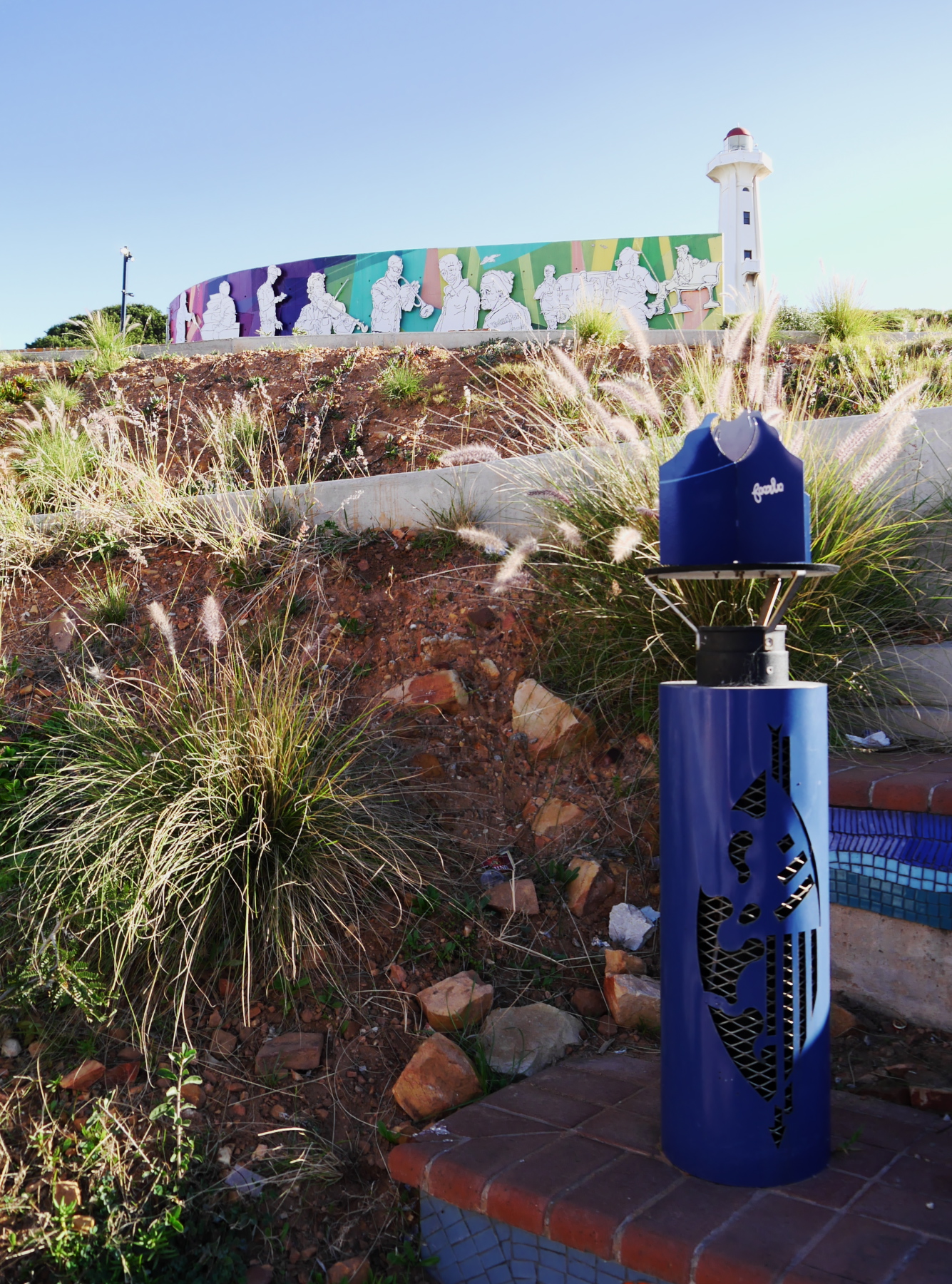 Nous avons donc une partie de l’après-midi pour se balader à Port-Elizabeth. Nous nous engouffrons donc dans un taxi et demandons à être déposés au Donkin Preserve, en haut de la ville. La pyramide et le phare y servent de point de repère et d’orientation. Ce n’est pas une surprise si l’Office du Tourisme s’y trouve (avec un petit café)! Regardez bien sur le pyramide et vous trouverez une plaque érigée par Rufane Donkin,gouverneur du Cap,  en mémoire de sa femme Elisabeth, la même qui donna son nom à la ville. A partir de là, vous pouvez soit suivre le Donkin Trail qui vous mènera à travers les lieux les plus historiques de la ville ou prendre la Route 67, une véritable galerie d’art contemporain à ciel ouvert. 67 œuvres marquant les 67 années d’effort de Nelson Mandela pour une Afrique du sud démocratique. A travers la ville, c’est toute une série d’œuvres colorées qui descendent en cascade jusqu’au Campanile, l’autre « pont de repère » de Port Elizabeth, vers le front de mer.