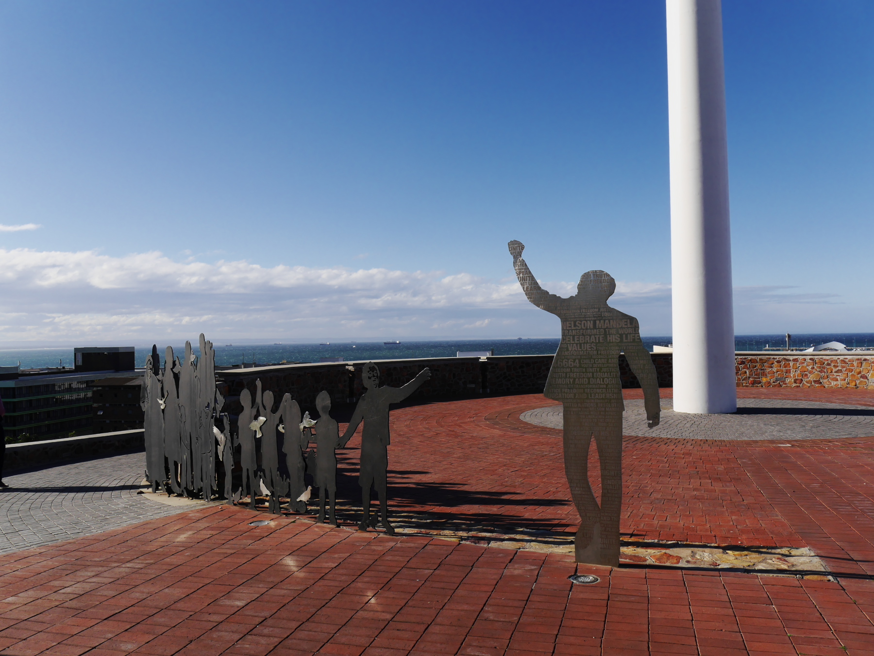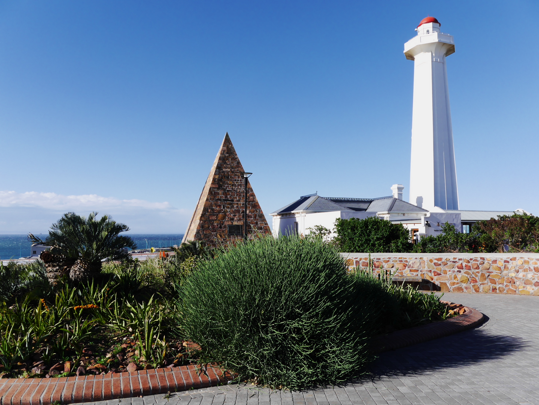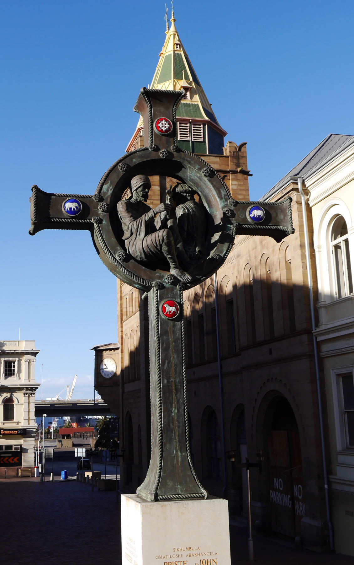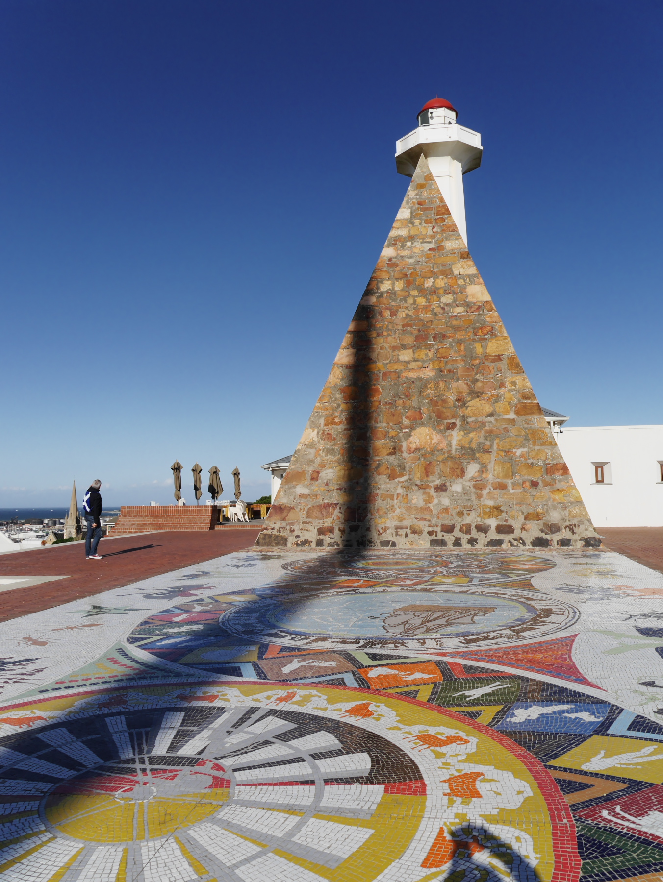 Nous avons donc une partie de l’après-midi pour se balader à Port-Elizabeth. Nous nous engouffrons donc dans un taxi et demandons à être déposés au Donkin Preserve, en haut de la ville. La pyramide et le phare y servent de point de repère et d’orientation. Ce n’est pas une surprise si l’Office du Tourisme s’y trouve (avec un petit café)! Regardez bien sur le pyramide et vous trouverez une plaque érigée par Rufane Donkin,gouverneur du Cap,  en mémoire de sa femme Elisabeth, la même qui donna son nom à la ville. A partir de là, vous pouvez soit suivre le Donkin Trail qui vous mènera à travers les lieux les plus historiques de la ville ou prendre la Route 67, une véritable galerie d’art contemporain à ciel ouvert. 67 œuvres marquant les 67 années d’effort de Nelson Mandela pour une Afrique du sud démocratique. A travers la ville, c’est toute une série d’œuvres colorées qui descendent en cascade jusqu’au Campanile, l’autre « pont de repère » de Port Elizabeth, vers le front de mer.