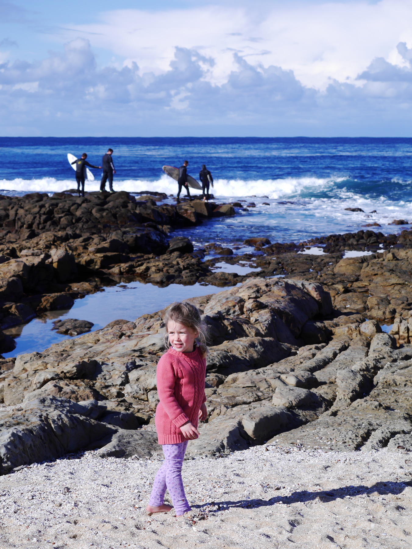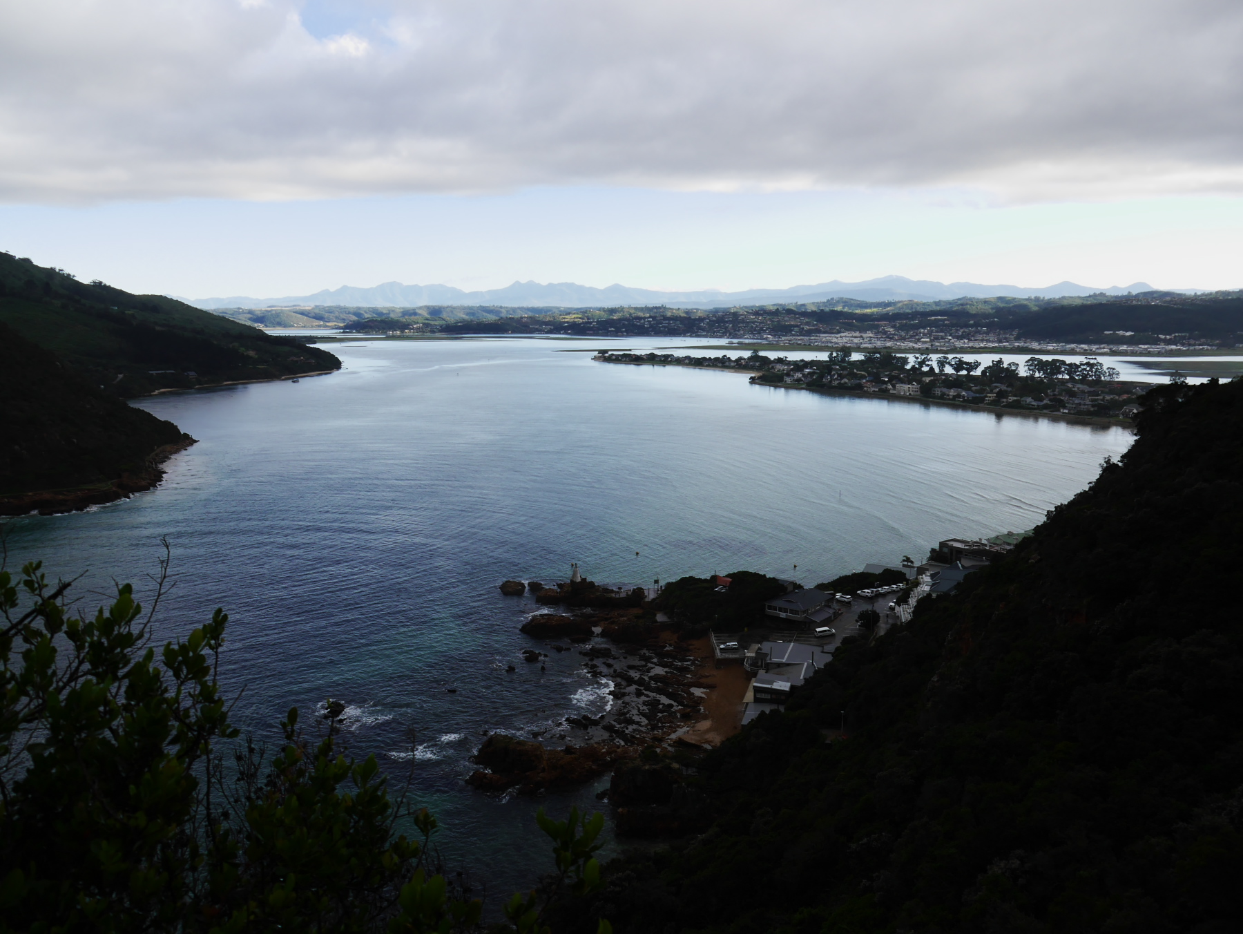 Depuis les quartiers résidentiels de la falaise, la vue est imprenable ! L’horizon est bleu, coupé par une ligne de nuages, l’océan couleur marine et la falaise est aussi rouge-orangée que dans mes souvenirs. Tout est calme, à peine quelques bagnoles qui quittent leurs garages pour emmener leurs passagers au boulot. Knysna s’éveille… et nous avons tout le temps. Après avoir profité des sentiers aménagés au sommet pour en prendre plein la vue, nous reprenons la voiture pour nous rendre au niveau de la mer, et voir The Heads sous un autre angle.