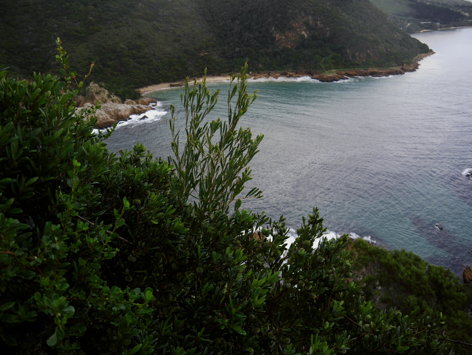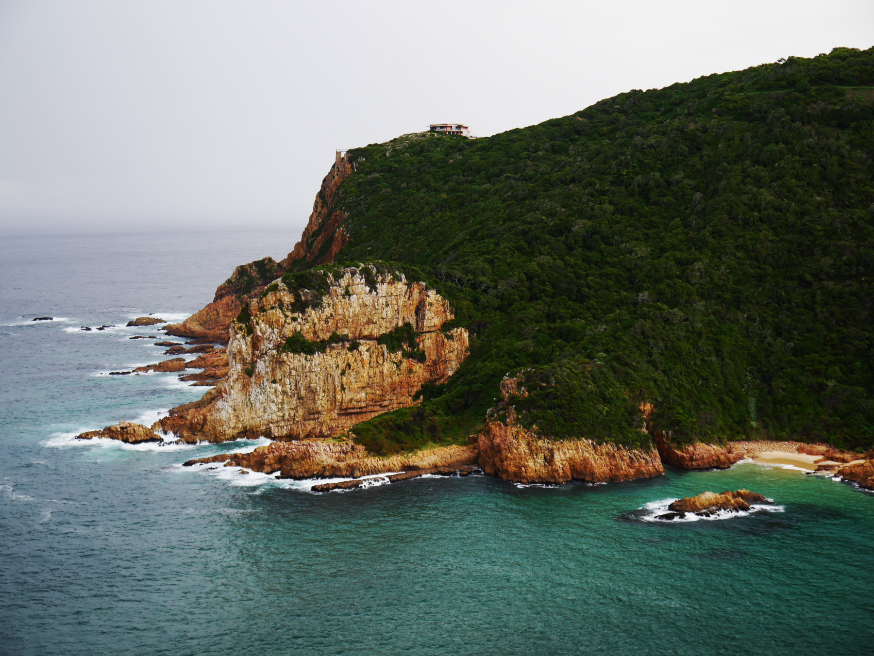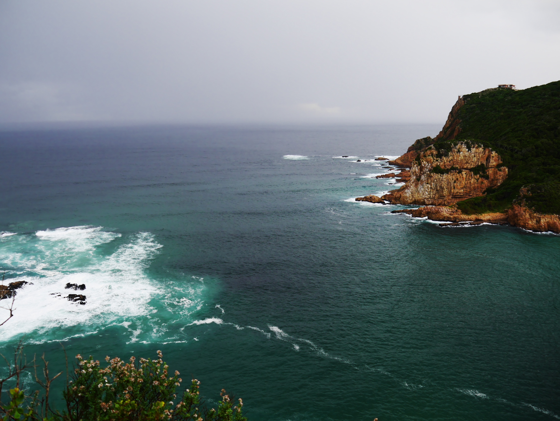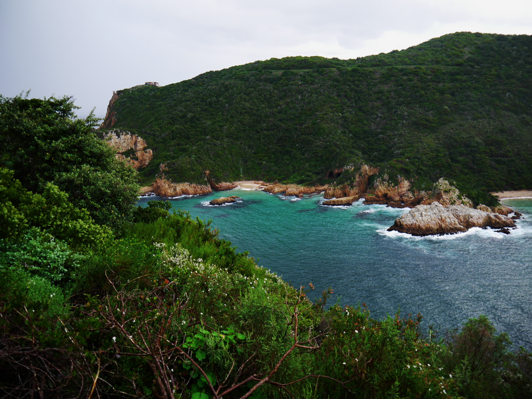 Impossible de quitter Knysna sans voir « The Heads ». Après un bon petit-déjeuner, nous quittons le Bed&Breakfast, et en route pour « The Heads », des deux falaises qui forment une véritable « porte » entre l’océan et la lagune. Un endroit extrêmement dangereux pour la navigation mais de toute beauté pour le visiteur. Si vous êtes de passage, prenez la route qui mène sur la falaise Est. C’est assez étonnant, mais celle-ci est livrée aux constructions. De nombreuses villas de luxe s’alignent depuis la lagune jusqu’au sommet. Par contre, la falaise Ouest, elle, est préservée. Si vous avez plus de temps à Knysna, n’hésitez pas à réserver votre excursion pour the « Featherbed Preserve« , une réserve privée qui couvre toute cette partie de la lagune, et que j’avais eu l’occasion d’explorer lors de ma dernière visite (on ne sait pourquoi « The Heads » n’ont pas été déclarée Parc National, mais voilà…).