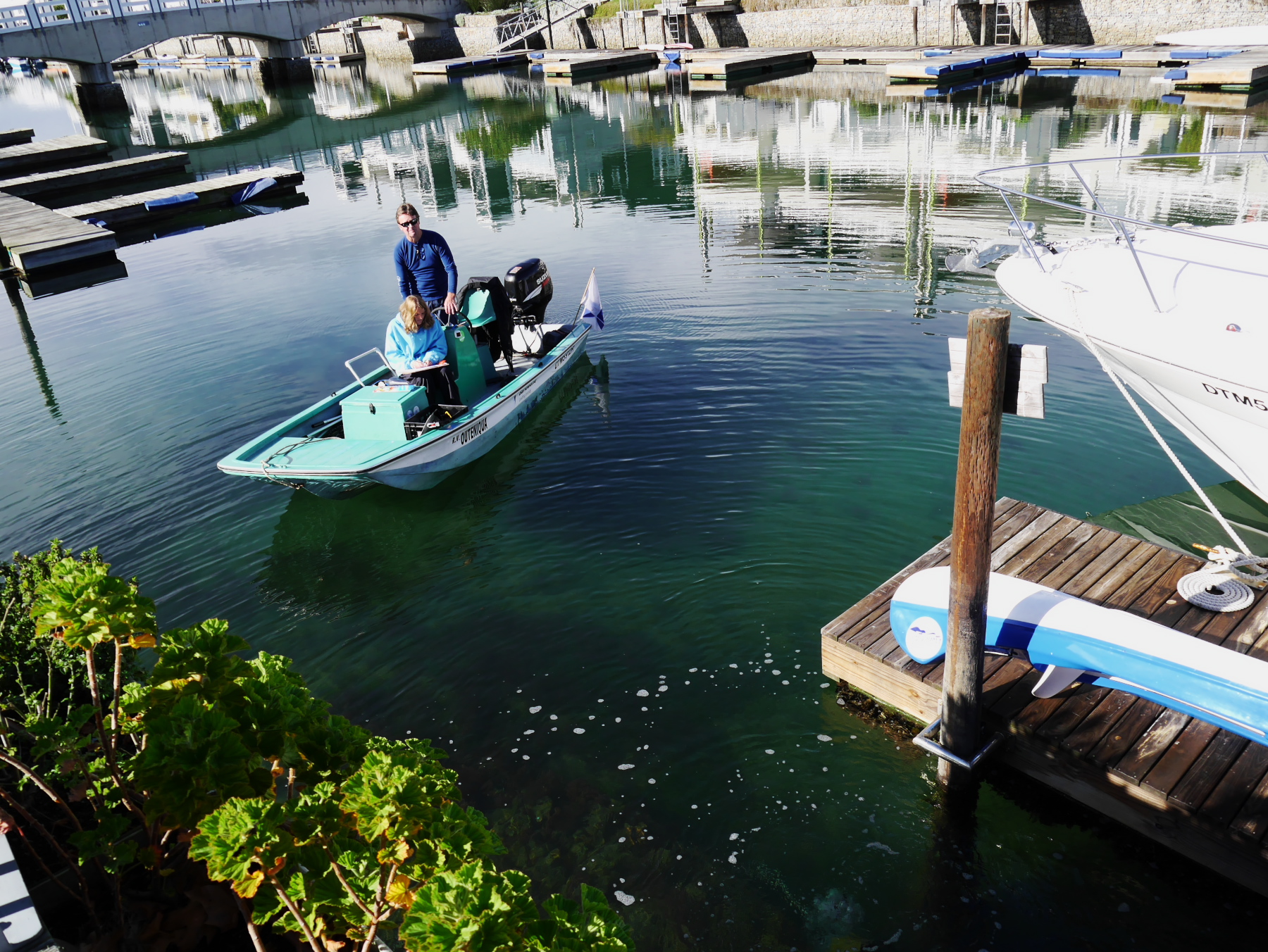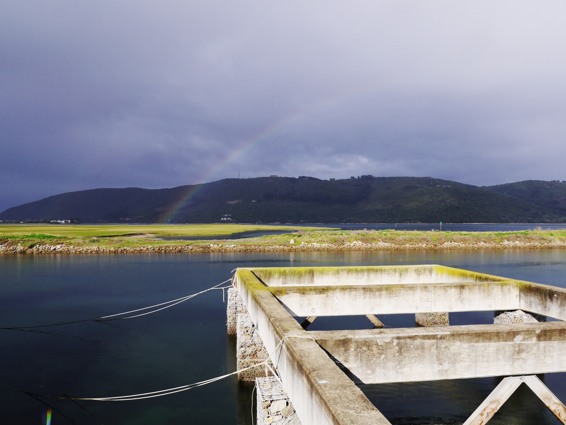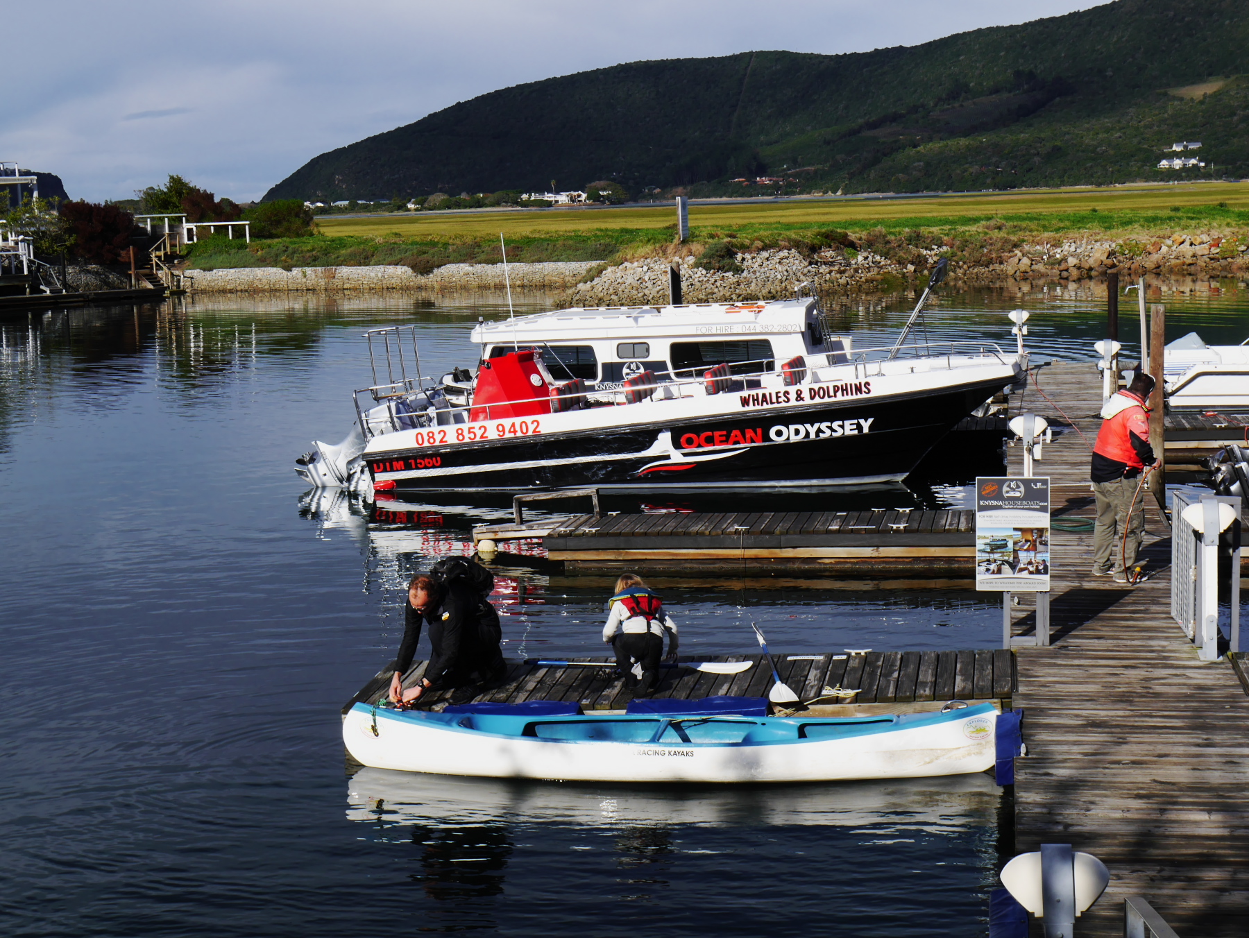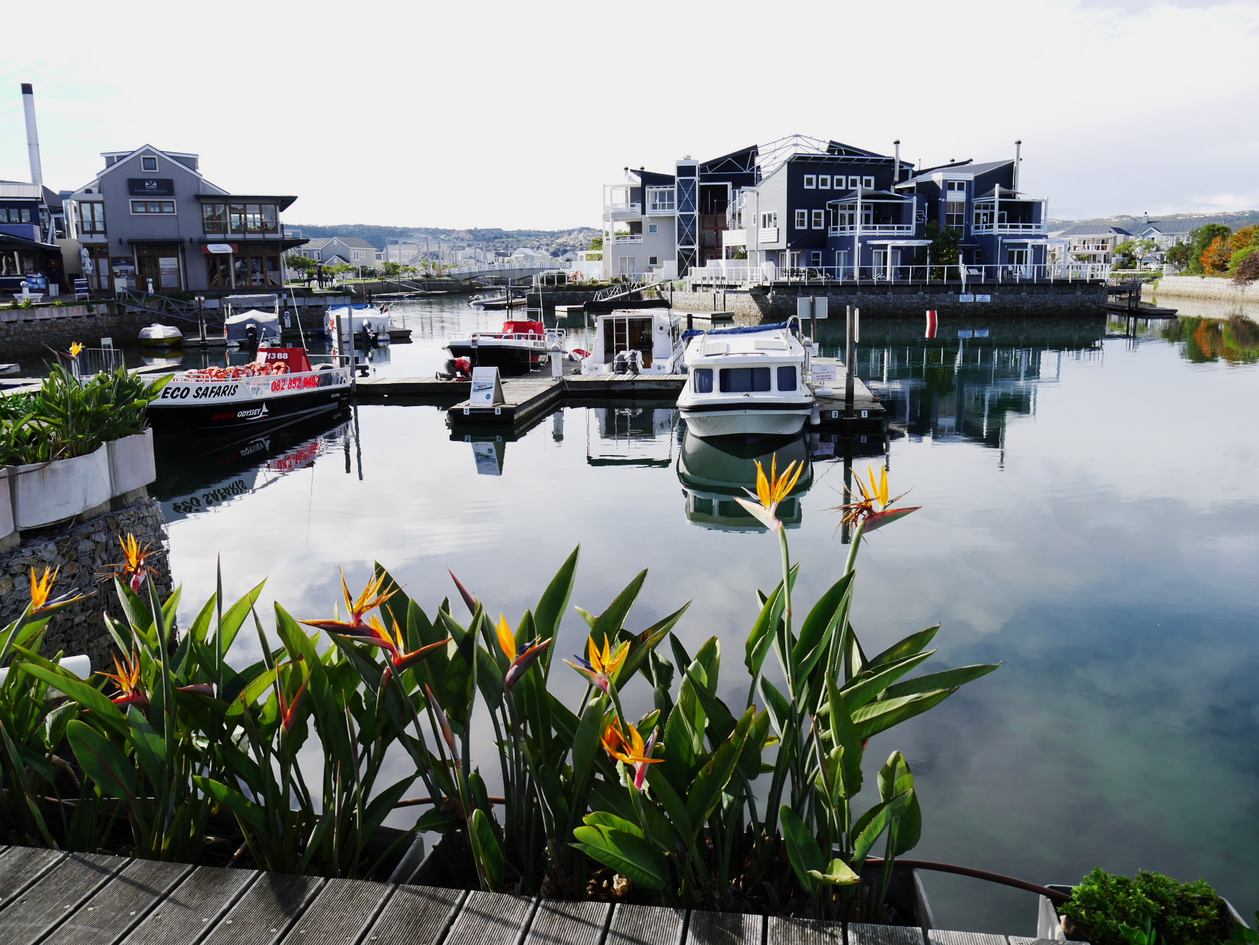 Sur la lagune, les maisons sont toutes aussi cossues, mais un peu plus modeste. Vu d’ici, la passe de lagune semble moins impressionnante, mais plus large. Le contraste avec l’océan, pourtant calme, est saisissant. Protégée des courants du grand large, l’eau de la lagune est toute calme. Si calme que des échassiers viennent s’y installer. Avant de reprendre la route, nous profitons de la douce activité matinale des quais. Ici, un père s’apprête à mettre les voiles avec sa fille, les clients arrivent dans les cafés pour leur caféine du matin… mais le plus surprenant, c’est un plongeur, presque immobile, qui semble inspecter le fond de l’eau avec attention. Un peu plus loin, sur un petit bateau, une jeune prend des notes tandis qu’un homme d’âge mur surveille les opérations. En fait, il s’agit d’une opération de comptage d’hippocampes. L’hippocampe de Knysna (ou du Cap) est un des plus petits des hippocampes, mais aussi un des plus menacés et est régulièrement sous surveillance. Et donc apparemment, on peut le trouver là, au pied des pilotis des quais de la ville.