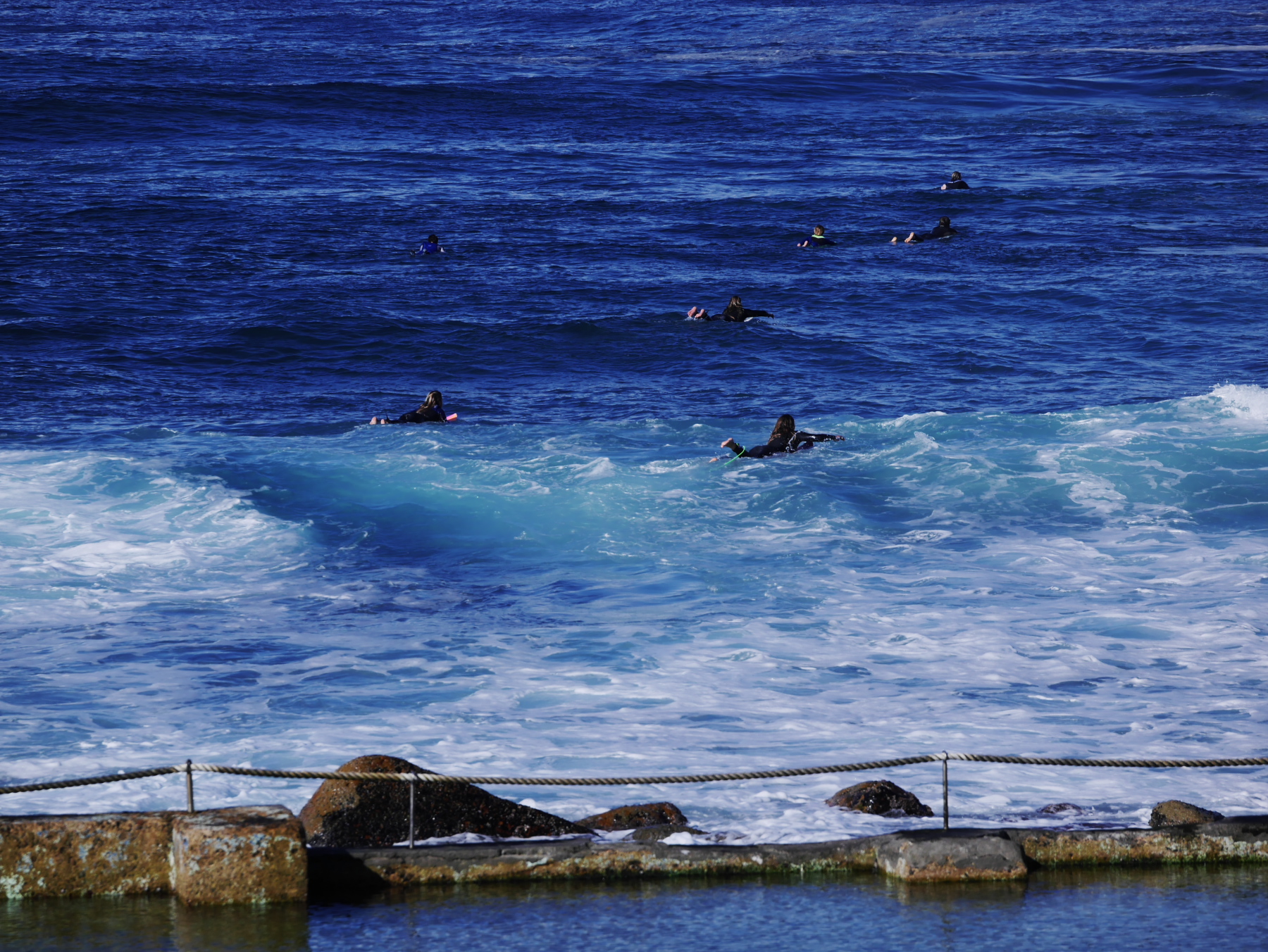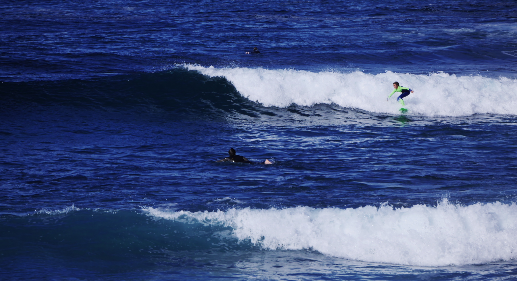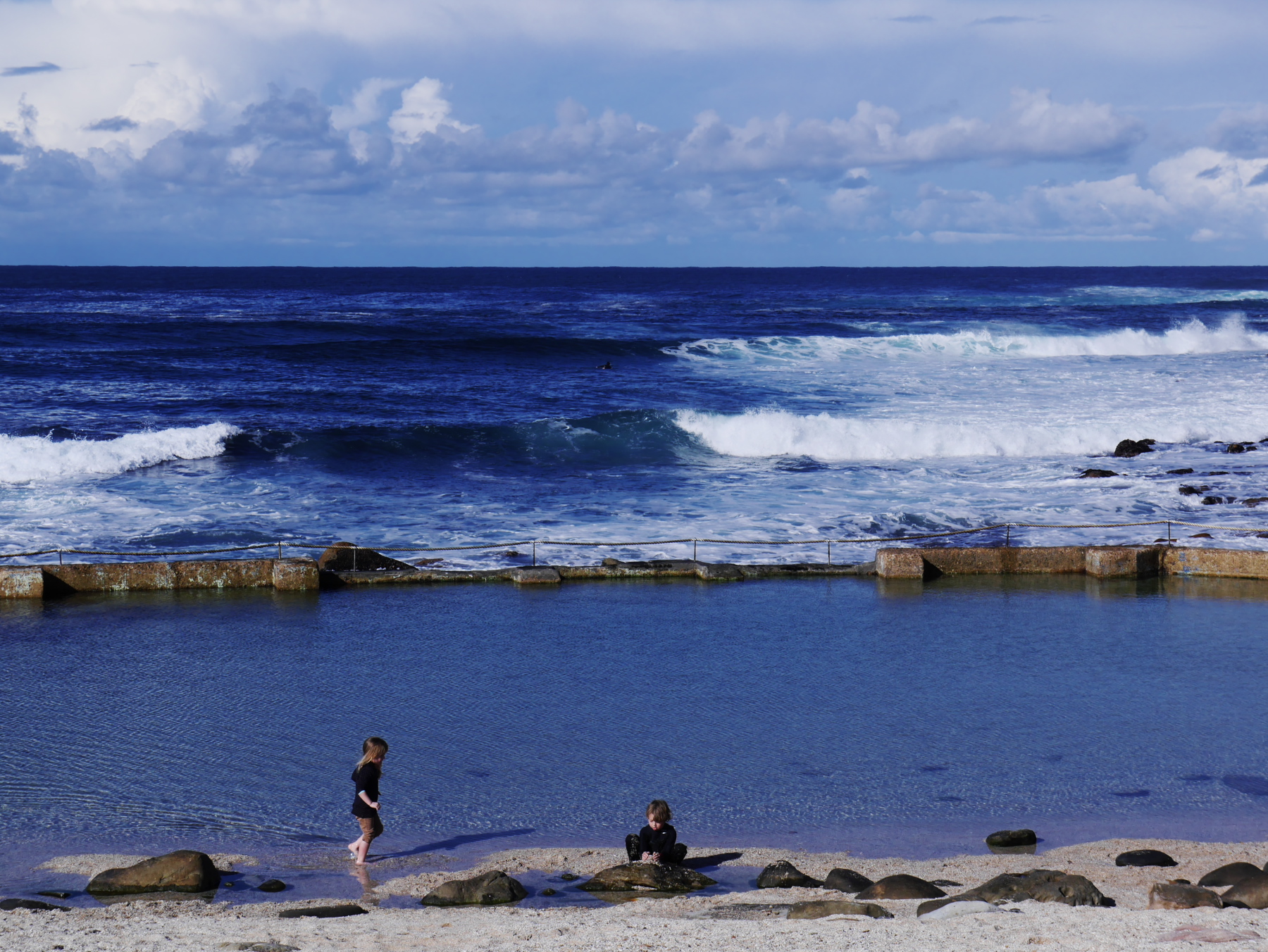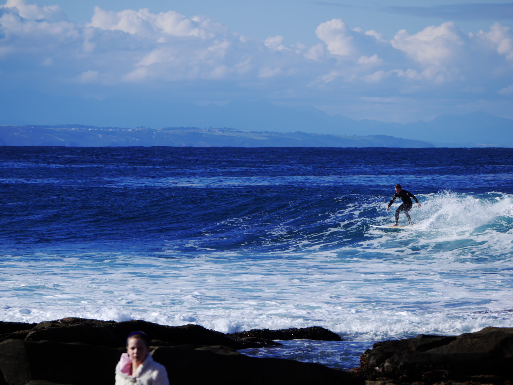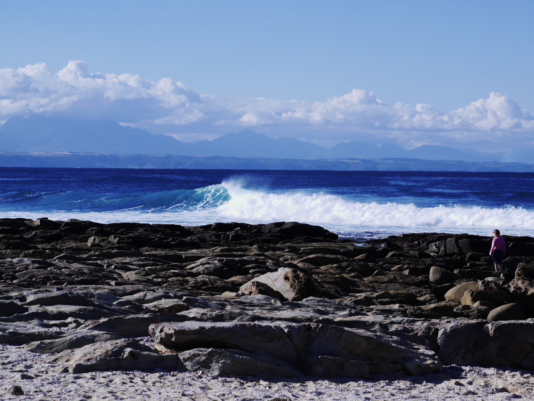Nous sommes en semaine, mais la terrasse est pleine ! Un tiède soleil d’hiver chauffe tout ce petit monde. Des groupes d’amis, une paire de touristes, quelques familles, des surfeurs… presque tous blancs. La seule sud-africaine noire… c’est une nounou, qui promène sur la plage deux petites filles, blondes et bouclées, sans leurs parents. Il semble donc que l’ascenseur social post-apartheid connaisse des ratés. Jeune Loup m’en fait la remarque, et me pose des questions. Je le vois attentif à plein de choses et de détails. Quand Nelson Mandela fut élu président, il était encore un petit garçon… Je lui explique tout ce que je sais sur l’apartheid, la transition, les premières élections multiraciale. Lui explique aussi d’attendre Le Cap pour comprendre… mais il veut en savoir plus. Ça le travaille depuis que nous avons croisé plusieurs townships… celles de Port Elizabeth, de Knysna, celle de Mossel Bay. Je le sens plein de curiosité mais aussi de colère, lui qui a connu la guerre et la discrimination de près. Pendant que je lui raconte tout çà, les surfeurs, insouciant et heureux, perdus dans l’océan, continuent de fendre les vagues.
