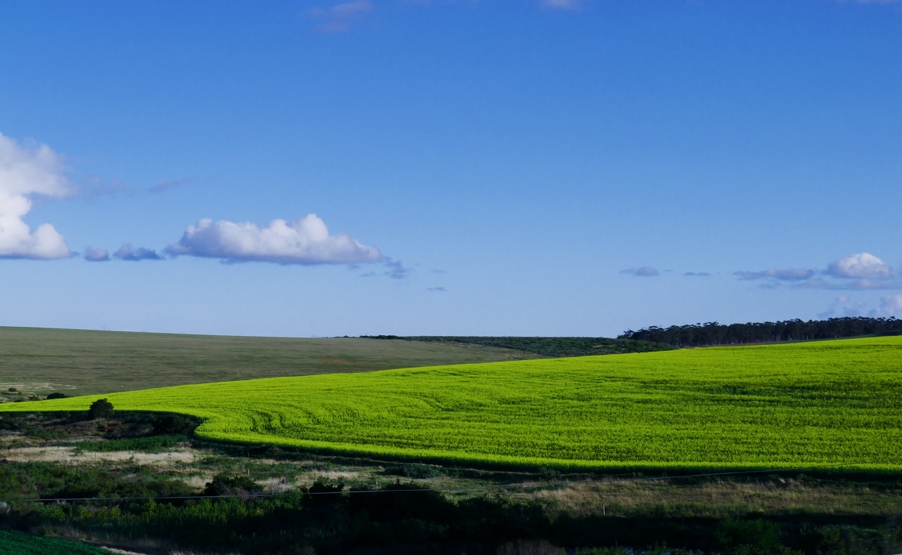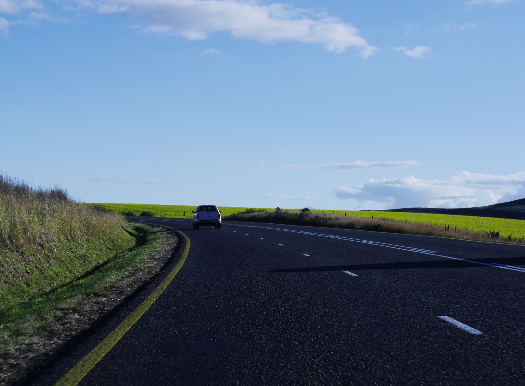 Après avoir avalé un burger, nous nous remettons en route sous un soleil bas qui semble resté suspendu. Dès que 13 heures est passé, le reste de la journée se prolonge comme une longue fin d’après-midi, jusqu’à ce que le soleil se couche, avec une lumière d’une qualité irréelle. Et pendant des heures, nous roulerons dans un véritable fond d’écran Windows. Entre collines vert tendre et champs de colza jaune citron.