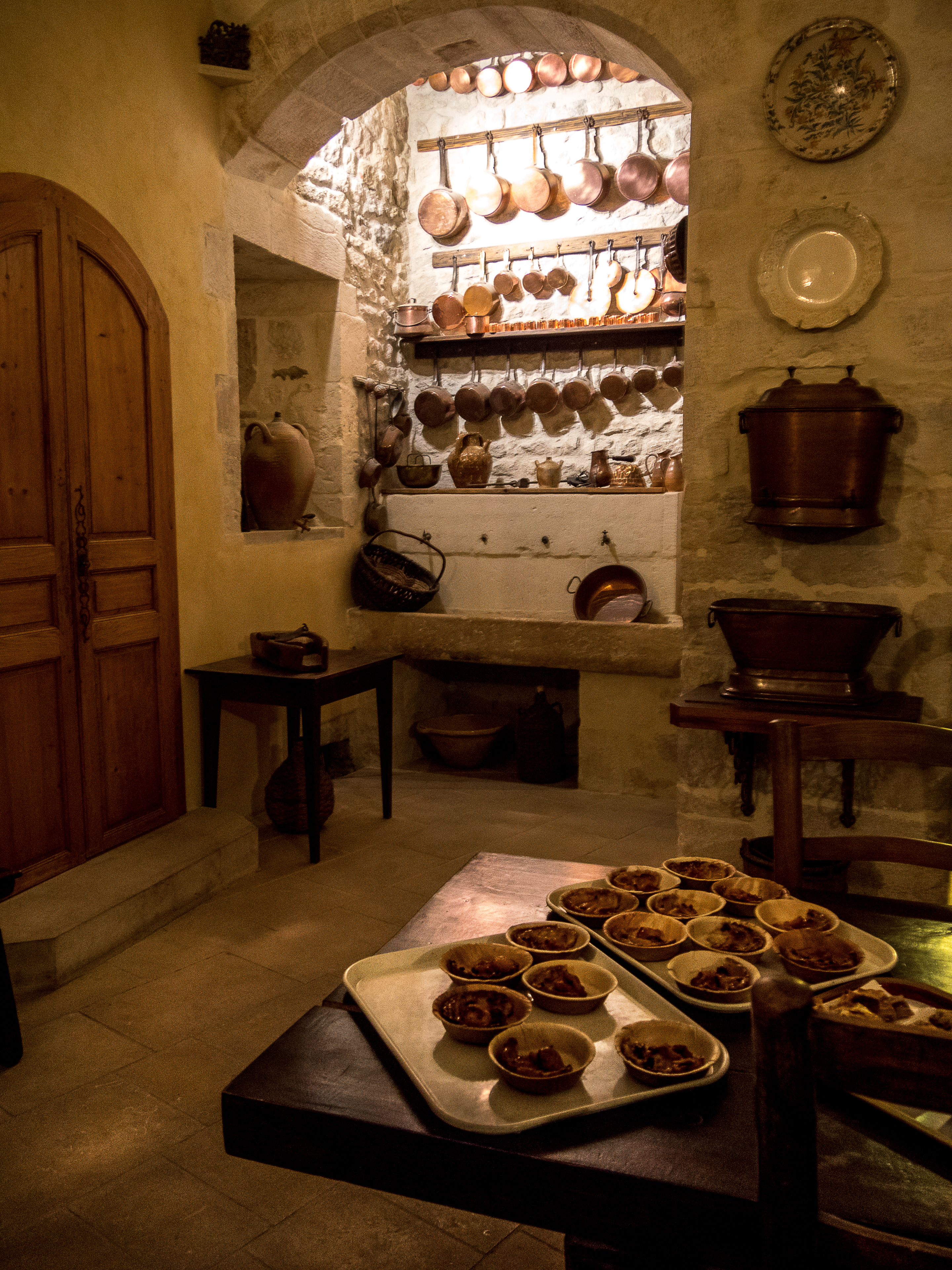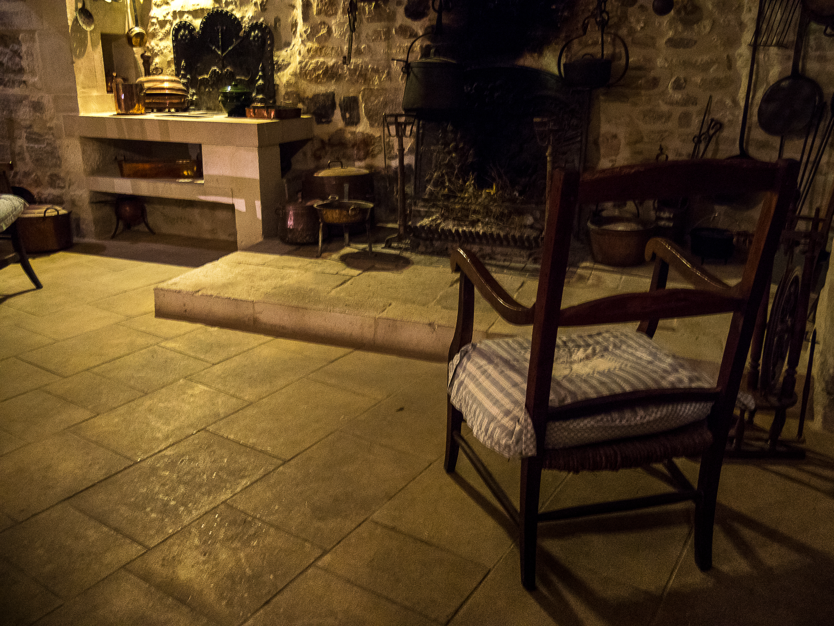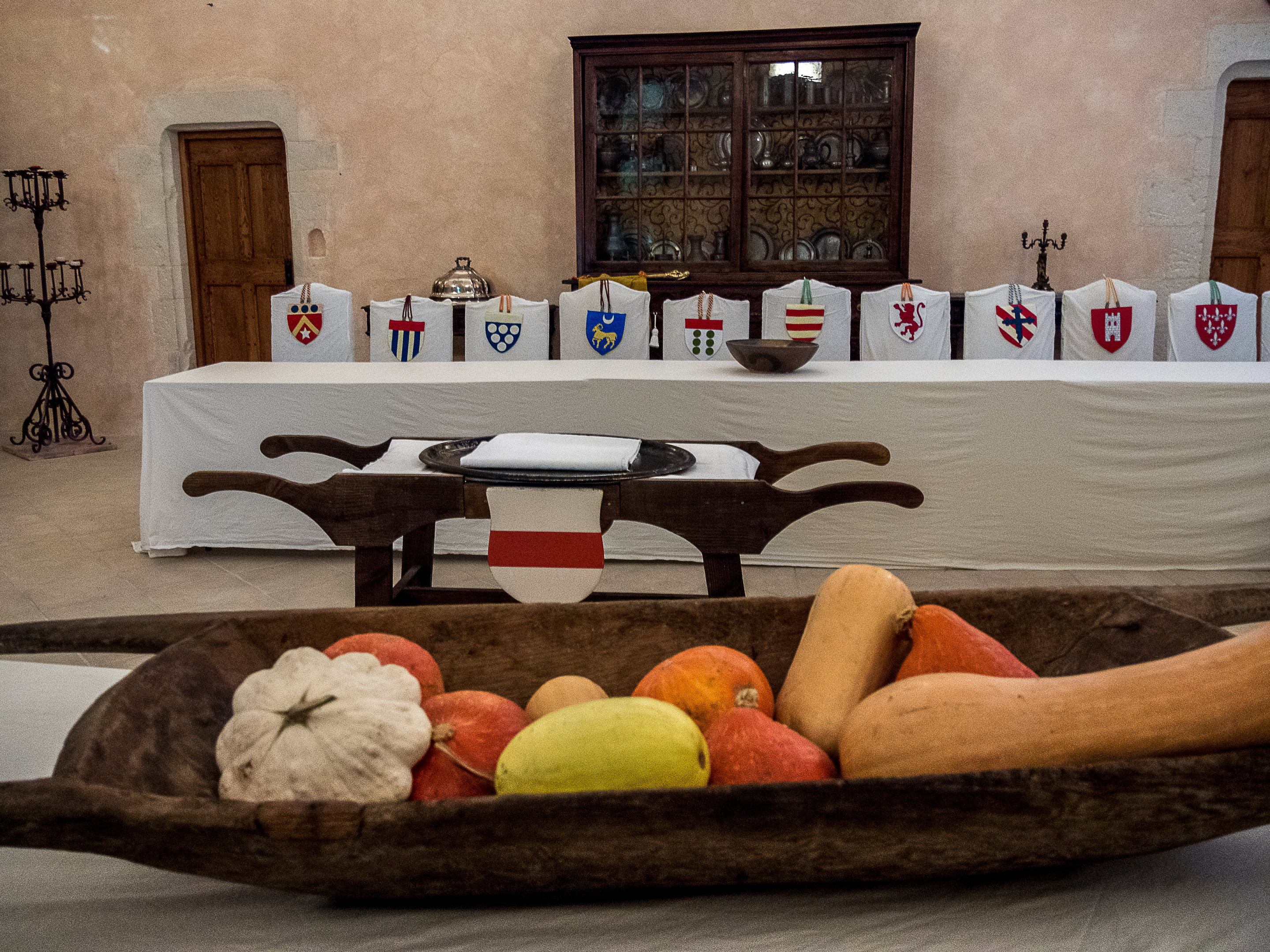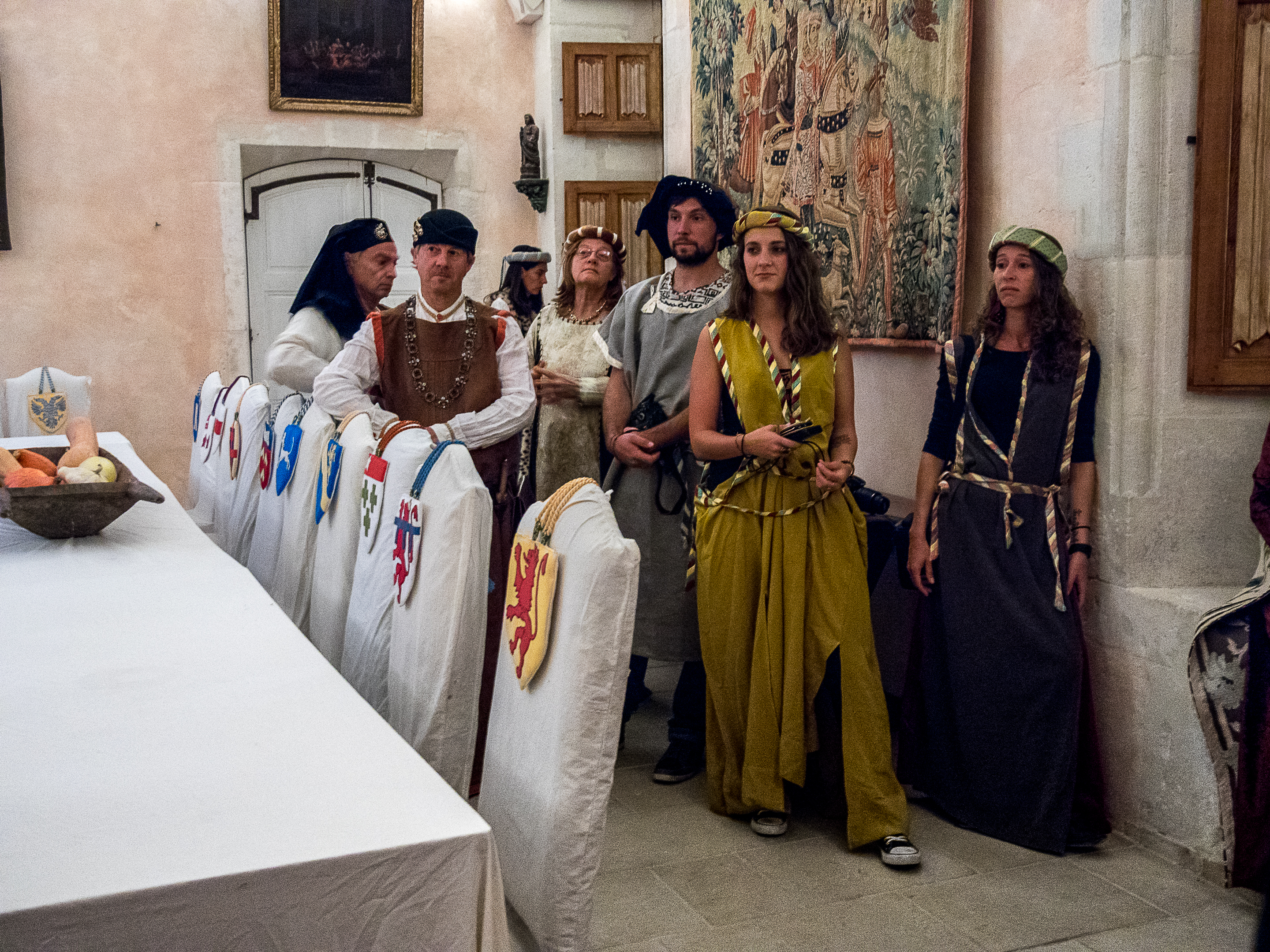C’est à notre tour de nous mettre dans l’ambiance et on nous invite à passer des costumes : chasubles, serre-têtes pour les dames, chemises, pourpoints et chapeaux pour les messieurs et colliers pour tous. Voilà, nous faisons partie du décor ! Et franchement, on ne dénote pas dans la très belle Salle des Etats, une grande salle de réception où sont organisés régulièrement des repas médiévaux ! C’est d’ailleurs la cuisine que nous visitons en second… avec un four d’époque qui fonctionne encore et différentes cheminées dont l’une destinée à rôtir des animaux entiers. Ouch ! Mais sur la table, des petites tourtes qui nous font de l’oeil finissent par compléter l’illusion que la cuisine est vraiment habitée. J’ose à peine imaginer le masse de travail qu’il a fallu pour dégager ces énormes pièces… mais aussi pour dénicher les meubles et ustensiles pour décorer tout ça. Ca laisse pantois, le véritable travail d’une vie !