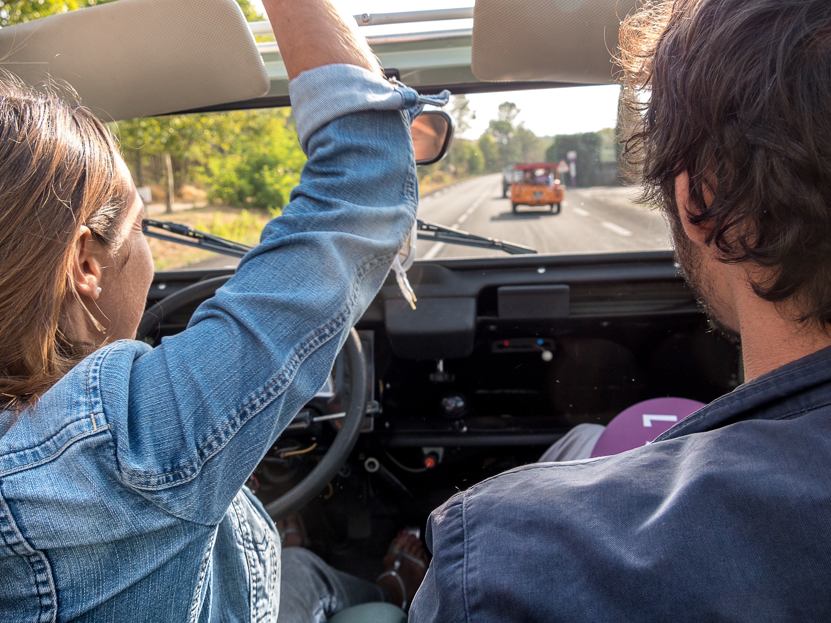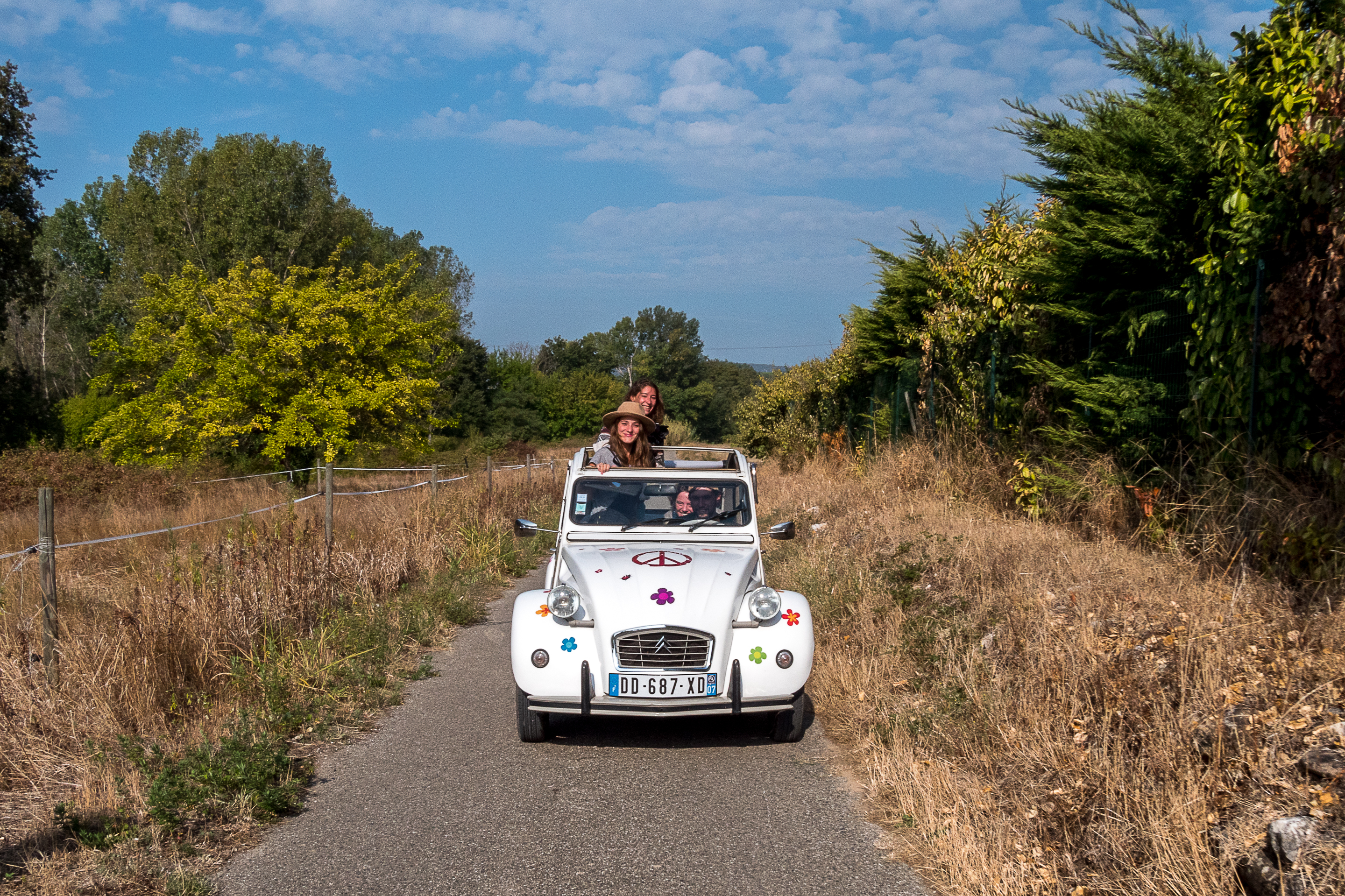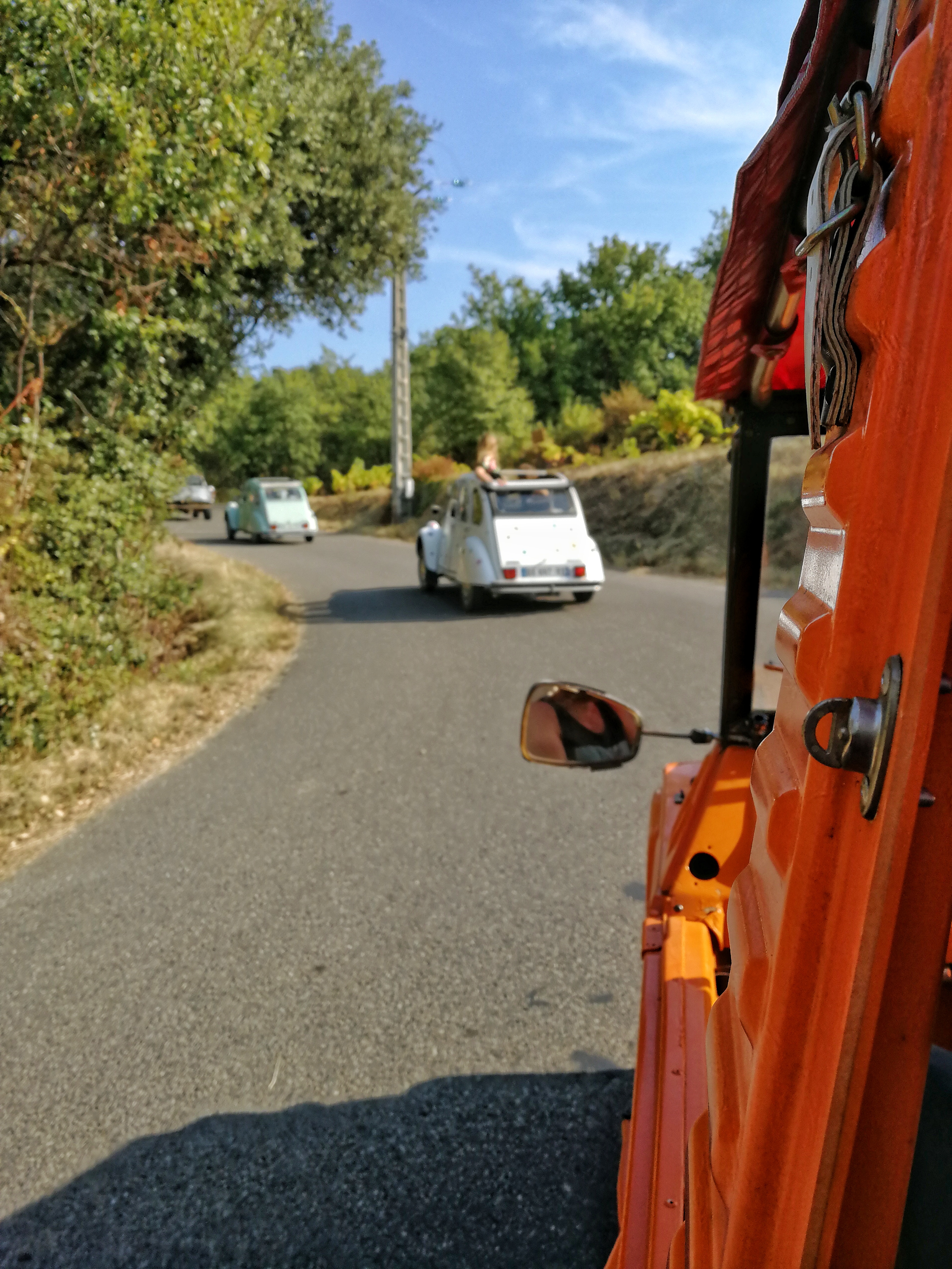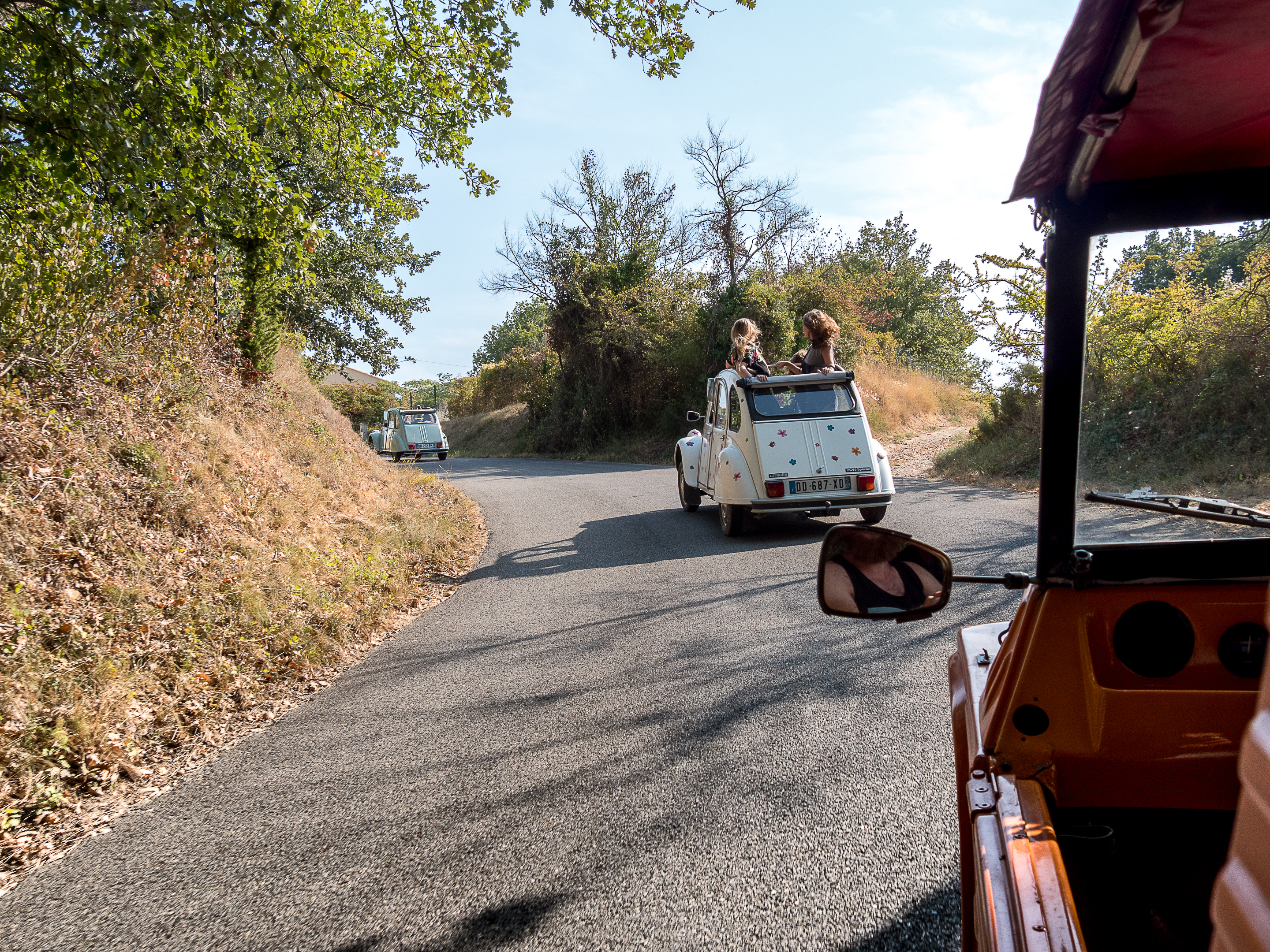 C’est donc tout joyeux que nous prenons les petites routes de campagne ardéchoise, dans des voitures qui sont loin de passer inaperçues ! Ici aussi, il y a comme un air de liberté, un petit goût du bonheur et une joie pure, celle qui vient de profiter du moment présent, du soleil, de nouveaux amis, de passer sa tête par le toit de la voiture, de voir les visages étonnés et rieurs des gens que l’on croise sur la route. Et puis, il y a le paysage, doucement vallonné par endroits, plus abrupt à d’autres, décoré par les couleurs des feuilles de vignes, vertes, jaune, et quelques fois déjà rouille ou rouge. Le goût de l’insouciance de l’époque où ces voitures étaient partout sur les routes de France.