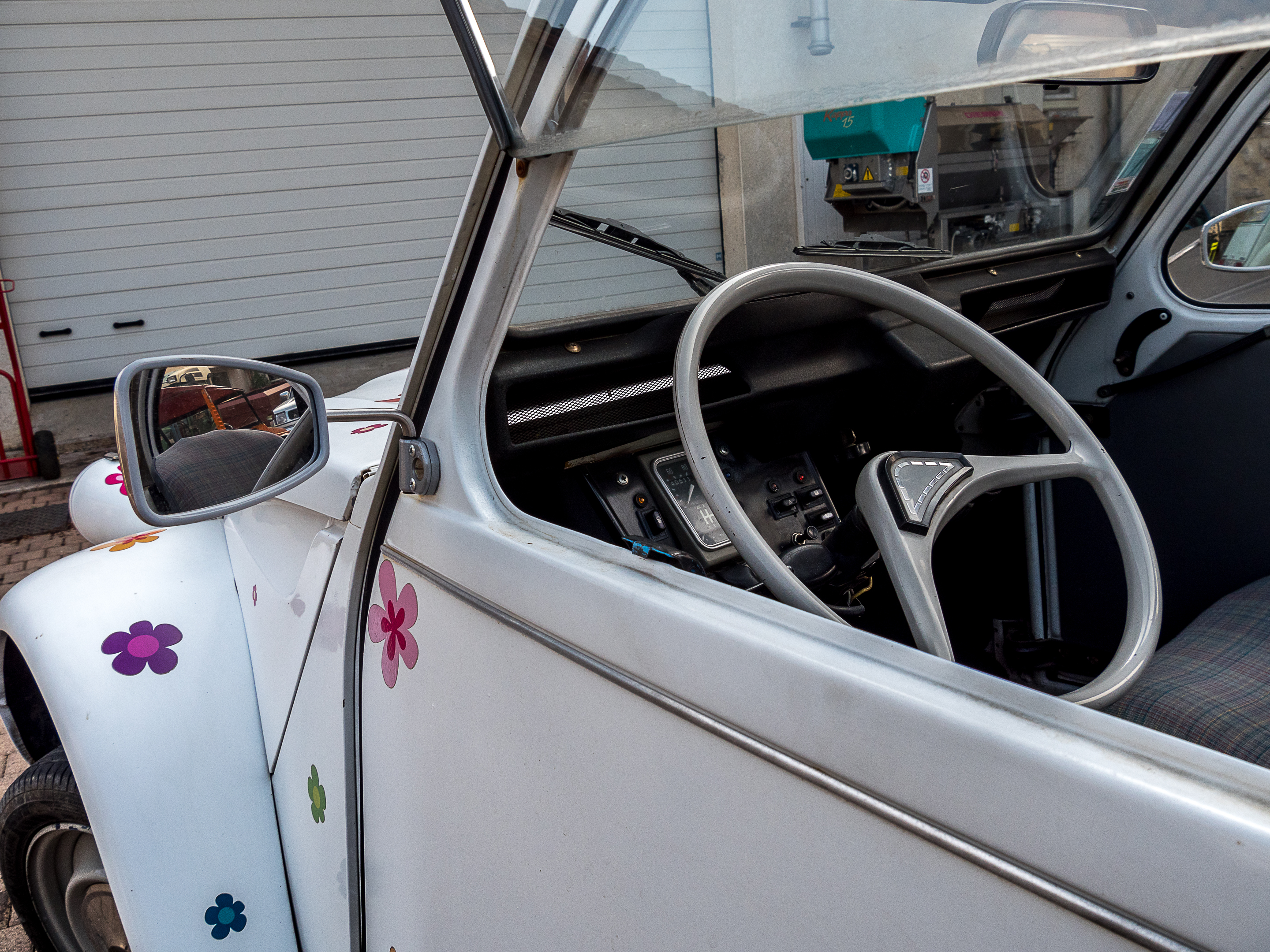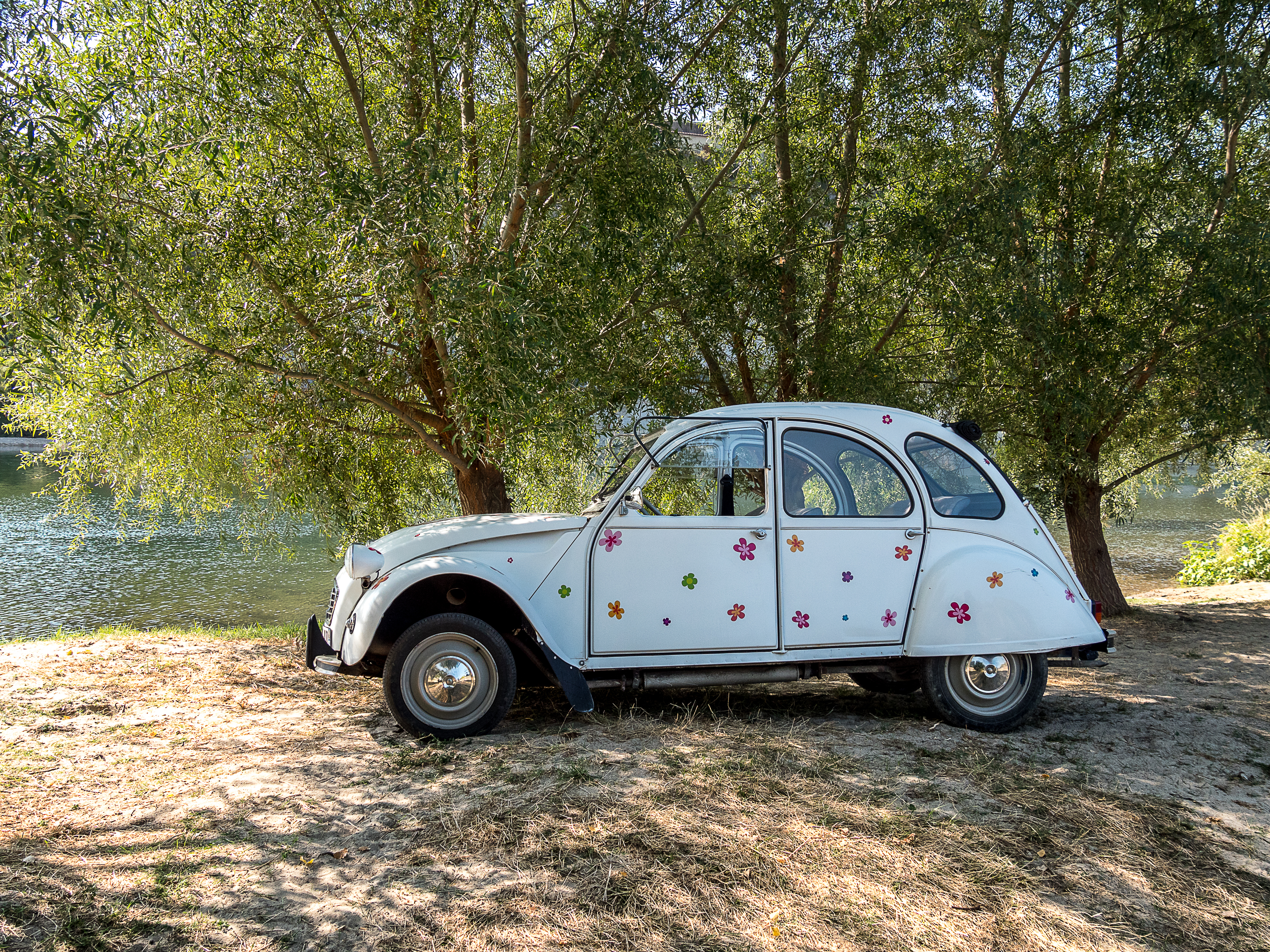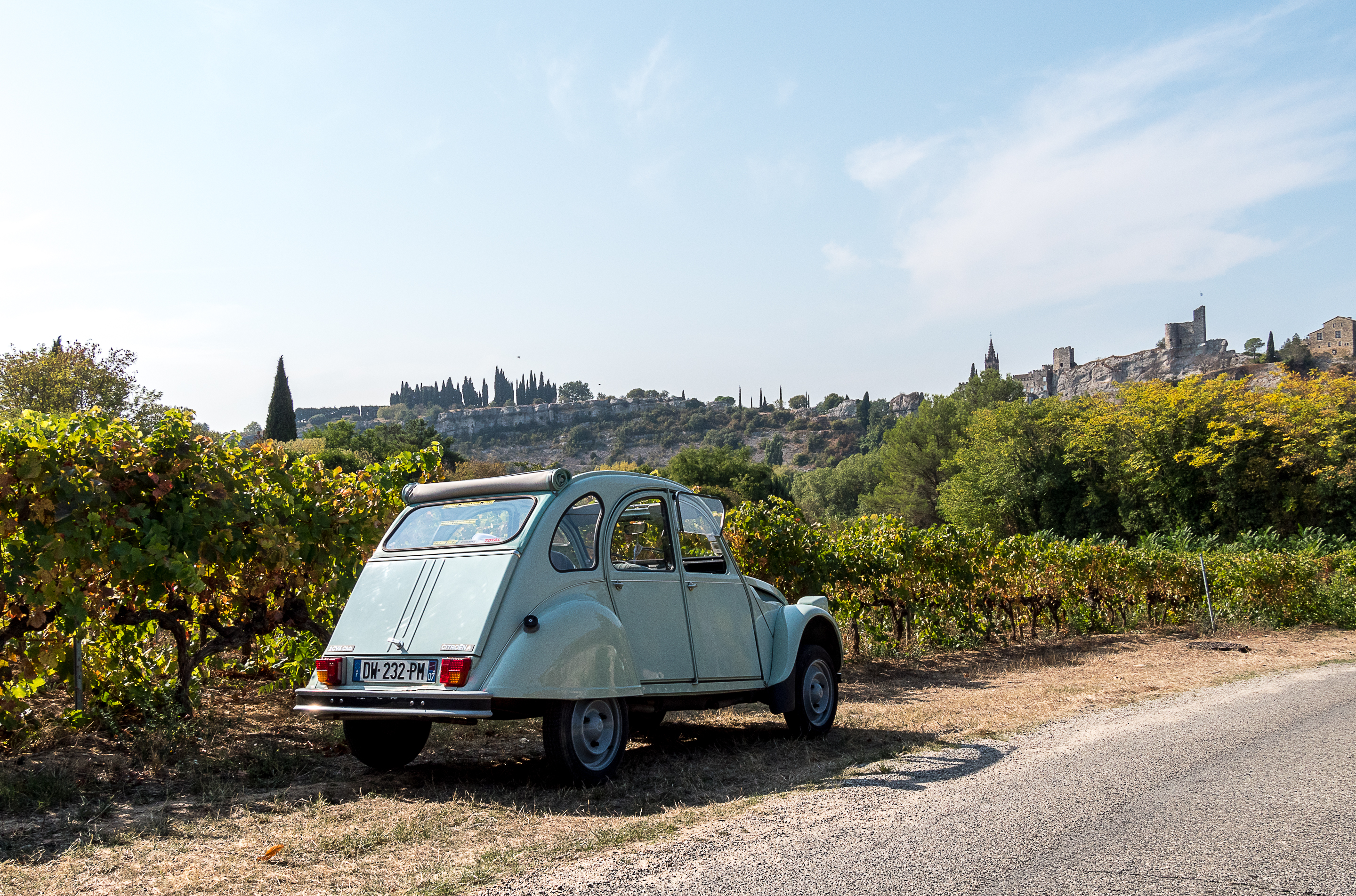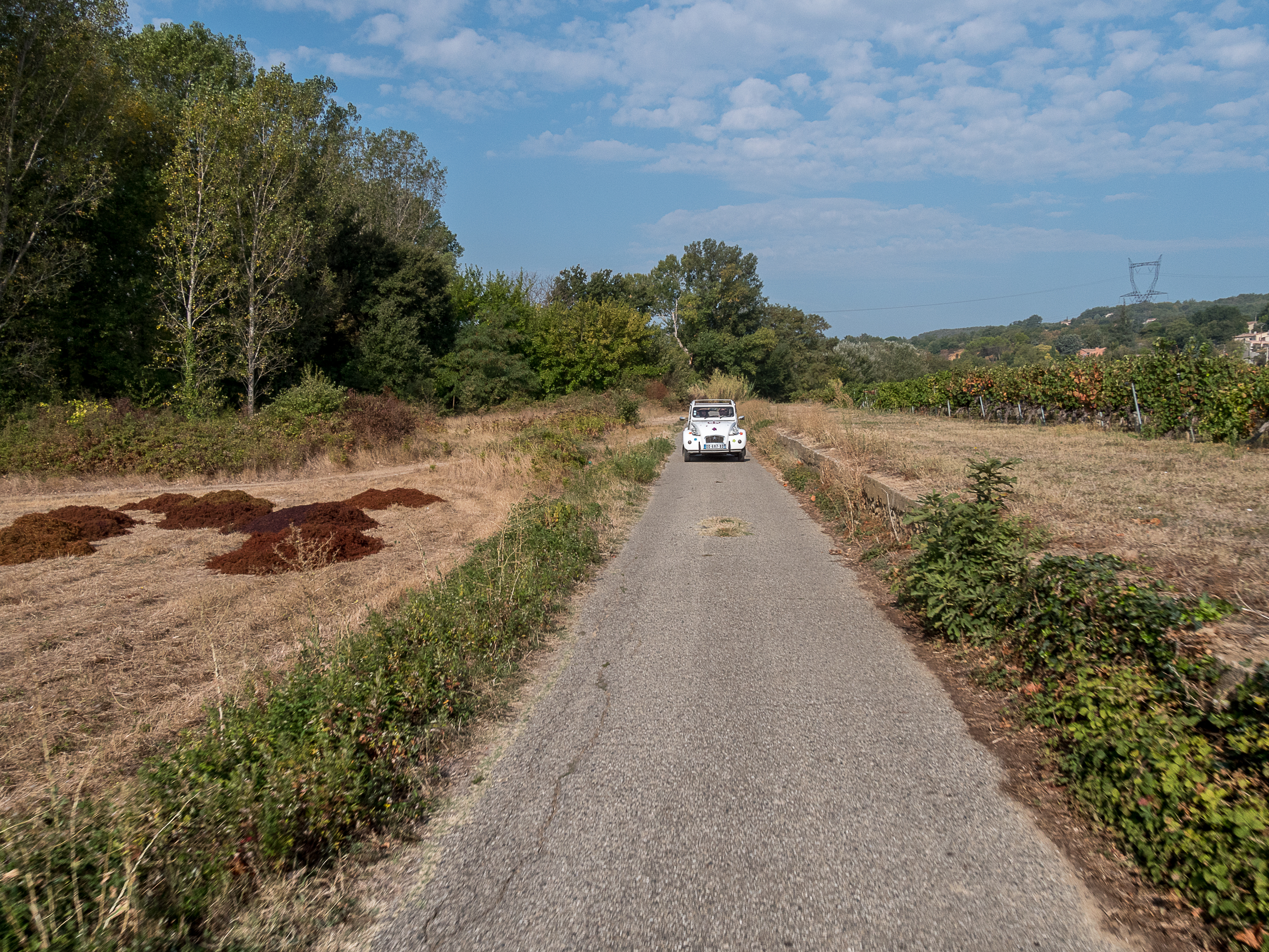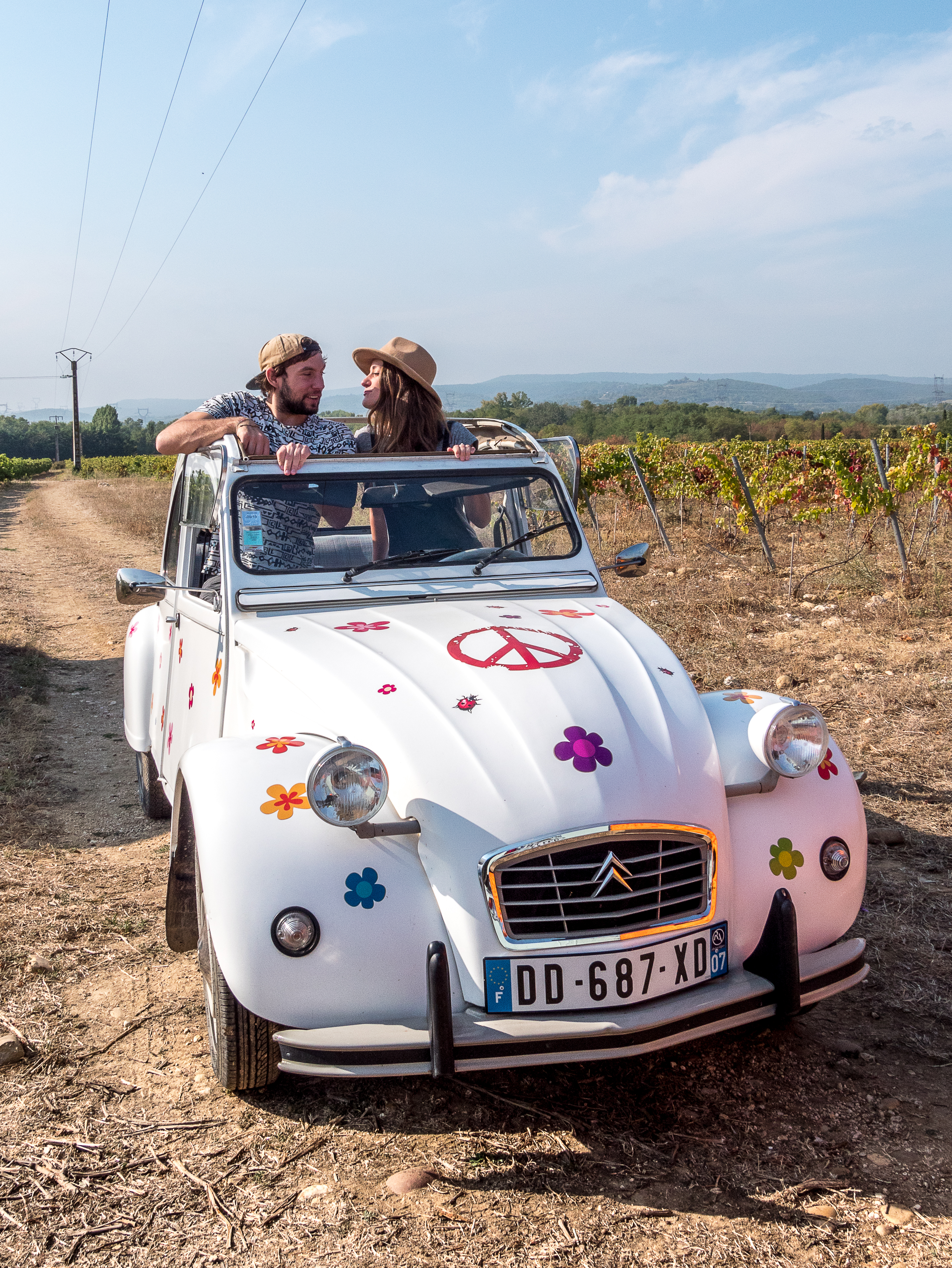 C’est donc tout joyeux que nous prenons les petites routes de campagne ardéchoise, dans des voitures qui sont loin de passer inaperçues ! Ici aussi, il y a comme un air de liberté, un petit goût du bonheur et une joie pure, celle qui vient de profiter du moment présent, du soleil, de nouveaux amis, de passer sa tête par le toit de la voiture, de voir les visages étonnés et rieurs des gens que l’on croise sur la route. Et puis, il y a le paysage, doucement vallonné par endroits, plus abrupt à d’autres, décoré par les couleurs des feuilles de vignes, vertes, jaune, et quelques fois déjà rouille ou rouge. Le goût de l’insouciance de l’époque où ces voitures étaient partout sur les routes de France.