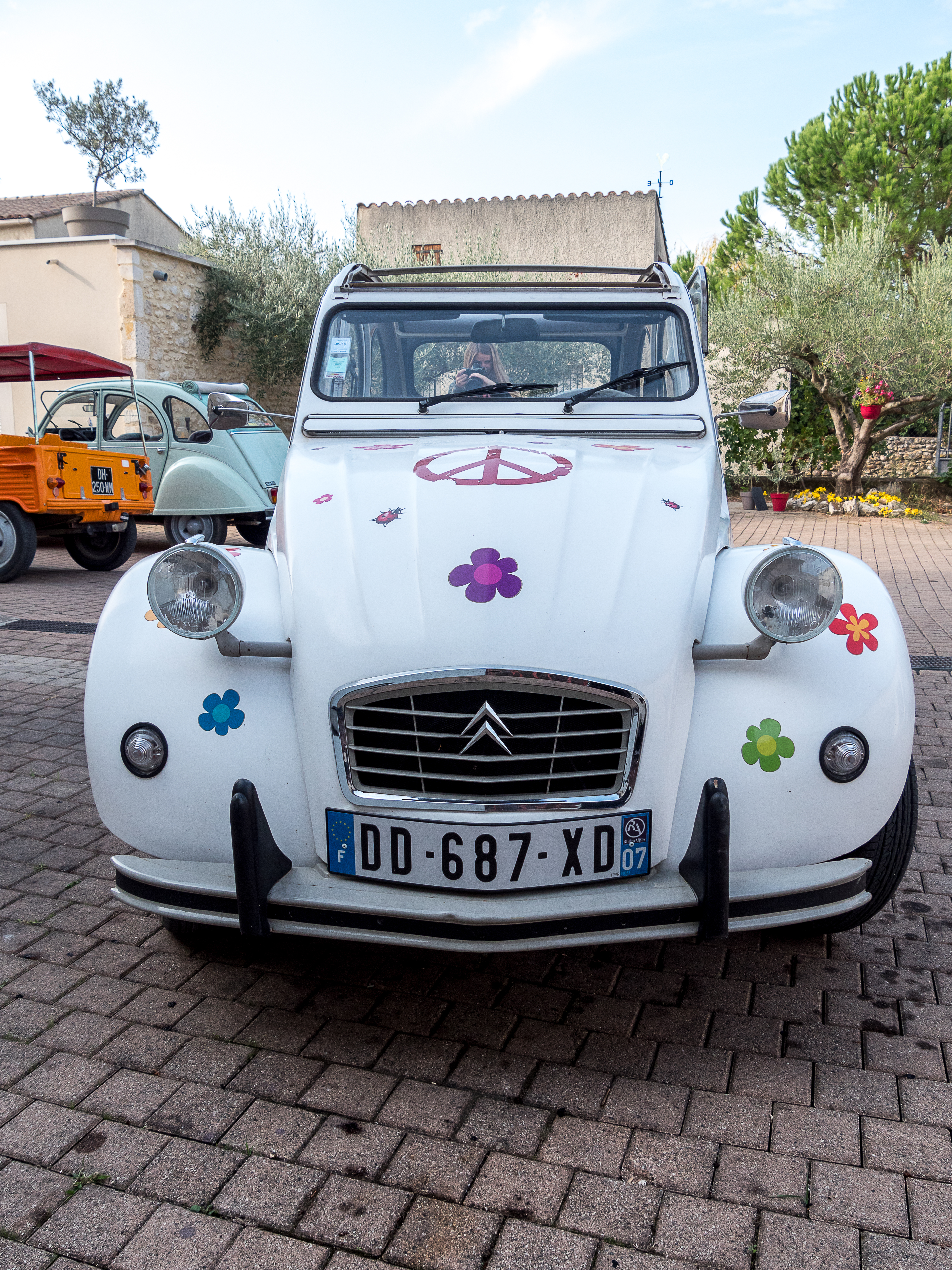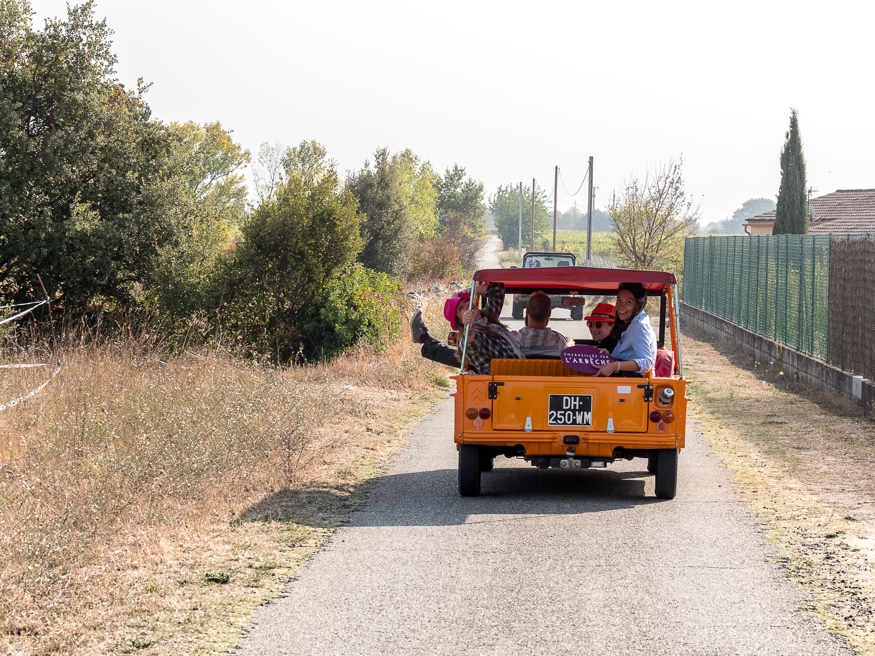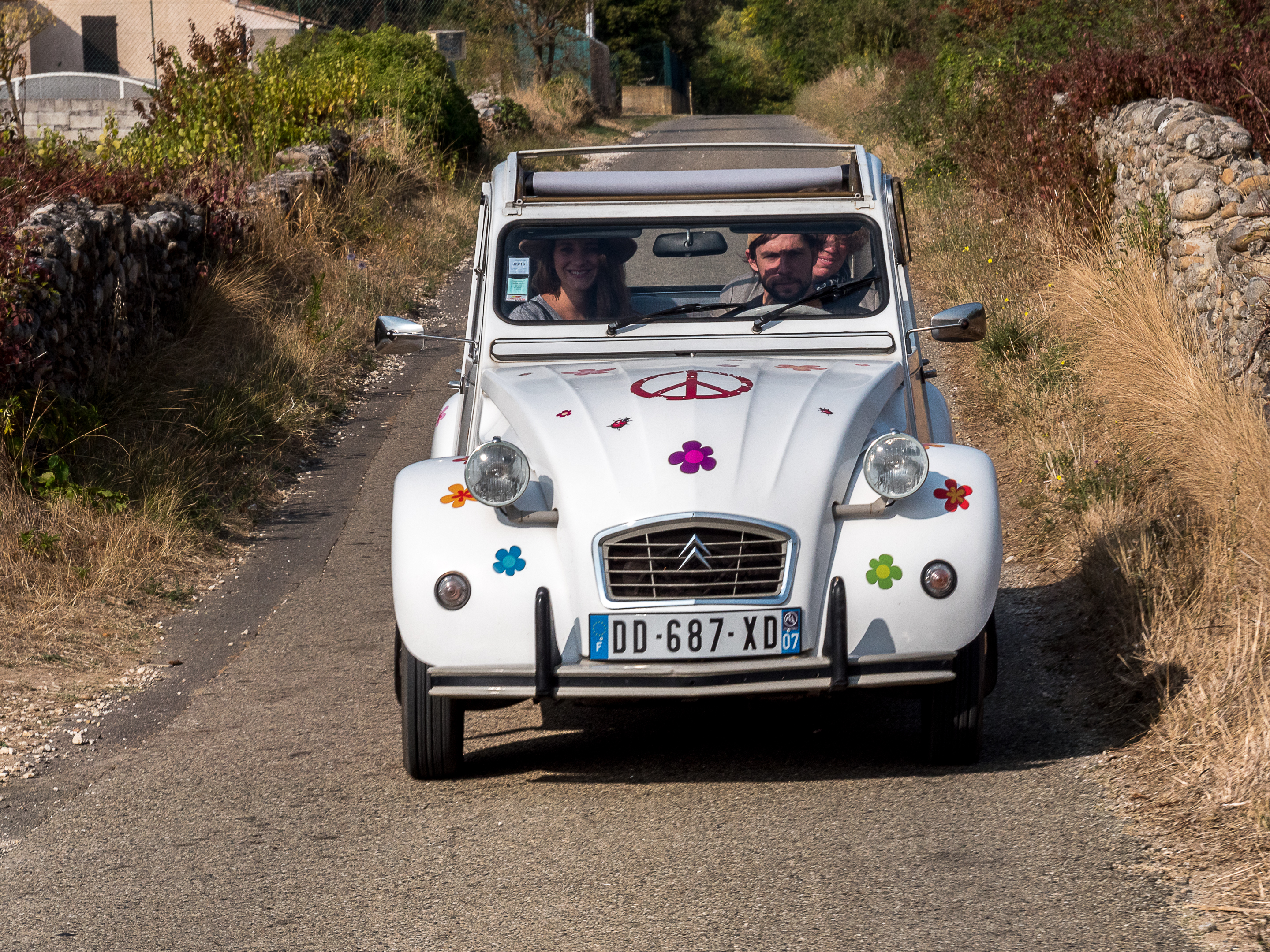 Dernière matinée en Ardèche, c’est à pied que nous nous rendons à notre dernière visite de domaine viticole : le Domaine de la Croix-Blanche à Saint-Martin-en-Ardèche. C’est Rose-Marie qui nous souhaite la bienvenue. Cette dynamique vigneronne, comme elle se définit elle-même, n’était pas née dans la vigne. Enseignante de métier, c’est en tombant amoureuse de Daniel, viticulteur, qu’elle est entrée dans la famille des vignerons. Le couple Archambault et leur fils Guillaume sont donc à la tête d’une exploitation qui est totalement passé au bio en 2013 et pour visiter les vignes, nous allons le faire avec style : à bord de véhicules vintage : des 2CV et une voiture que je ne connaissais pas : la Méhari. Un vieux modèle de Citroën qui semble plus avoir sa place dans la brousse que sur les routes de France. Détail amusant, la carrosserie est en plastique !