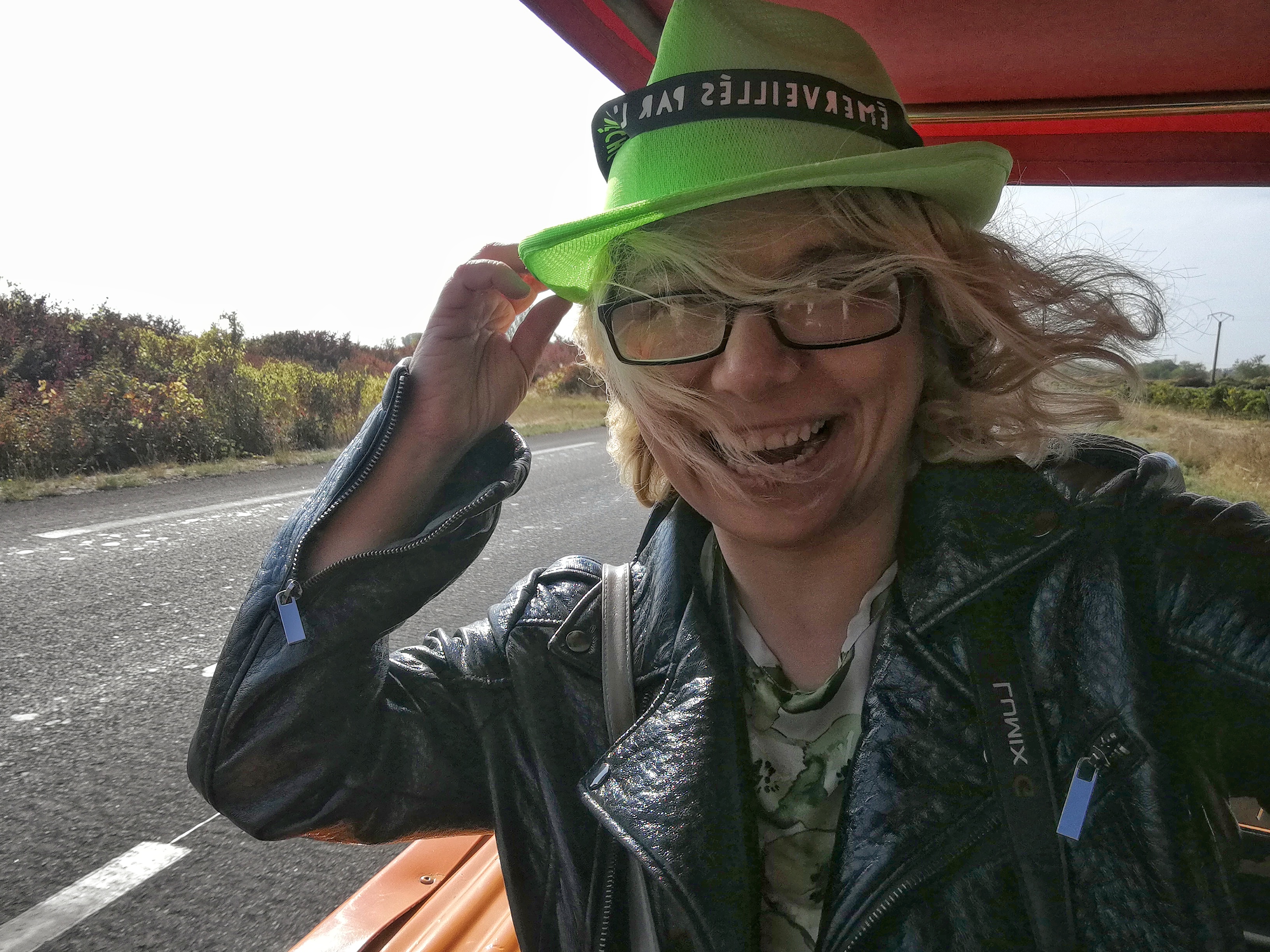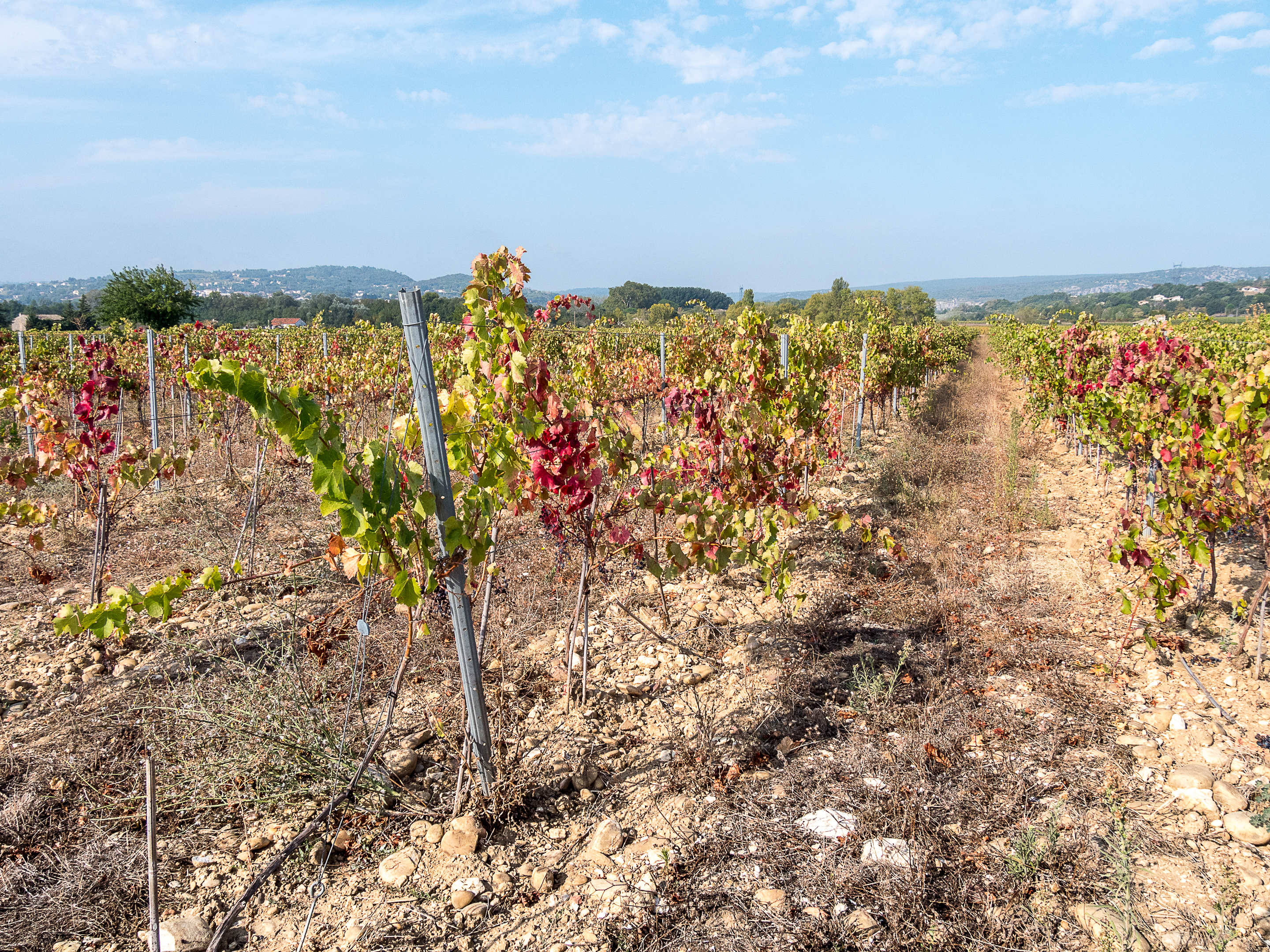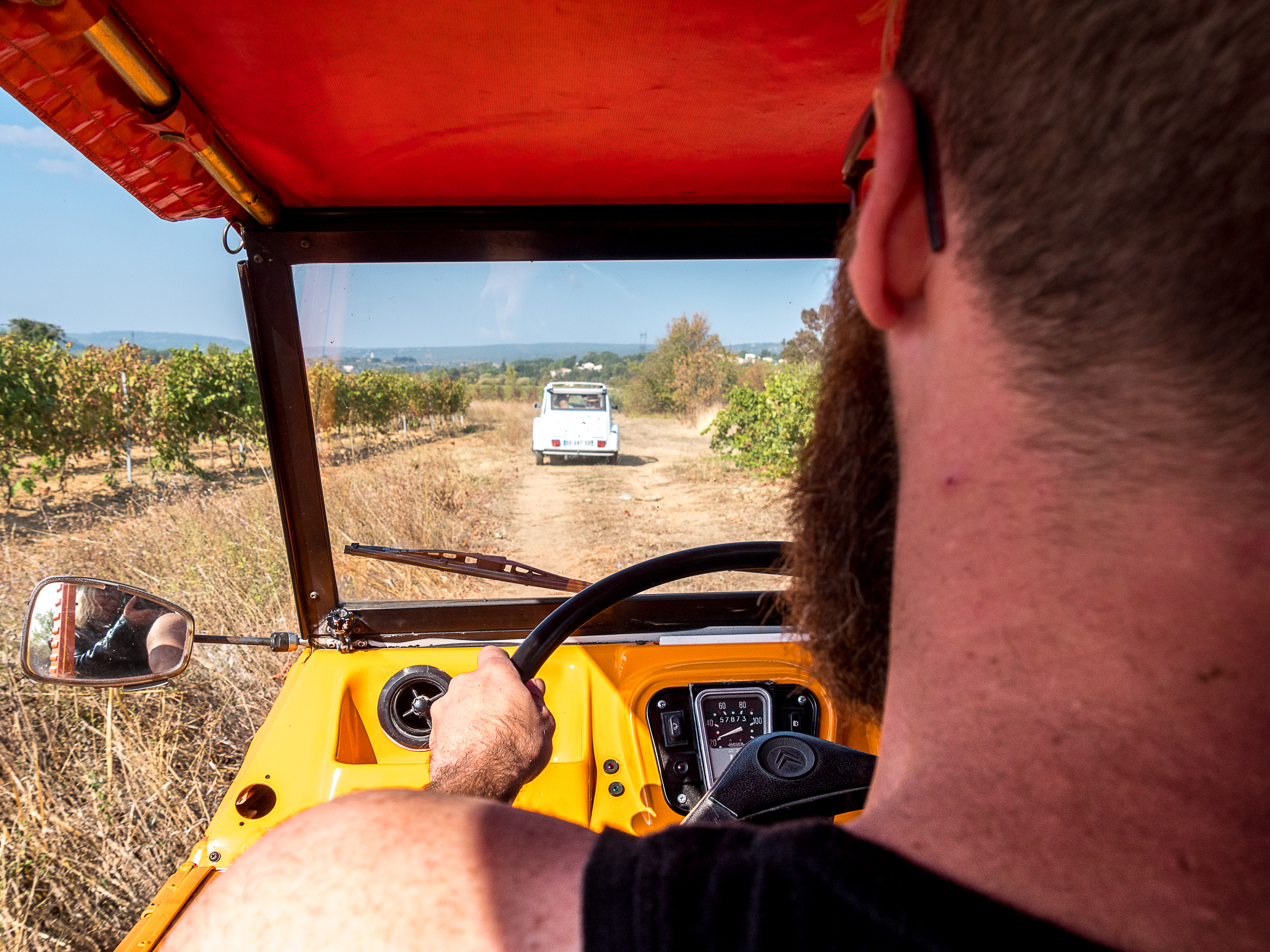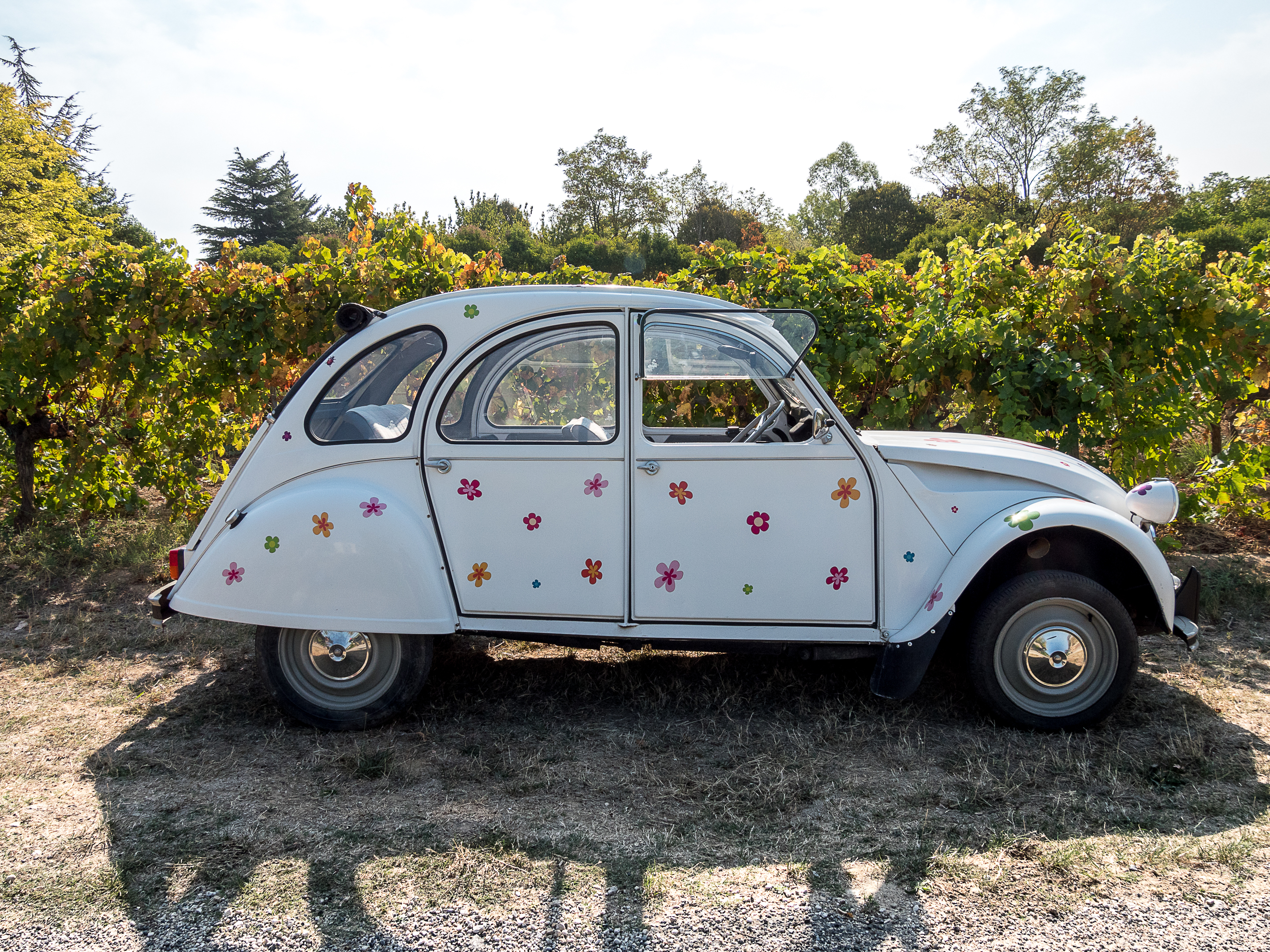 Dernière matinée en Ardèche, c’est à pied que nous nous rendons à notre dernière visite de domaine viticole : le Domaine de la Croix-Blanche à Saint-Martin-en-Ardèche. C’est Rose-Marie qui nous souhaite la bienvenue. Cette dynamique vigneronne, comme elle se définit elle-même, n’était pas née dans la vigne. Enseignante de métier, c’est en tombant amoureuse de Daniel, viticulteur, qu’elle est entrée dans la famille des vignerons. Le couple Archambault et leur fils Guillaume sont donc à la tête d’une exploitation qui est totalement passé au bio en 2013 et pour visiter les vignes, nous allons le faire avec style : à bord de véhicules vintage : des 2CV et une voiture que je ne connaissais pas : la Méhari. Un vieux modèle de Citroën qui semble plus avoir sa place dans la brousse que sur les routes de France. Détail amusant, la carrosserie est en plastique !