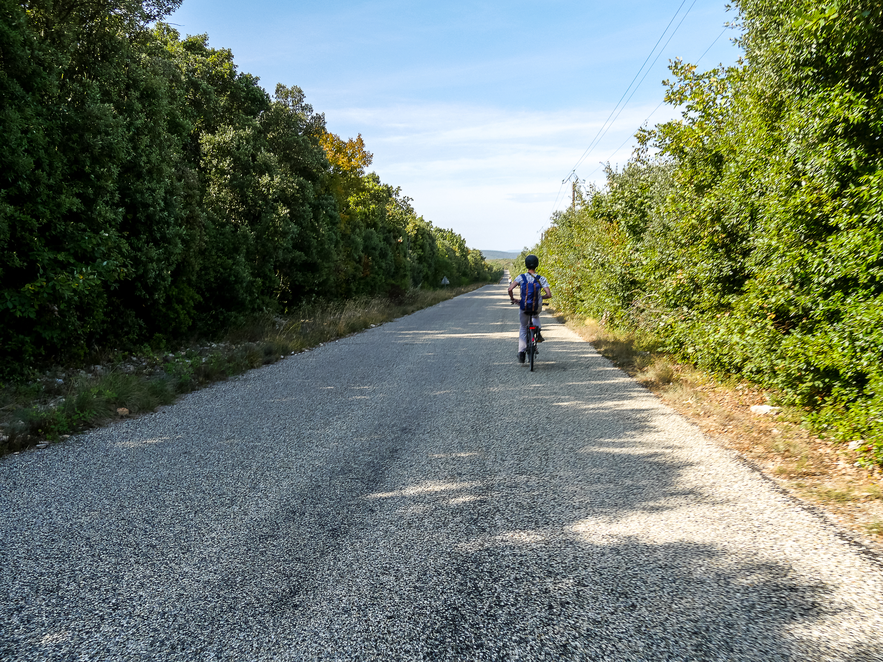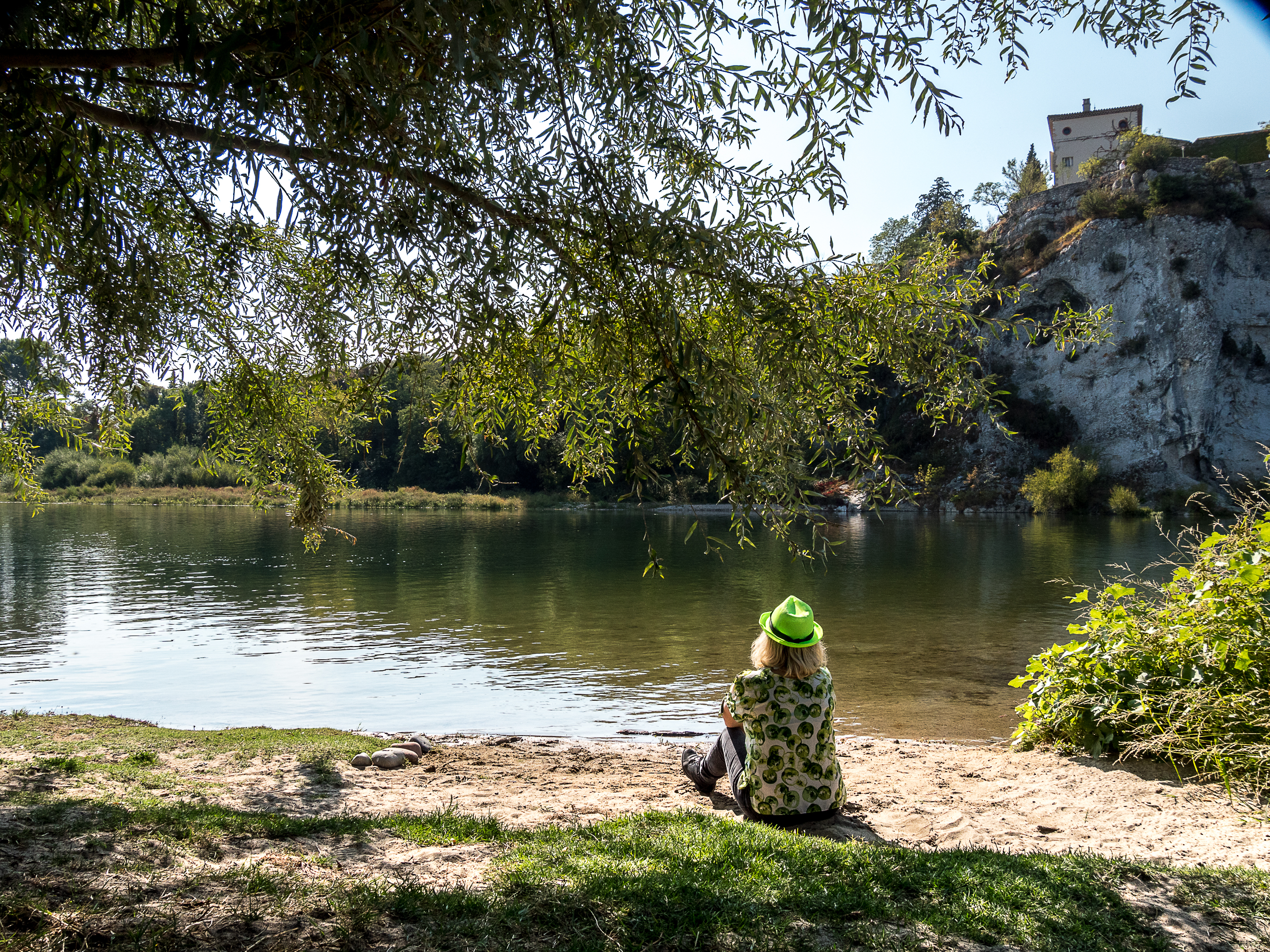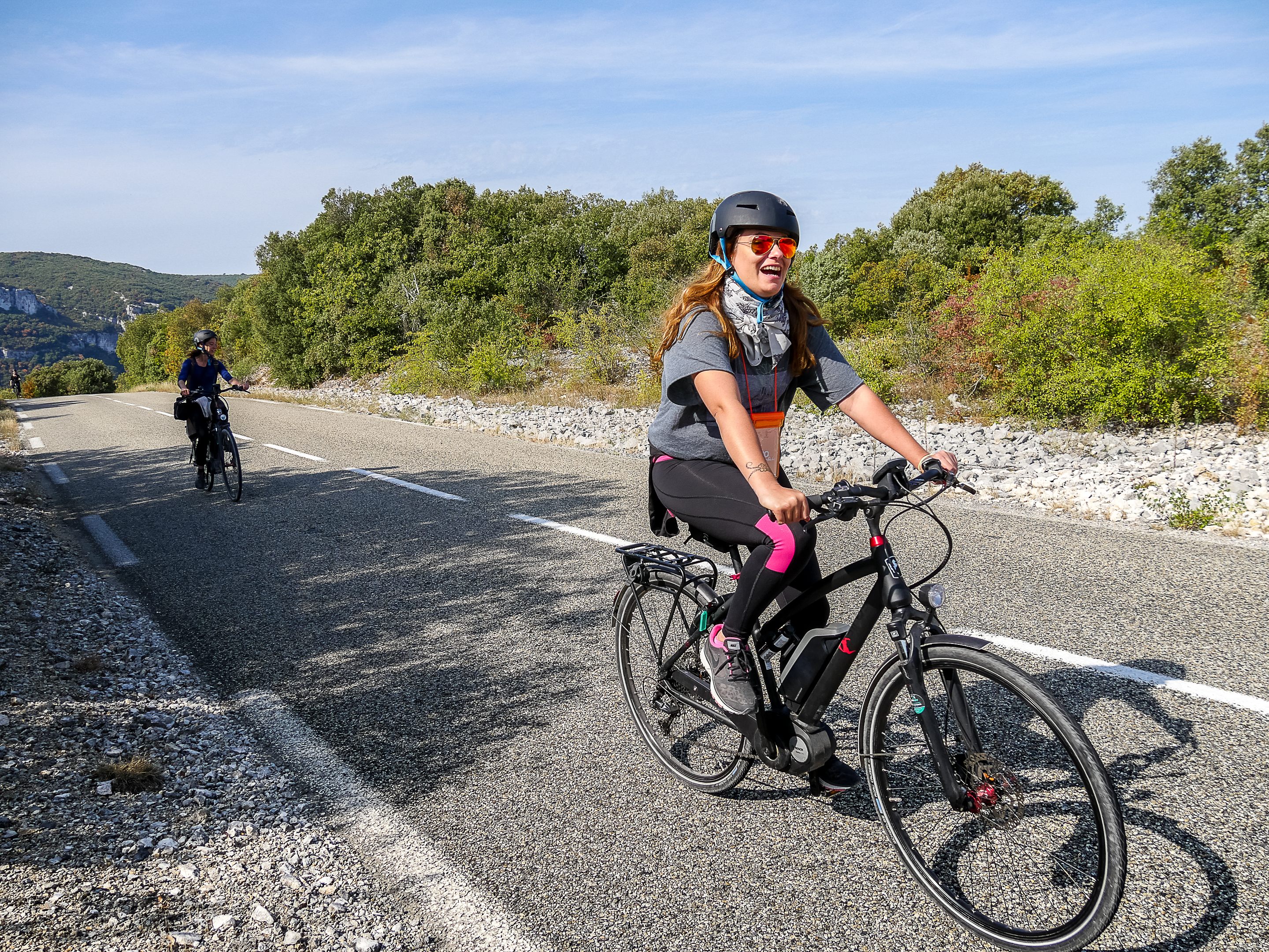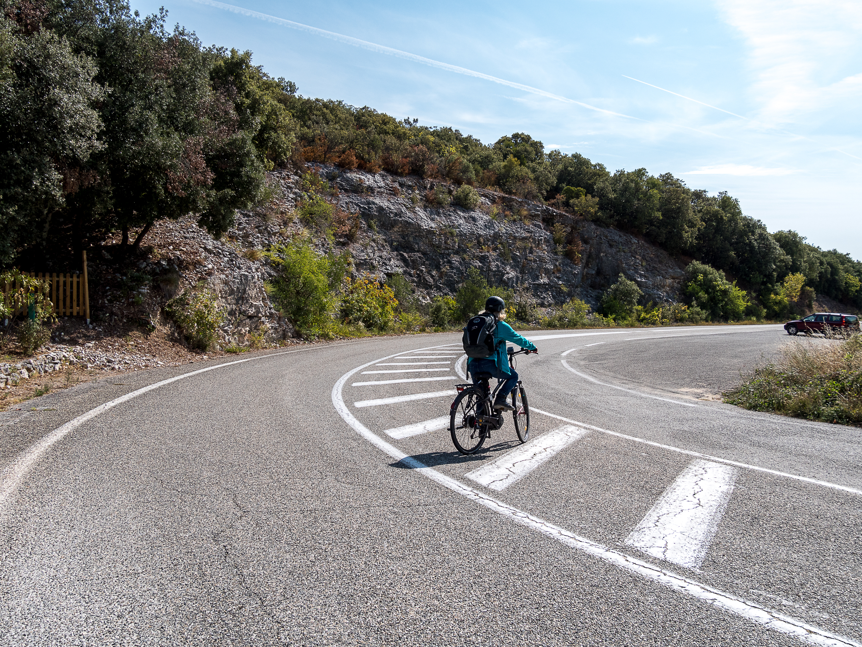 Le vélo électrique, j’y avais déjà essayé pendant mon séjour sur le ViaRhôna et une fois qu’on y a goûté, difficile de s’en passer, chaque coup de pédale vous propulsant littéralement ! Nous voilà donc partis, en ordre dispersé, pour rejoindre la Grotte de Saint-Marcel, via la Grotte de la Madeleine. Et le chemin est plutôt sympathique sur une route à travers les bois, il aurait fallu encore attendre 3 semaines avant d’avoir les jolies couleurs de l’automne mais elles s’annoncent doucement. Je profite, en tout cas, de ce goût de liberté qu’apporte le vélo : le vent sur mon visage, le jeu d’ombre et de lumière des feuilles d’arbres sur mes yeux, le sentiment de vitesse… mais de vitesse juste ce qu’il faut pour bien profiter du paysage.