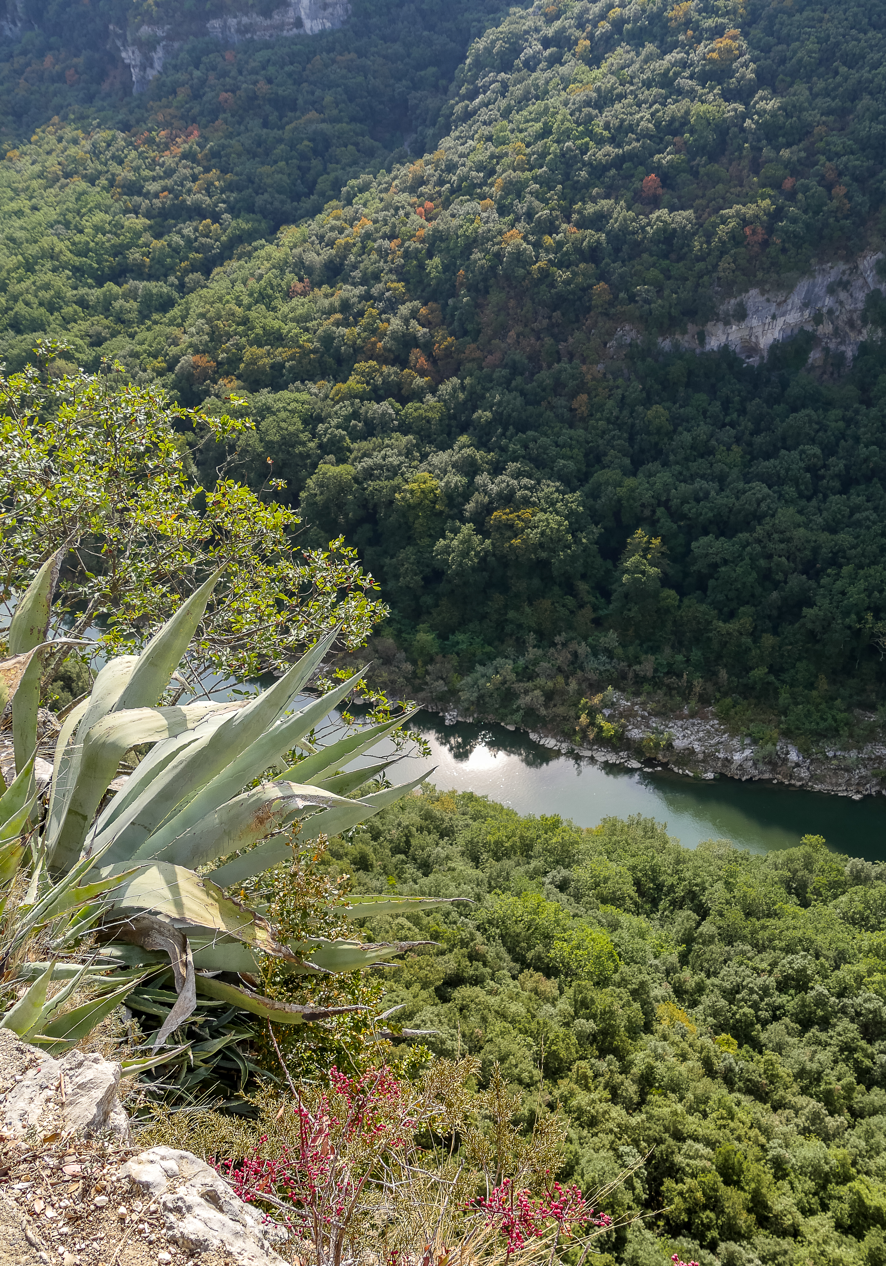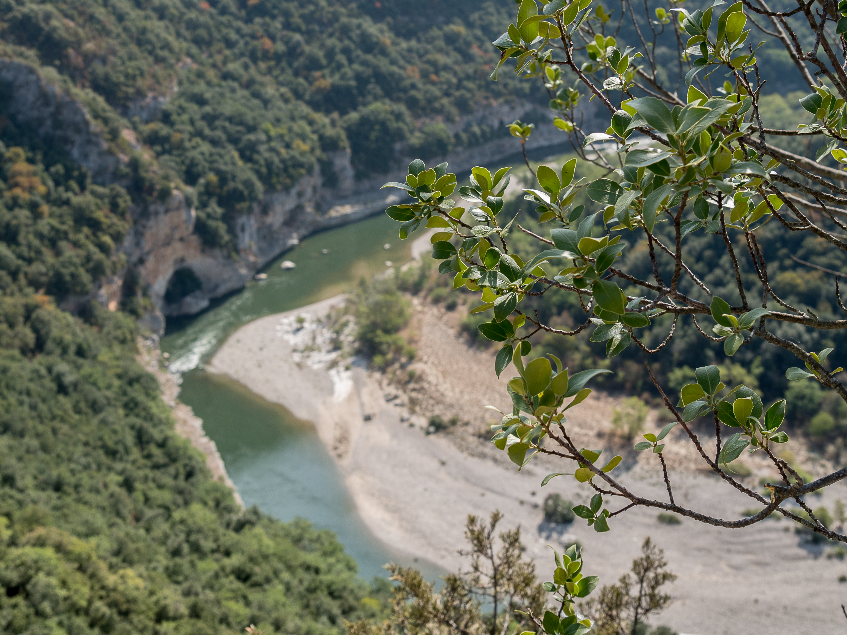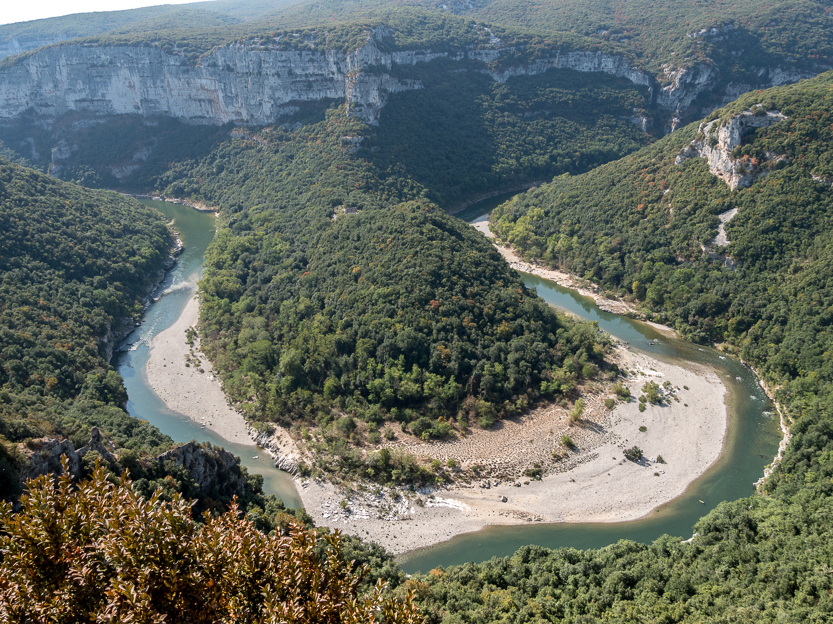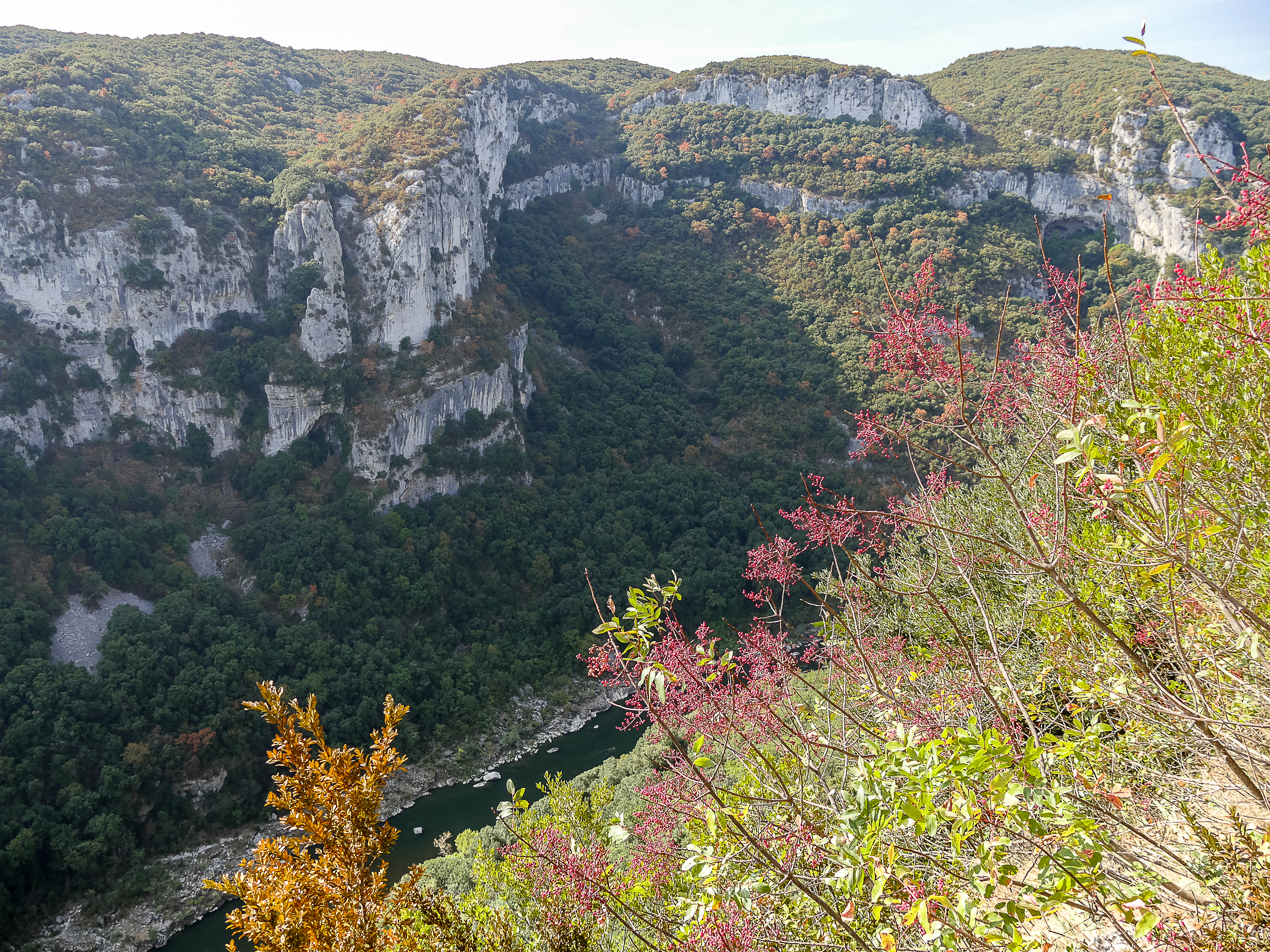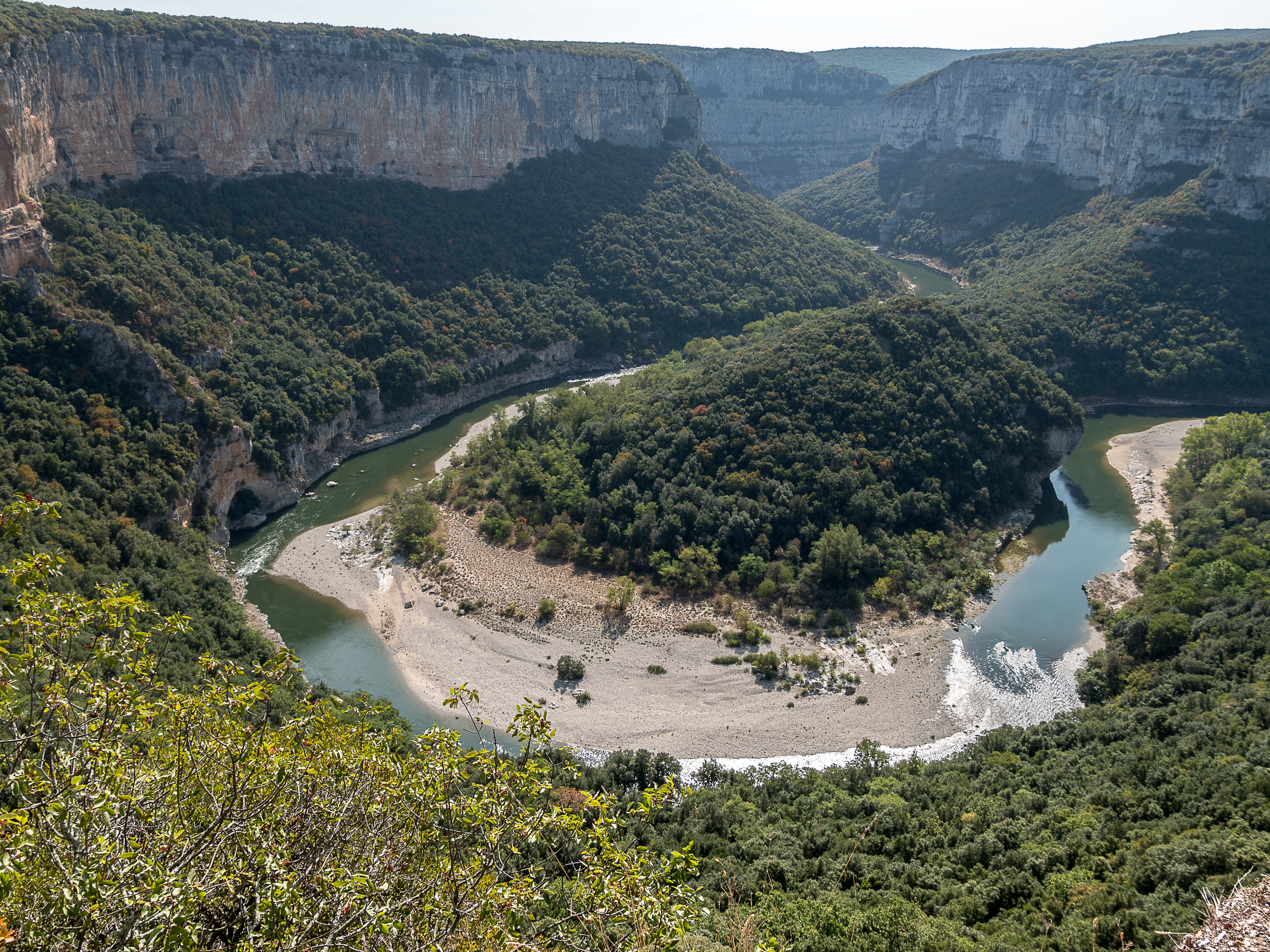 Après une grosse heure, nous abandonnons temporairement nos vélos devant le centre d’accueil de la Grotte de la Madeleine. Ca semble être un lieu touristique assez important, deux bus y sont garés et le Centre d’accueil, avec magasin de souvenir, est assez imposant. Malgré les apparences, l’entrée est gratuite et vous pourrez filer vers l’attraction principale du lieu : le Belvédère. Il offre une vue splendide sur une boucle de l’Ardèche dans son canyon et un accès à la petite grotte de la Madeleine. Dans ce coin d’Ardèche, les grottes sont légions ! Certaines furent habitées depuis l’enfance de l’humanité, comme la grotte de Chauvet et ses peintures rupestres. D’autres ont été découvertes bien plus tard.