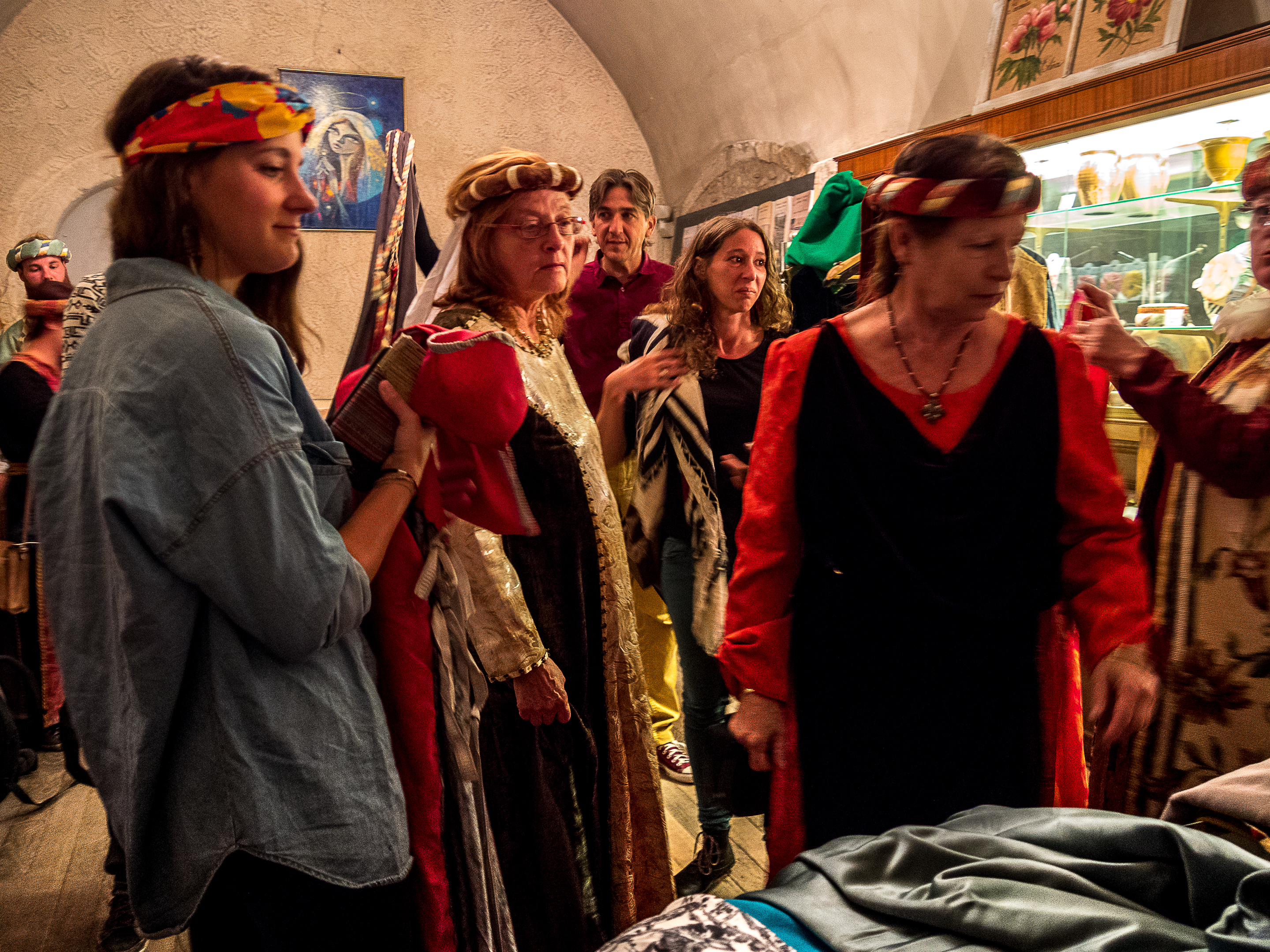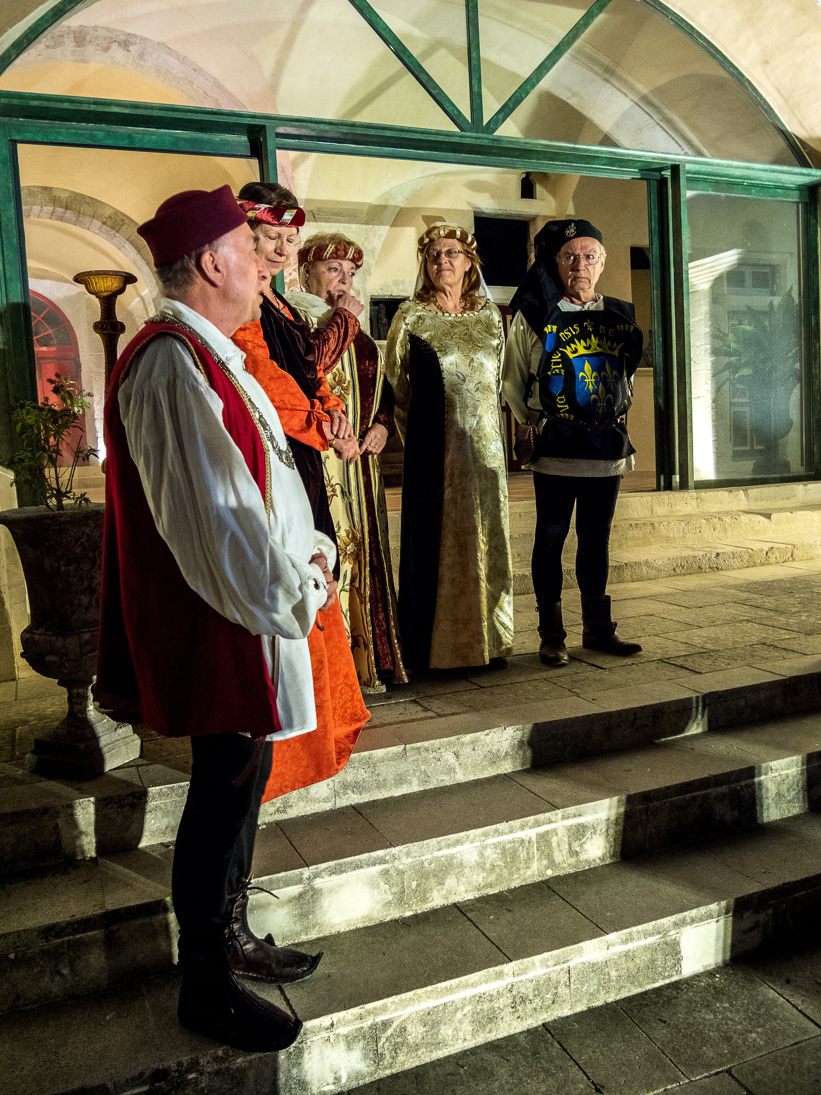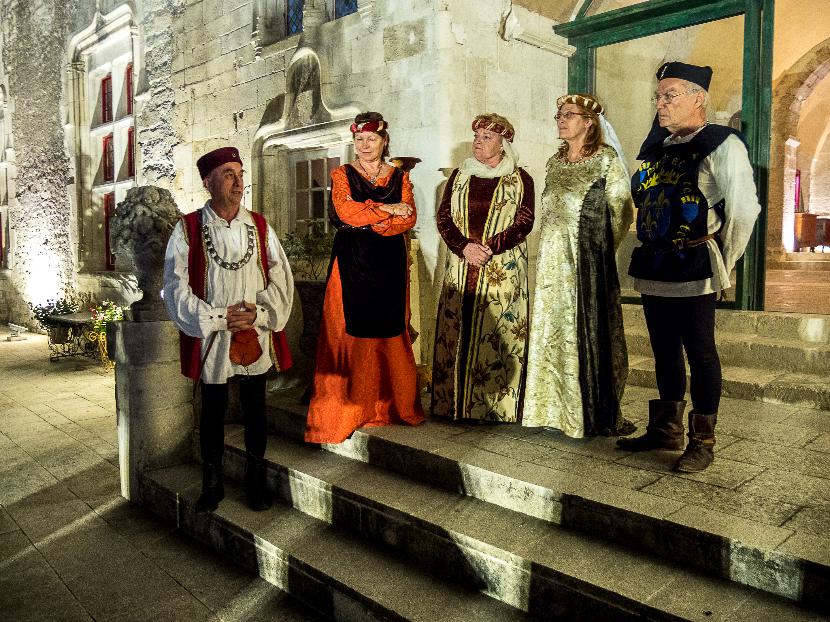 Le plus bel atout du Palais, c’est sa magnifique terrasse. C’est là que tous costumés, nous allons déguster des petits plats crées selon des recettes médiévales, mêlant souvent le sucré-salé et les épices : soupe de potiron au galanga, ou tourtes salées épicées à la cannelle. Des saveurs inattendues mais toutes délicieuses et bien entendu DU VIN que nous lèverons à la tonitruante devise du quartier du Palais : « Plus haut, Saint-Michel ! ».