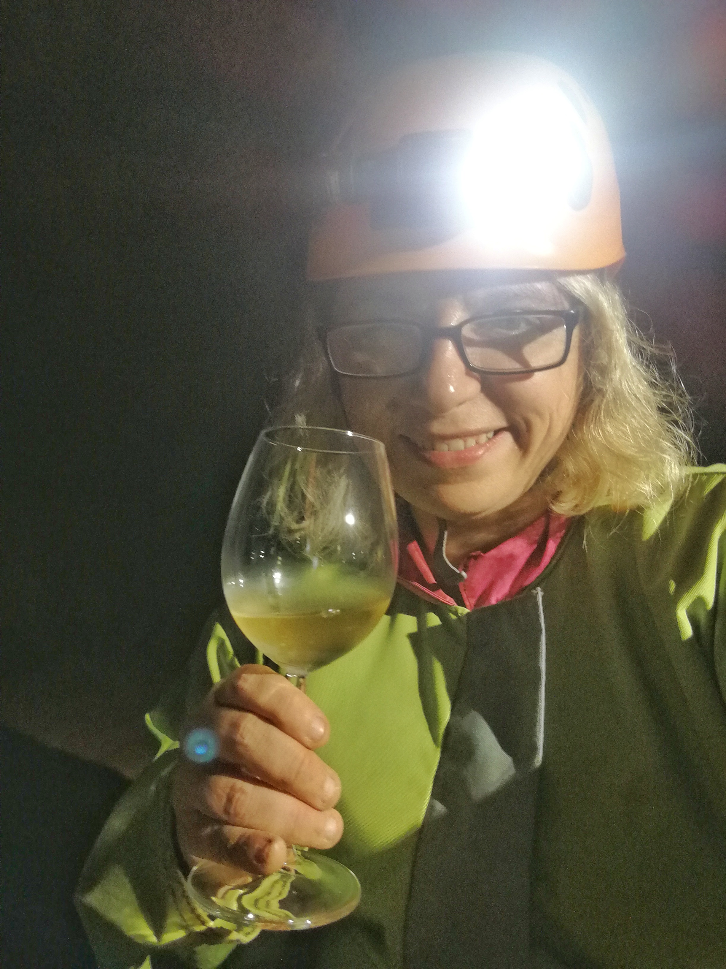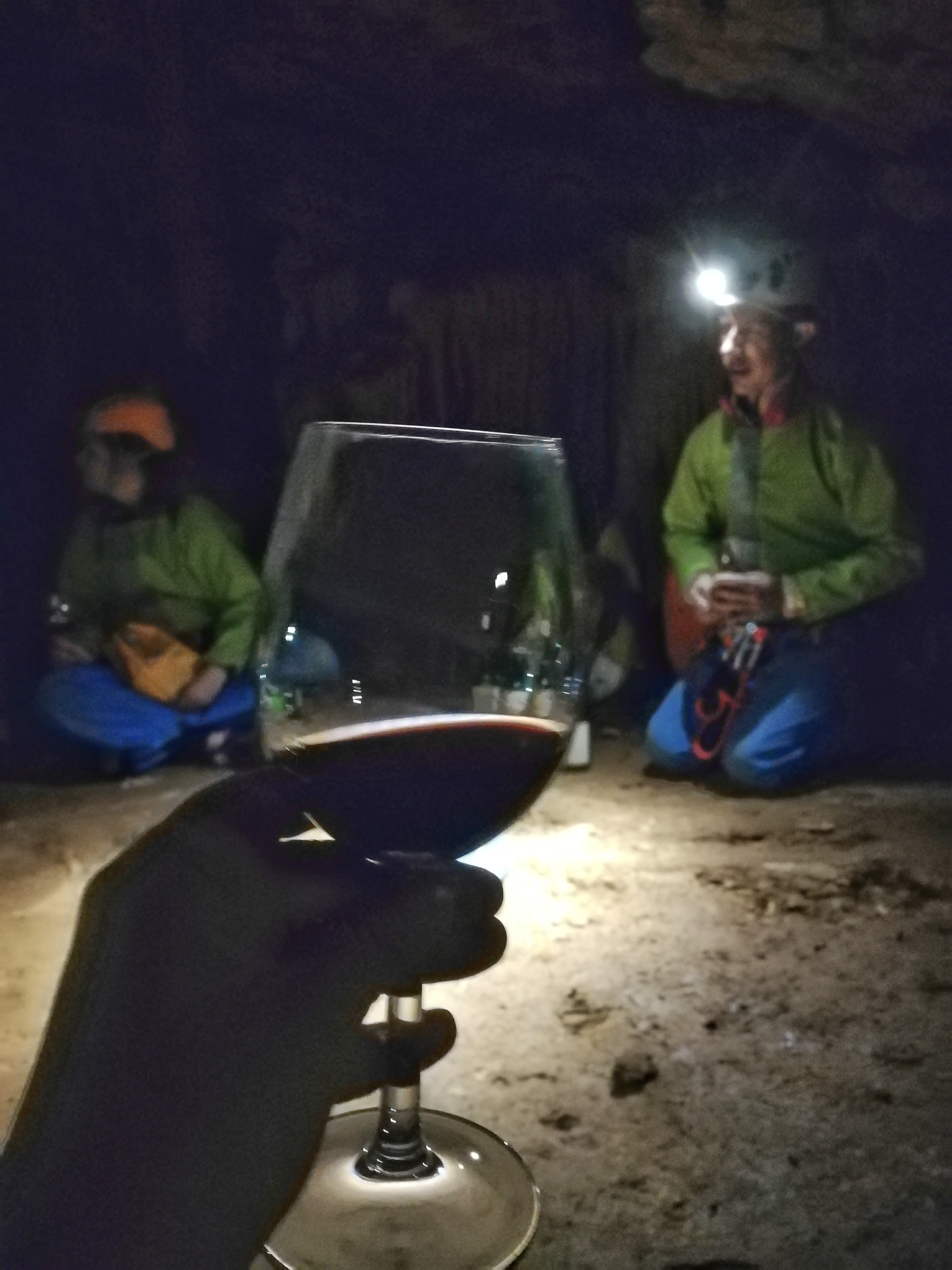 Je suis tellement concentrée sur ce que je fais que j’ai un peu de mal à apprécier ce qui m’entoure : stalactites, stalagmites, figures fantastiques issues des caprices de la nature.. je ne fais qu’entrapercevoir les choses. Finalement, nous arrivons dans une salle, c’est ici que nous ferons la dégustation : tout le monde s’assied en rond, les bouteilles et les verres sortent des sacs…