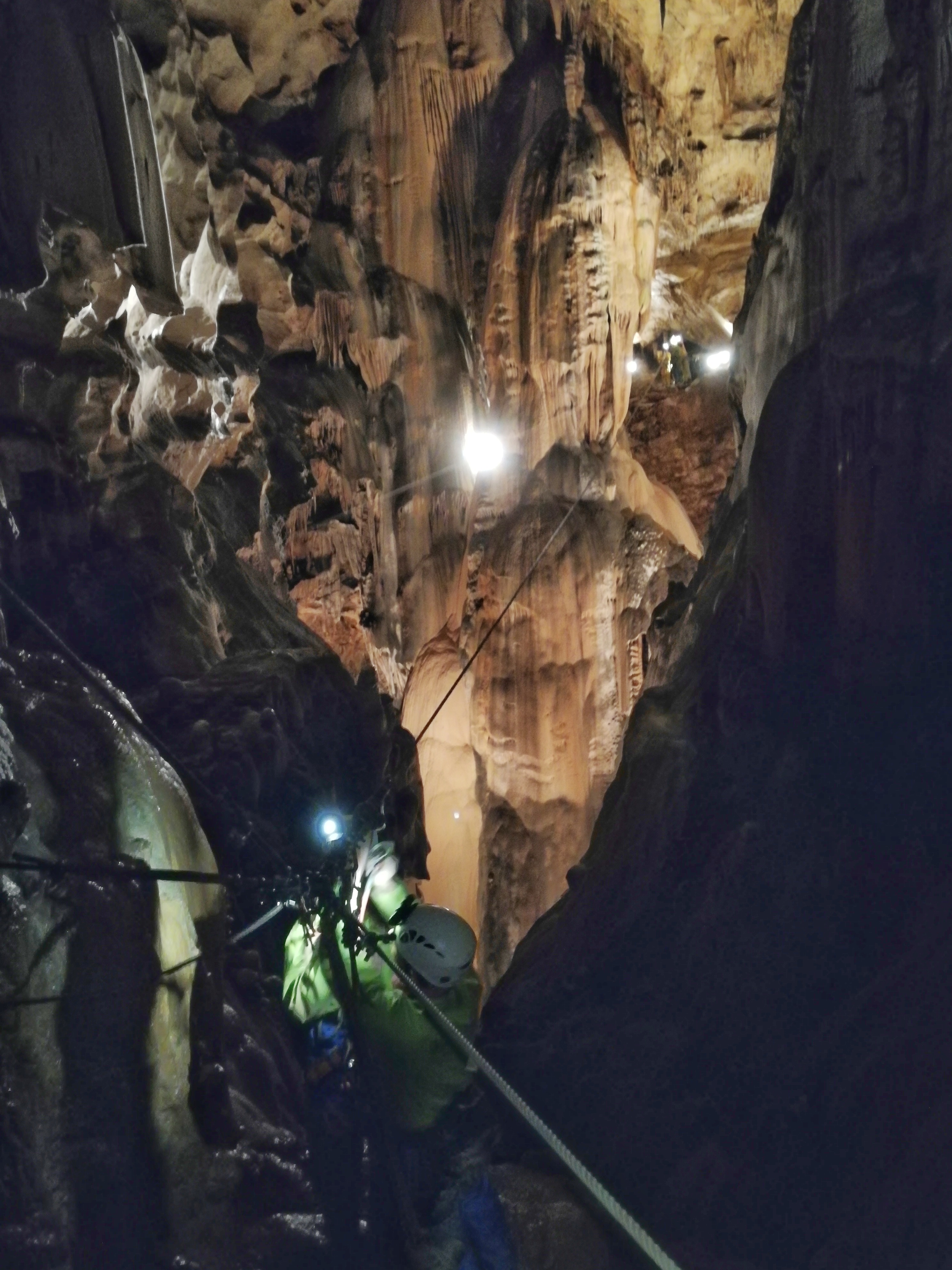 Des tyroliennes, j’en ai déjà fait mais dans une grotte immense avec un gouffre non moins impressionnant en dessous de moi, jamais et franchement.. ça le fait ! Pas le temps de se remettre de nos émotions ! Puisqu’on est en si bon chemin, pourquoi ne pas continuer avec un petit pont de singe ? Et allez, zou ! On commence face à une paroi rocheuse, histoire de ne pas être trop effrayés mais au milieu du parcours, on vous demande de vous retourner et là, c’est le spectacle d’une salle encore plus large que celle de la tyrolienne. Je la contemple alors que je suis quasi écartelée entre la corde qui supporte mes pieds et mes bras qui se tendent au maximum pour que mes mains puissent agripper la corde du haut. On dirait que je vais faire le saut de l’ange ! Très contente de moi, je termine le parcours… le reste ne sera plus qu’une petite promenade de santé ! Avant de quitter les lieux, nous allons jeter un coup d’oeil dans la grotte où le vin est entreposé. Rien de bien spectaculaire, je dois dire, c’est juste un casier où des bouteilles reposent bien à l’abri mais l’expérience de la dégustation est tellement insolite que ça vaut vraiment la peine de la tenter.