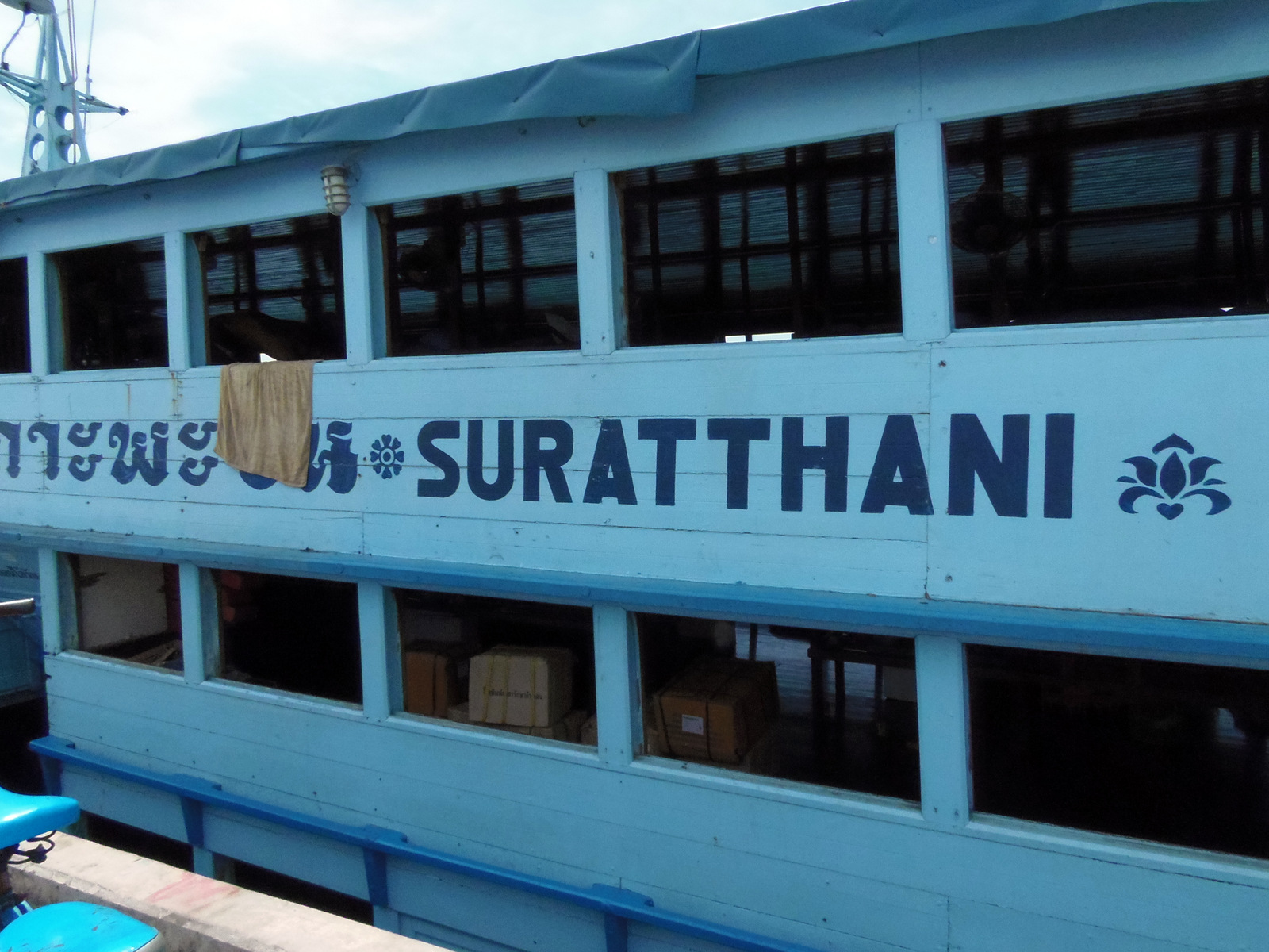 J’ai eu chaud! Pas que cela m’aurait dérangé de rester à Koh Phangan mais j’avais vraiment, vraiment envie d’arriver à Koh Tao, la tant vantée benjamine de l’archipel de Samui. Les places sur les bateaux sont limitées et après plusieurs essais par la réceptionniste, finalement, ce sera en début d’après-midi que je quitterai Phangan. Histoire que cette mésaventure ne se reproduise pas, une fois arrivée au port, je file direct au bureau local de Lomprayah pour réserver mon voyage de retour : le ferry et le bus, directement pour Bangkok. J’ai une petite heure à tuer avant l’embarquement et me balade dans les rues presque désertes de Thong Sala. On dirait bien que c’est l’heure de la sieste, des chiens paresseux sont allongés de tous leurs longs à l’ombre et ouvrent à peine un œil à mon passage. Je commande un coca dans un bar qui a vue sur la jetée d’embarquement, le sirote tranquillement pendant que la patronne câline son bébé. Les gens? Ils sont à l’intérieur du terminal… Je les retrouverai 20 minutes avant le départ. A côté de la zone d’embarquement, il y a les ferries de nuits. Des bateau largement ouvert avec des couchettes en bois alignés sur les côtés. C’est le moyen le meilleur marché pour voyager entre les îles… Rien qu’à les voir, ça suscite mon côté aventurier. Je regrette d’avoir si peu de temps pour pouvoir en tester au moins une fois!