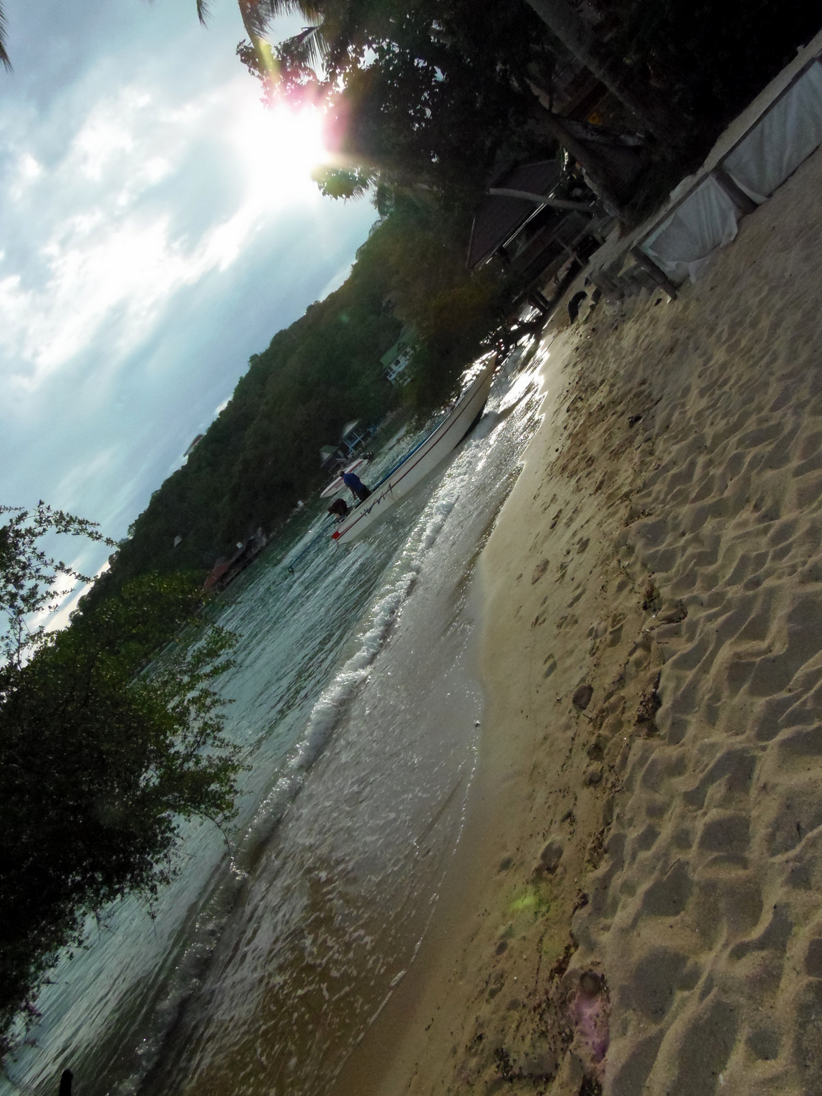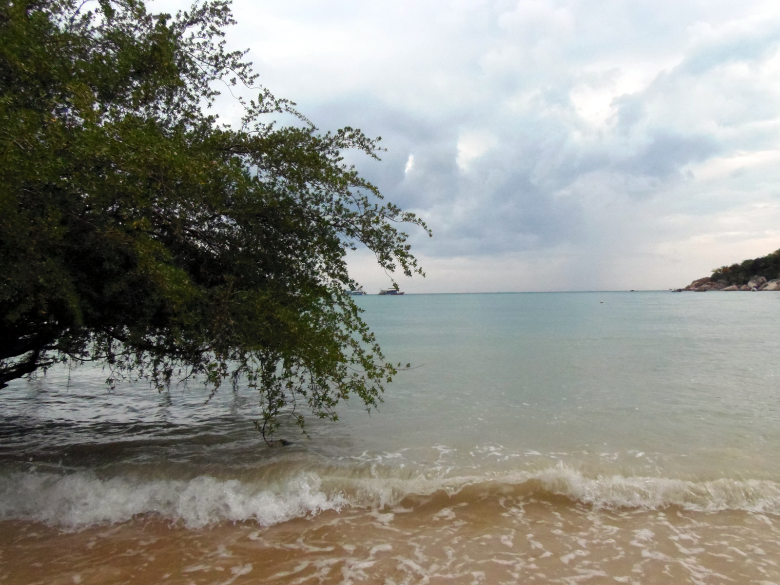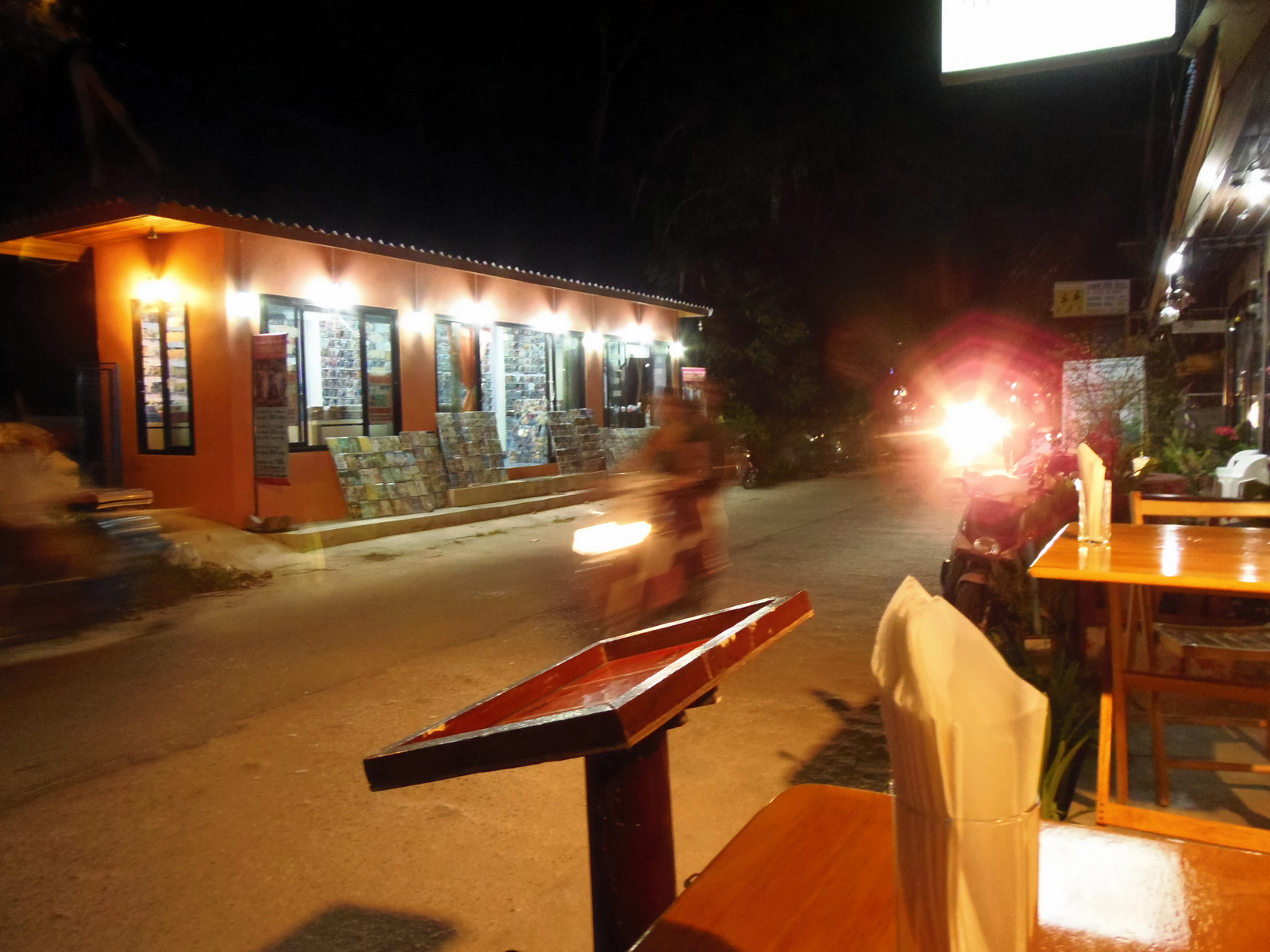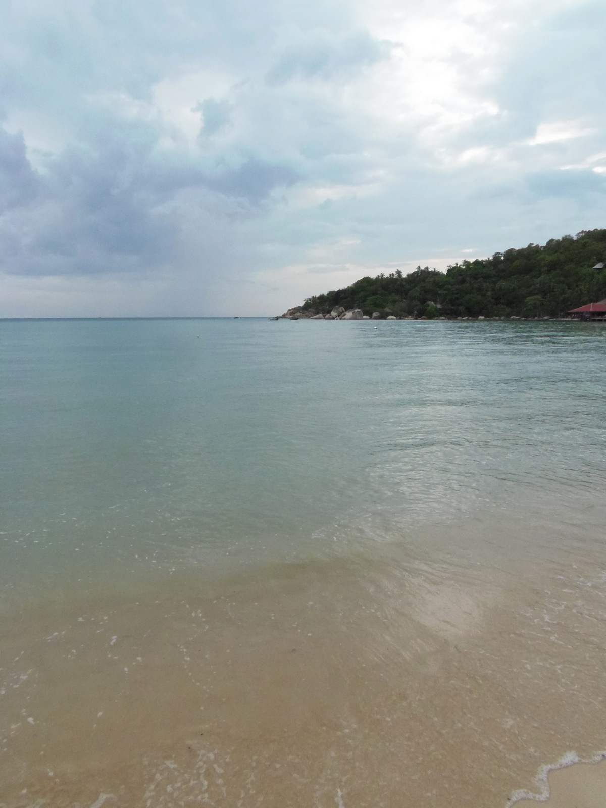 Il fait un peu gris mais le soleil arrive à se frayer un passage entre les nuages, éclairant la plage comme un spot de théâtre! Comme la faim se fait plus que sentir, je commande mon énième tom kha kai et déguste en regardant le soleil se coucher. Avec un ciel tout chargé, la nuit tombe encore plus vite et je m’aventure dehors.