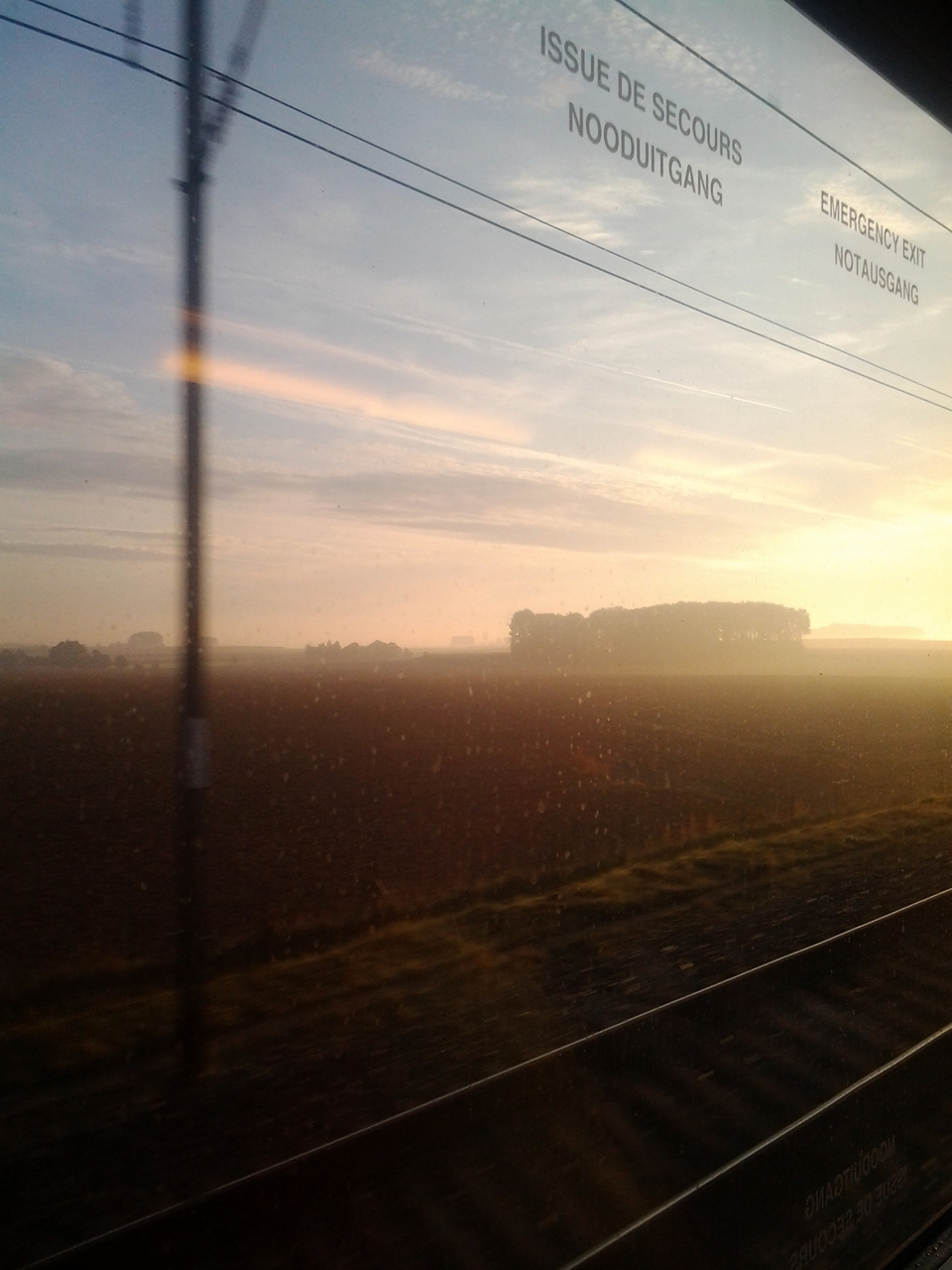 J’ai eu la chance de la prendre à l’aube, de ces petits matins de début d’automne, frais et pur… avec assez d’humidité pour qu’une brume plonge le paysage dans le mystère, mais une fois le soleil levé, il brille avec un reste d’éclat d’été. Calée dans mon siège pour une personne, je mâchonne rêveusement un croissant… privilège de la classe Confort 1, le petit-déjeuner nous a été servi. Je regarde les petits villages que l’on dépasse, avec cette rapidité, ca va vite, très vite! Je me demande si on a passé la frontière! Une demi-heure devrait suffire à franchir la distance qui sépare Bruxelles de l’Outre-Quiévrain. C’est finalement mon smartphone en mode vibreur qui m’annonce que je suis en France, les messages de bienvenue le font sautiller sur la tablette comme s’il avait la danse de Saint-Guy. La lumière dorée du matin noie les autres voyageurs… la plupart des hommes d’un certain âge en costard. Les habitués du Thalys doivent avoir mené leurs propres études sociologiques!