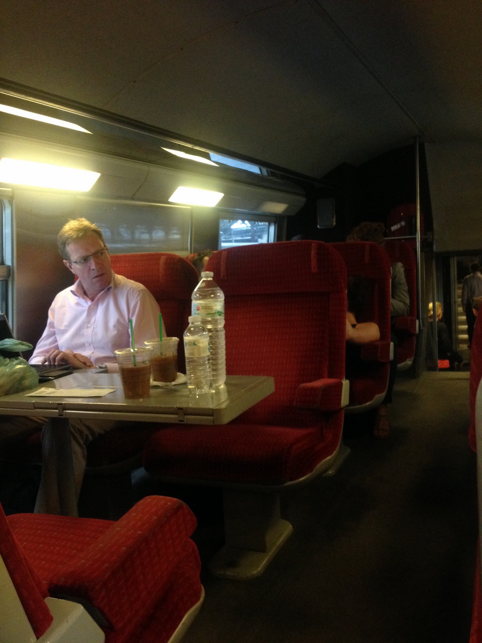 Dans le train, je suis entourée d’Américains, tous aussi excités les uns que les autres. Le Havre est un grand port de croisière et c’est le jour de l’Embarquement pour de nombreux croisièristes. Des couples jeunes ou vieux, en casquettes et baskets réglementaires, tout contents de retrouver des compatriotes, s’arrangent et papotent, qui venant de Upstate NewYork, qui de Floride ou de l’Oregon… Après la première heure d’excitation, le calme revient et la fatigue me gagne. Moi aussi, je commence à somnoler, même si j’essaie de me tenir éveillée entre quelques gorgées de soda caféiné (et sans sucre) et un chapître de « A Feast for Crows ». Si vous prenez ce train, prévoyez un petit quelque chose à boire.