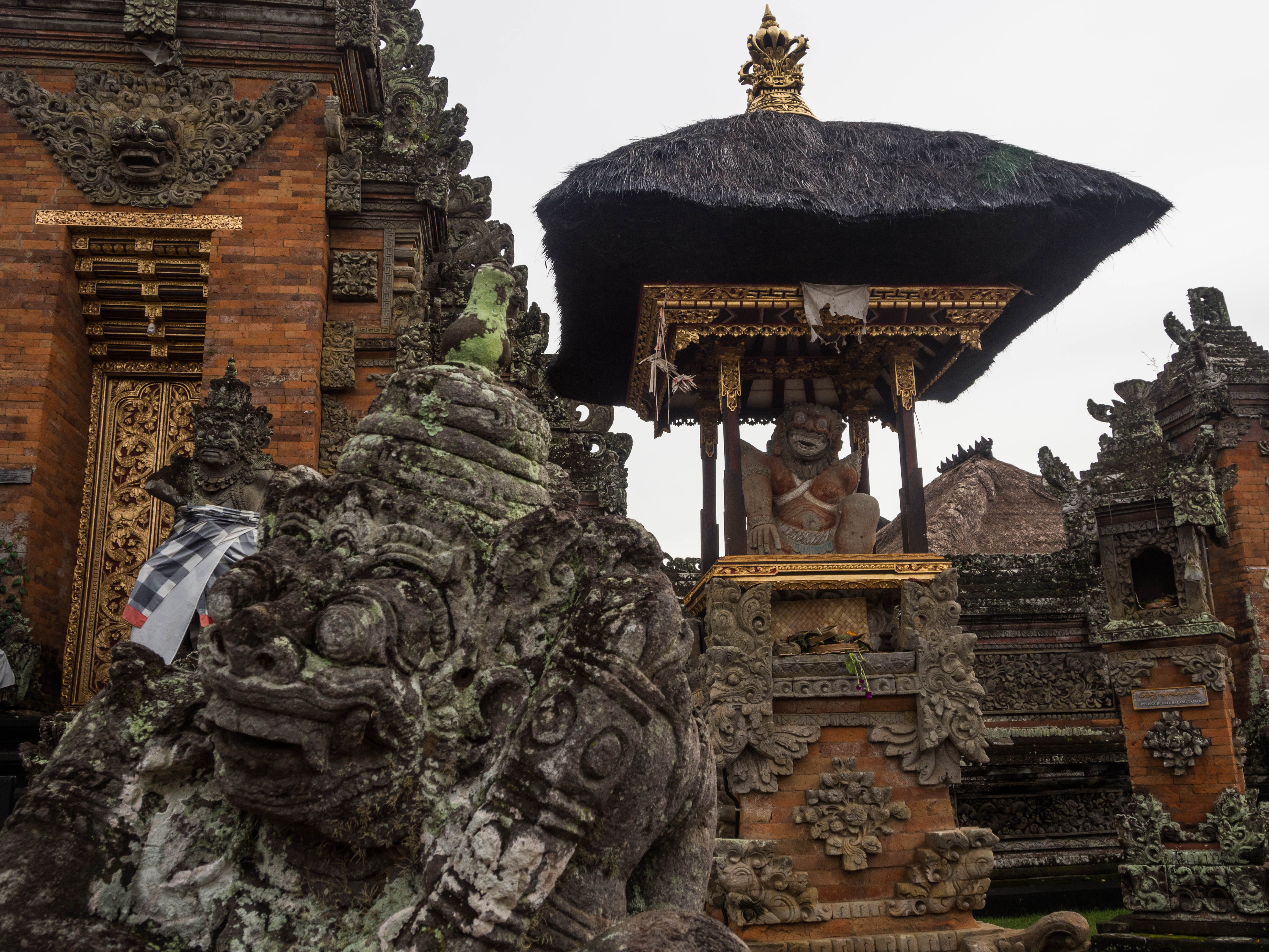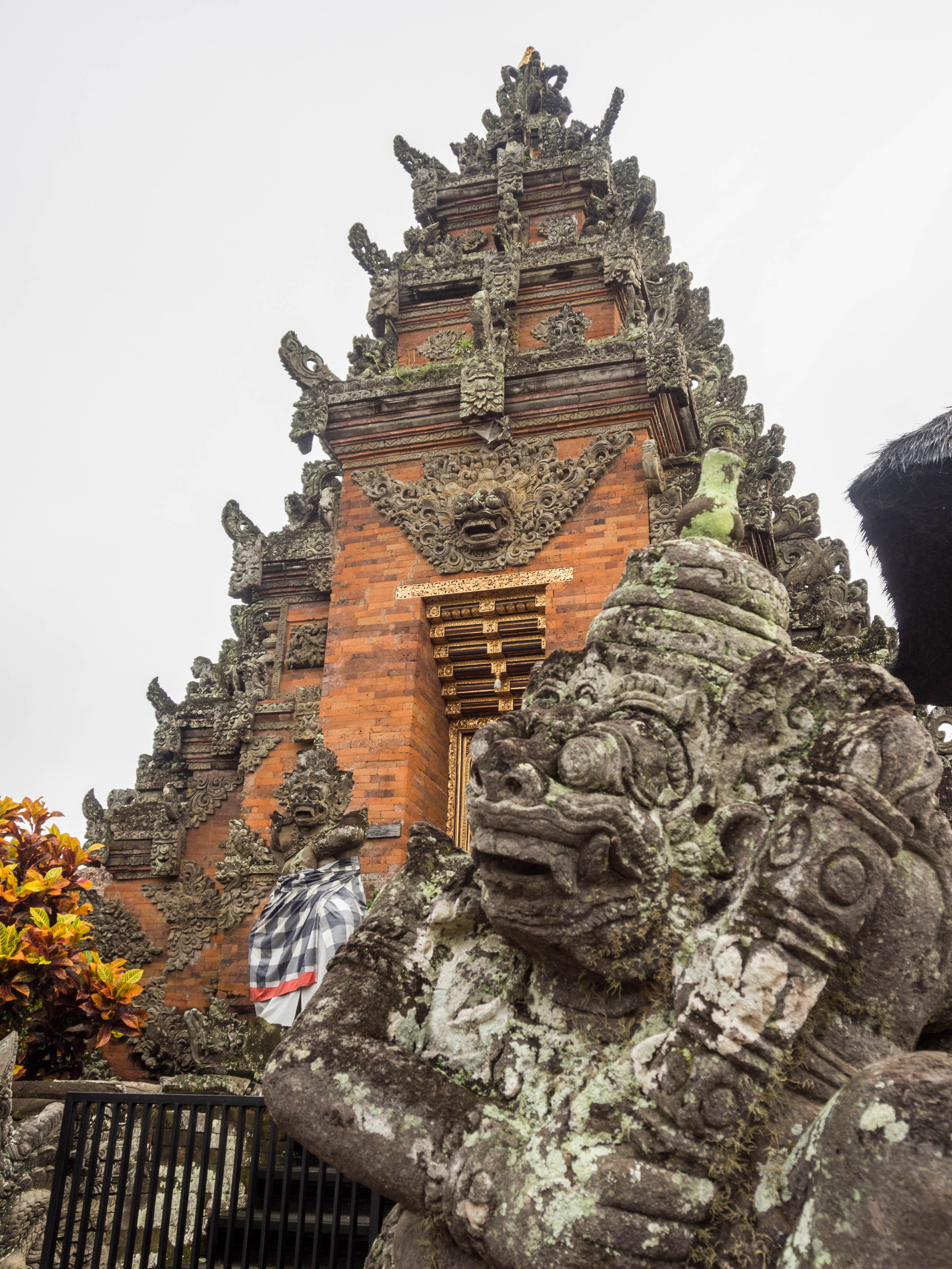 Autre chose qui m’aura étonnée, ce sont les tissus qui entourent les statues. Je m’attendaient à des couleurs et motifs extravagants, comme on peut les voir sur du batik mais non ! Si le jaune et le blanc, couleurs du soleil et de la lune sont très utilisés, c’est un motif en damier noir et blanc qui m’aura intriguée. On trouve des tas de statues enveloppées dans un sarong avec ce motif, même des pierres considérées comme sacrées. Comme nous sommes à Bali, il y a bien entendu une signification. Le « salut toleng » est en fait une leçon de vie. Les carrés complètement noirs et blancs symbolisent les valeurs qu’il est facile à reconnaître : le bien et le mal, la joie et la tristesse… les carrés intermédiaires où les deux nuances sont côtes à côtes signifient que des moments de la vie ne sont ni complètement bons, ni complètement mauvais, qu’il peut y avoir une part de tristesse dans la joie, que le chemin vers le mieux est l’apprentissage des erreurs passées. C’est en fait une représentation d’un certain équilibre. Tout çà dans un bout de tissu et quelques carrés.