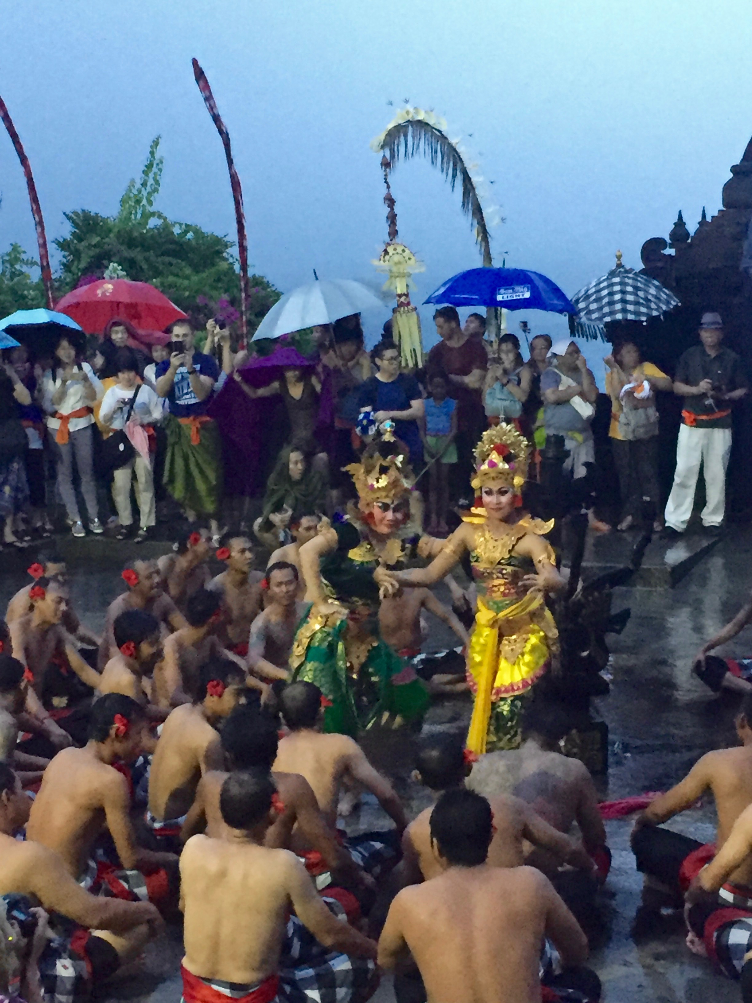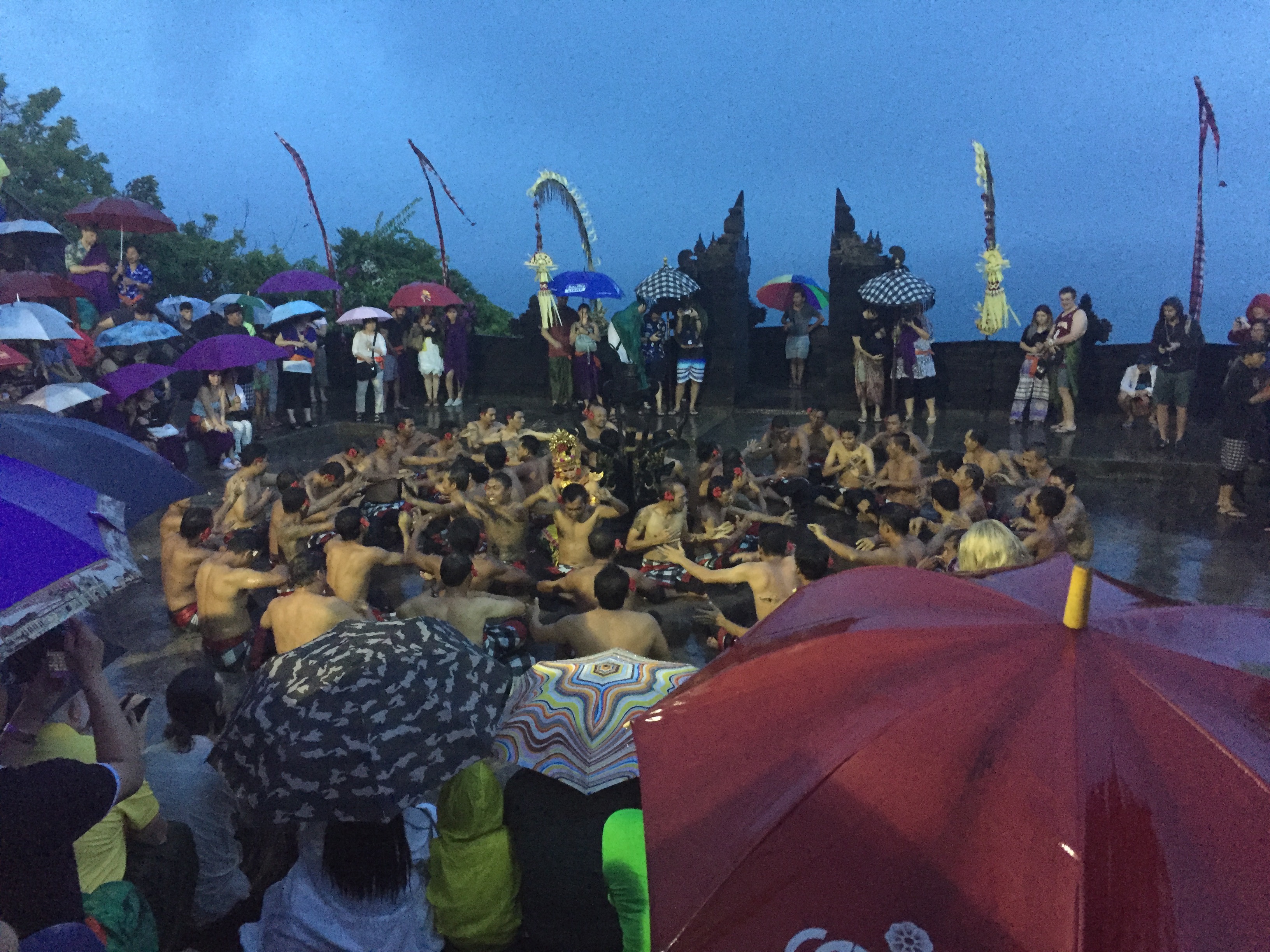 Pendant le long de la visite, le ciel s’est assombri sur Uluwatu, apportant un aspect dramatique aux lieux mais les trombes de pluie qui se tenaient au large se rapprochent dangereusement… néanmoins, le spectacle commence.