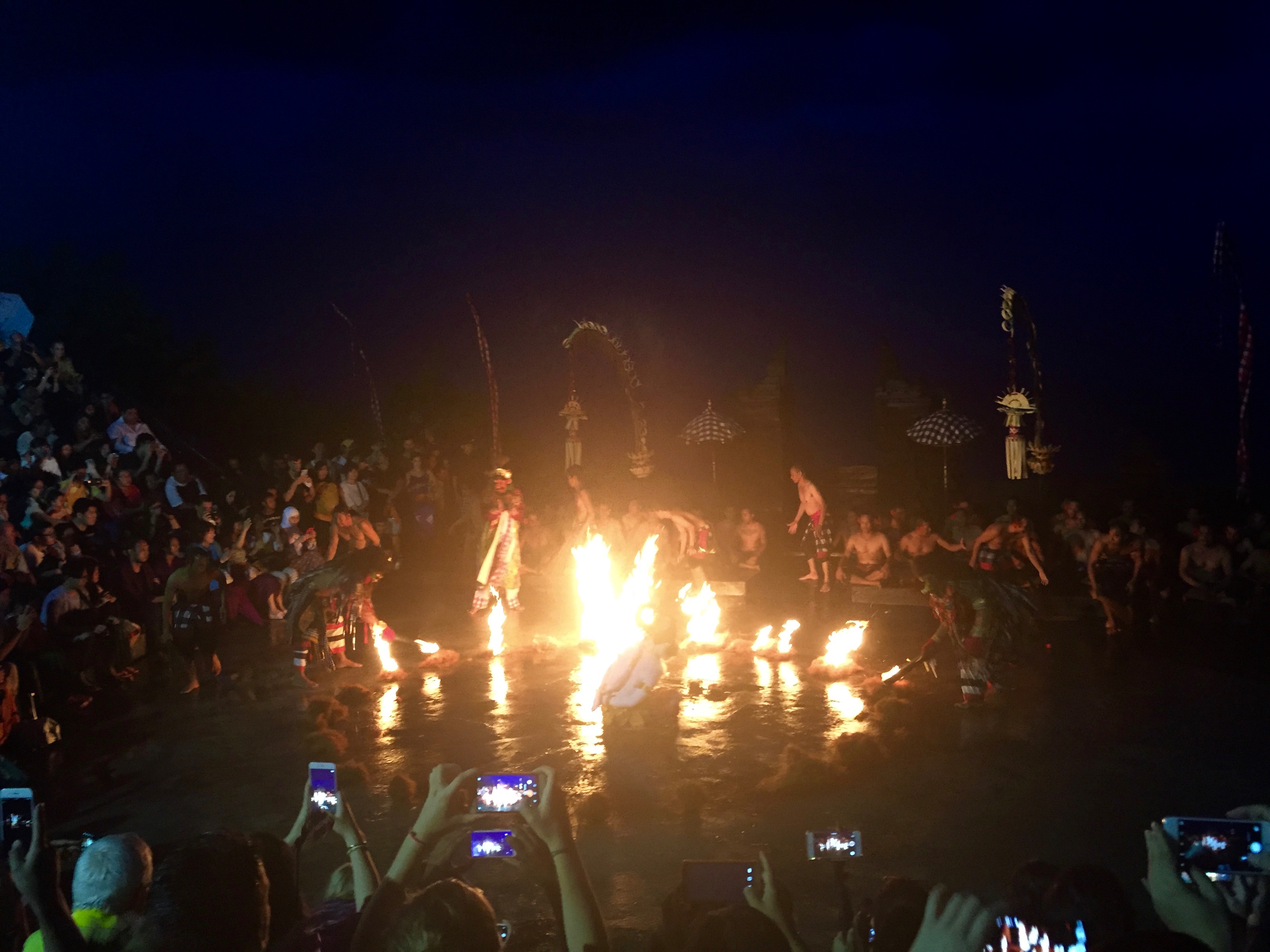 Le Kecak, c’est quoi ? C’est avant un chant… ou plutôt des percussions vocales où un choeur d’une centaines d’hommes scandent « tchak-a-tchack-a-tchak » a des rythmes différents, avoir un chorégraphie ce qui donne un côté hautement hypnotique à la chose. Je sais, dis comme çà, Lectrice, Lecteur, ça n’a pas l’air comme étant le kiff du siècle mais quand on le voit en vrai, on se laisse bercer et emporter par cette litanie lancinante. C’est comme si tout le monde existait et pulsait avec cette étrange vibration. Pas étonnant que traditionnellement, le Kecak faisait partie des transes rituelles mais à partir des années 30, des Occidentaux ont commencé à s’y intéresser, notamment l’artiste allemand Walter Spies qui eut l’idée de mettre en scène une partie du « Ramayana » avec un choeur de Kecak. Depuis, l’idée a pris et les spectacles de Kecak font maintenant partie intégrante de la culture balinaise. Sur un coup de tonnerre, s’ouvre la scène de l’enlèvement de Sita par le terrible Ravana et en moins de deux, c’est la débandade dans les gradins ! C’est un véritable rideau d’eau qui se déverse sur public et artistes. Imperturbables, les danseurs continuent leurs gestes lents et précis, tandis que les « tchack-a-tchack » continuent de battre rythme comme si de rien n’était. Emma et moi essayons tant bien que mal de nous protéger avec mon coupe-vent, devenu bâche pour deux mais rien à faire, l’eau dégouline de partout et en quelques minutes, je suis aussi mouillée que si je sortais de la douche. Une bénédiction des dieux qui s’interrompra un peu pendant la scène où Hanumân, général de l’armée des singes, se joue d’un cercle de feu où on tentait de l’emprisonner.