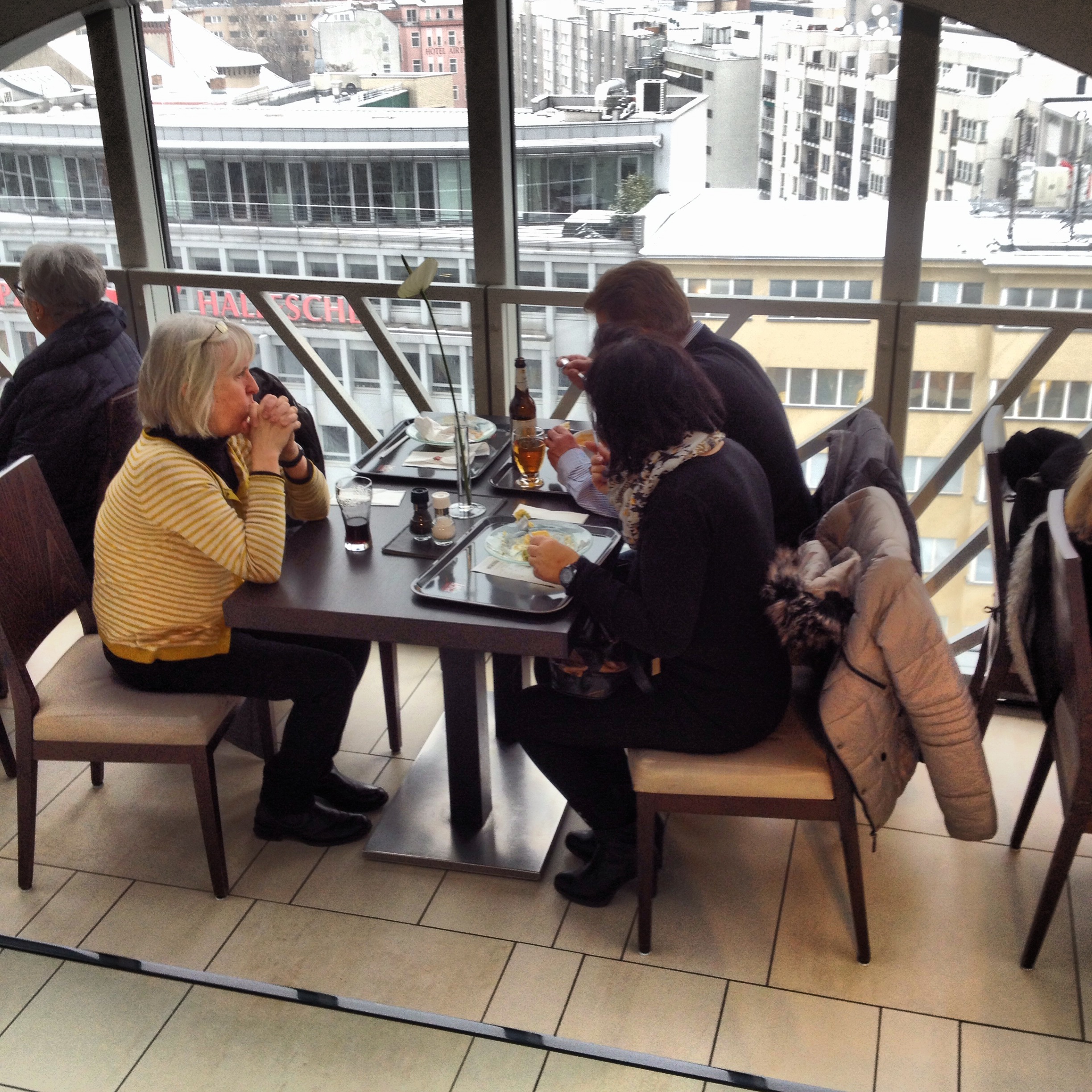 De retour sur Wittenbergplatz nous voilà bel-et-bien rentré dans le capitalisme. La station de métro à l’air d’un petit temple romain et tout à côté, se trouve le KaDeWe, le Kaufhaus des Westens, un « grand magasin », dans le sens noble du terme. Cinq étages dédiés aux plaisirs du shopper, puis au 6e et 7e, aux plaisirs des gourmands. Et quand je dis « shopper », je parle de gros budget. Les marques de luxe se bouscule dans l’atrium: Tiffany’s, Burberry, Hermès, Dior, Chanel… et au centre, il y a même un espace pour de nouvelles collections de jeune créateurs (cocorico, Cédric Charlier en faisait partie). Mais guidée par la faim, c’est surtout les deux derniers étages qui m’intéressaient. Le 6e se partage entre épiceries de luxe et petite échoppe où l’on peut déguster des snacks les plus appétissants que j’ai jamais vu quand au 7e, il s’agit d’un immense buffet, le Winter Garden, qui est le seul endroit du magasin qui voit la lumière du jour, grâce à sa grande verrière. On y trouve différentes stations: un salad bar, des spécialités berlinoises, italienne, asiatiques, un grill… mais ce qui impressionne le plus, ce sont les desserts avec une montagne de gâteaux de 15cm de haut. Un filet de bave est en train de naître à la commissure des lèvres rien qu’à l’écrire, Lectrice, Lecteur et pourtant, j’ai résisté. Je me suis jetée sur un rôti sauce champignon, avec ses « kartofells »… parce qu’on est en Allemagne. Et qu’après cette généreuse portion, je n’avais vraiment plus envie. Depuis, j’ai envie d’y retourner, même si, dans la navette qui m’emmenait, ainsi que d’autres participants de la petite sauterie de la veille, à l’aéroport, une journaliste bien plus aguerrie que moi, jurait que c’était quand même un crime d’avoir un buffet « qui rassemble à une cafétéria » au dessus d’un magasin aussi classe. Par contre, elle recommande grandement leur petit-déjeuner au champagne Pommery (une bonne affaire).