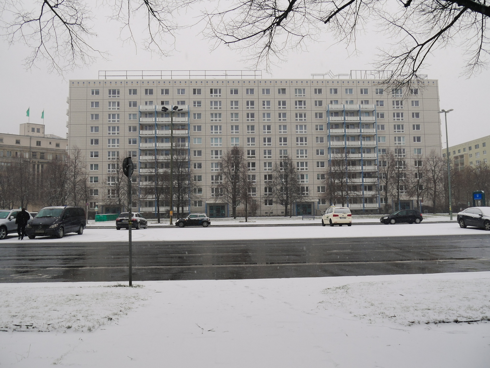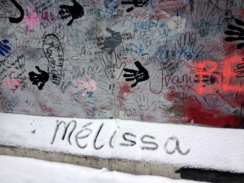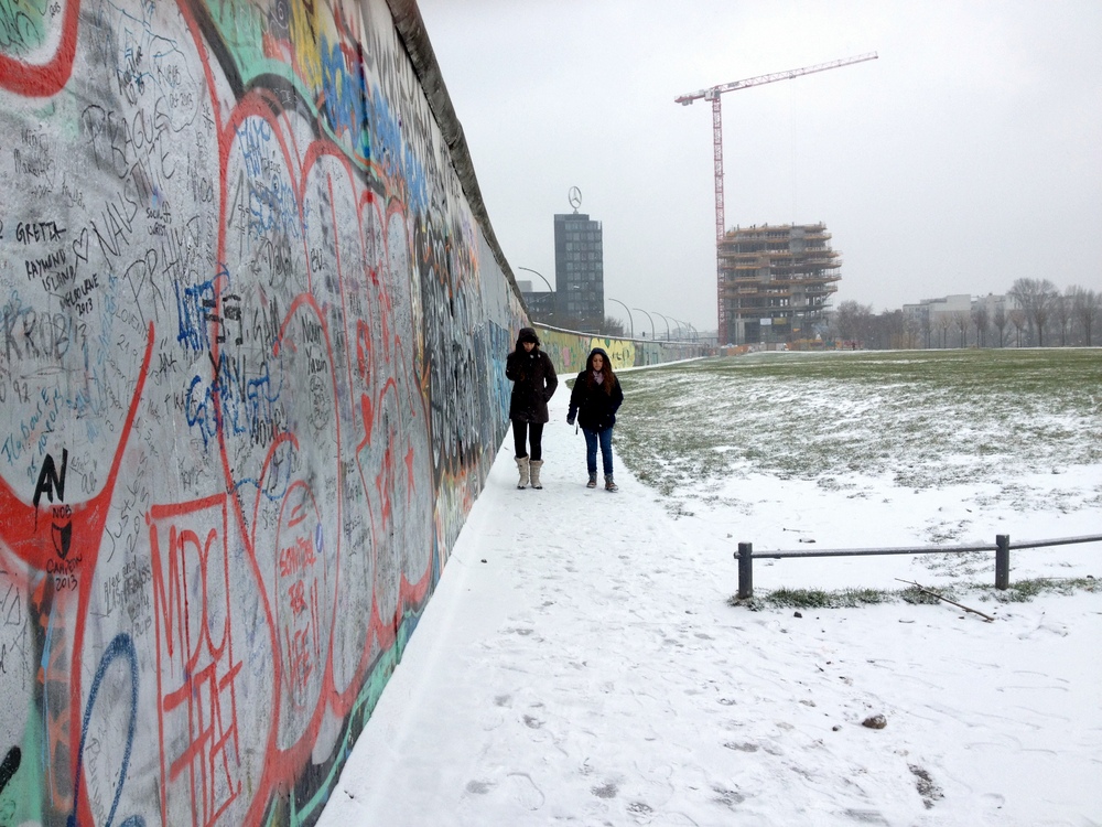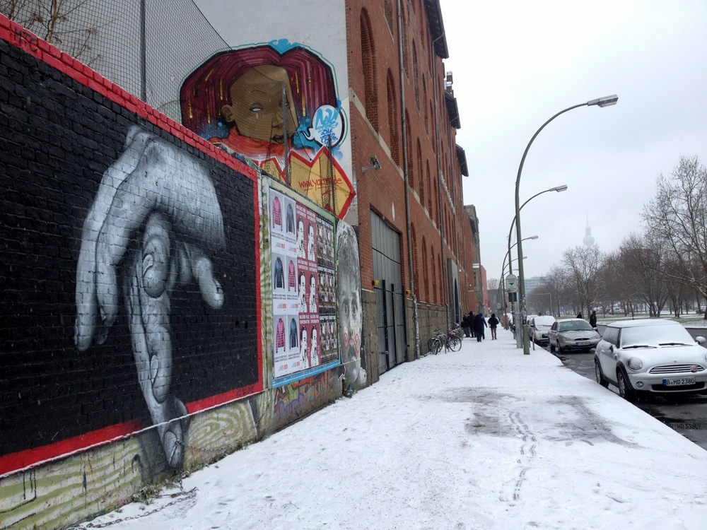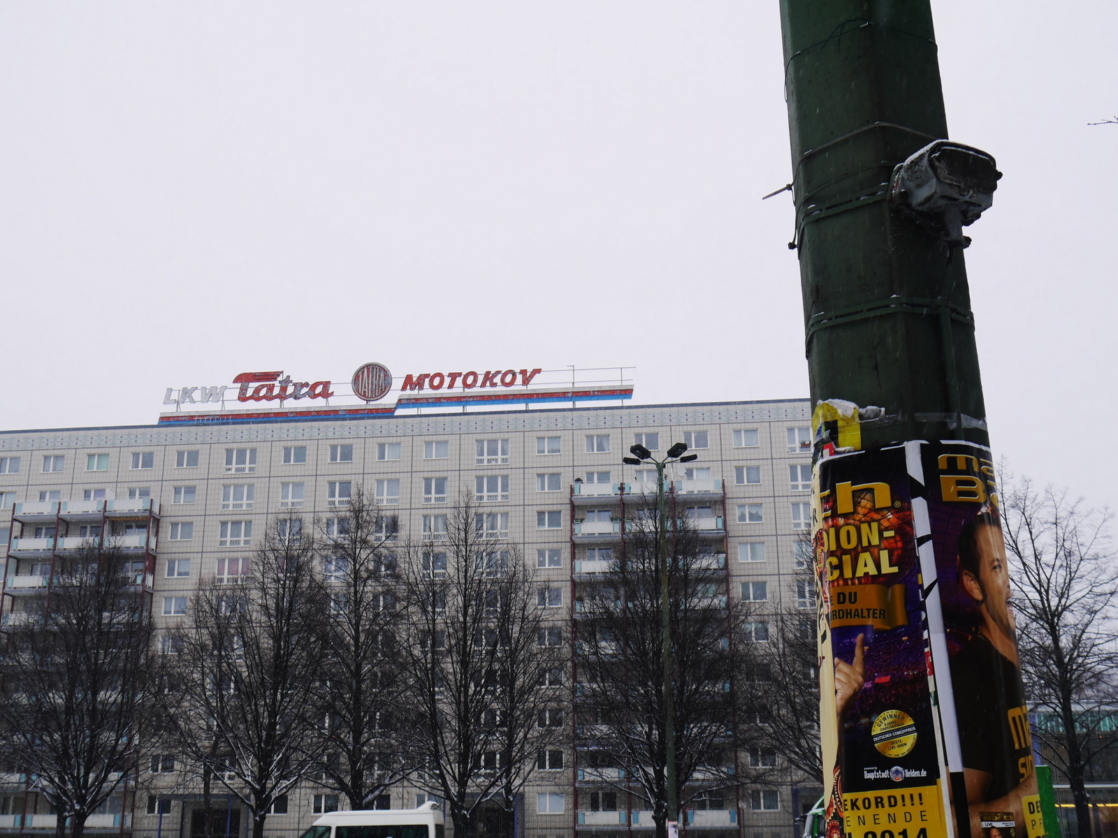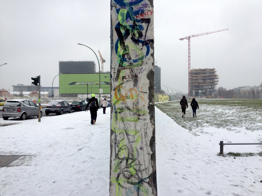 Alexanderplatz, je sors de l’U-Bahn, le métro berlinois… Ca me fait bizarre, j’y étais il y a un mois et demi. Il faisait déjà nuit, alors qu’il n’était que 18h et l’endroit était plein à craquer, rempli d’une foule joyeuse qui venait profiter du grand marché de Noël mais aujourd’hui, le ciel est blanc, le grand espace vide et la neige tombe doucement. Nous sommes lundi midi et pourtant, tout semble y avoir un goût de dimanche: il n’y a presque personne. Une atmosphère grise, un ciel bas, idéale pour une courte ballade sur les traces de la République démocratique allemande à Berlin-Est.![]()