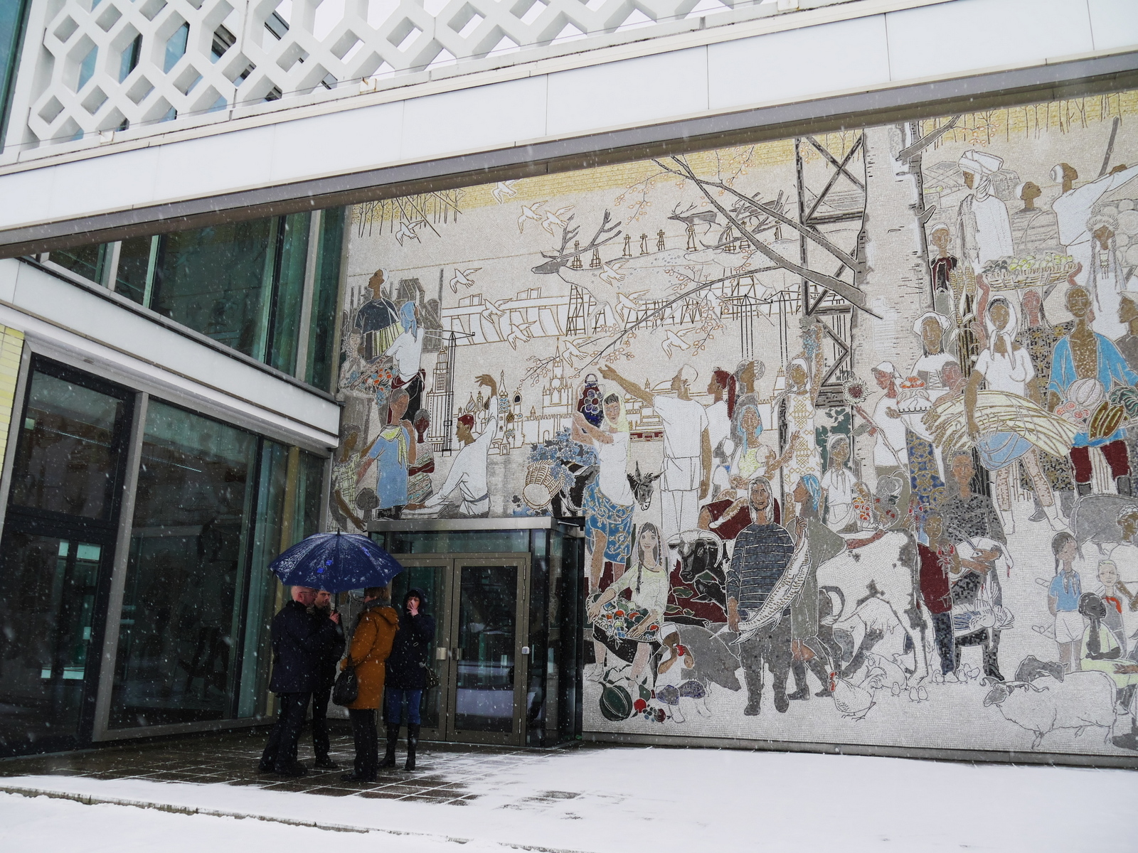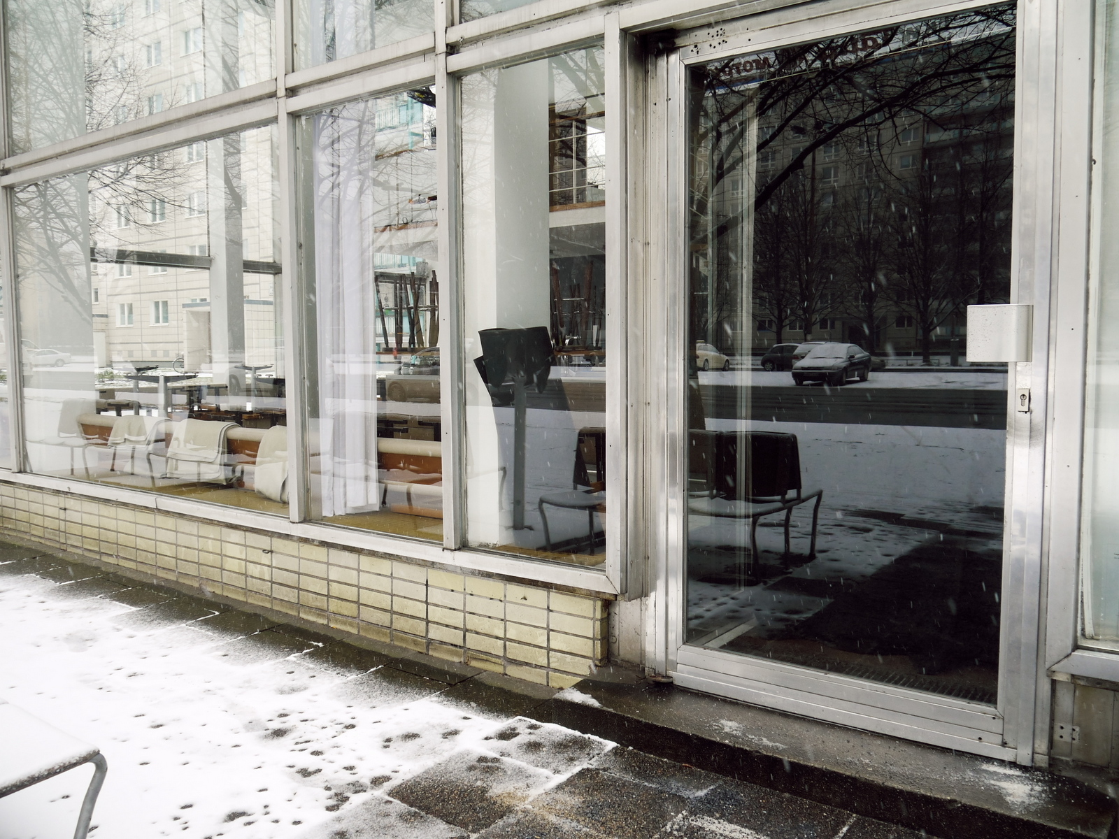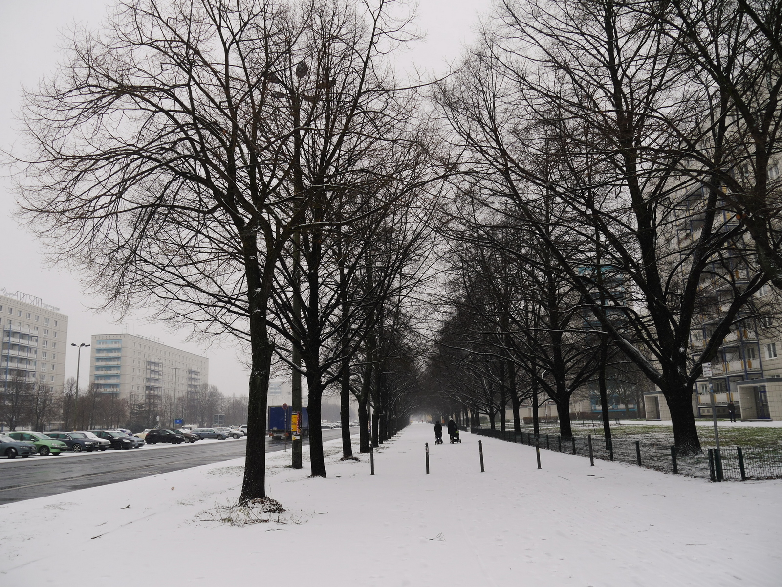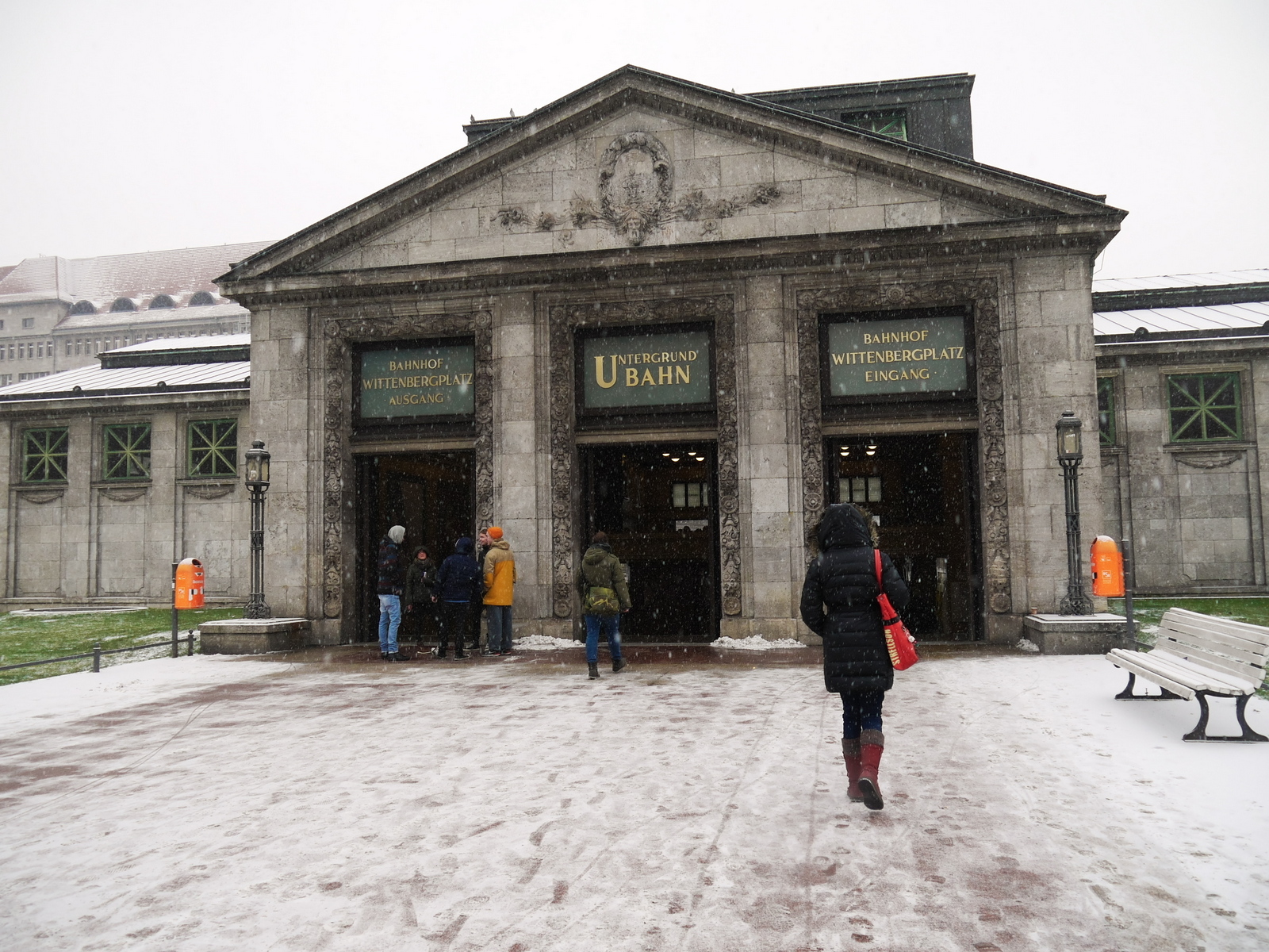 Alexanderplatz, je sors de l’U-Bahn, le métro berlinois… Ca me fait bizarre, j’y étais il y a un mois et demi. Il faisait déjà nuit, alors qu’il n’était que 18h et l’endroit était plein à craquer, rempli d’une foule joyeuse qui venait profiter du grand marché de Noël mais aujourd’hui, le ciel est blanc, le grand espace vide et la neige tombe doucement. Nous sommes lundi midi et pourtant, tout semble y avoir un goût de dimanche: il n’y a presque personne. Une atmosphère grise, un ciel bas, idéale pour une courte ballade sur les traces de la République démocratique allemande à Berlin-Est.![]()