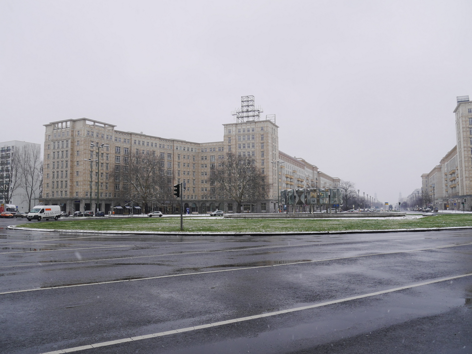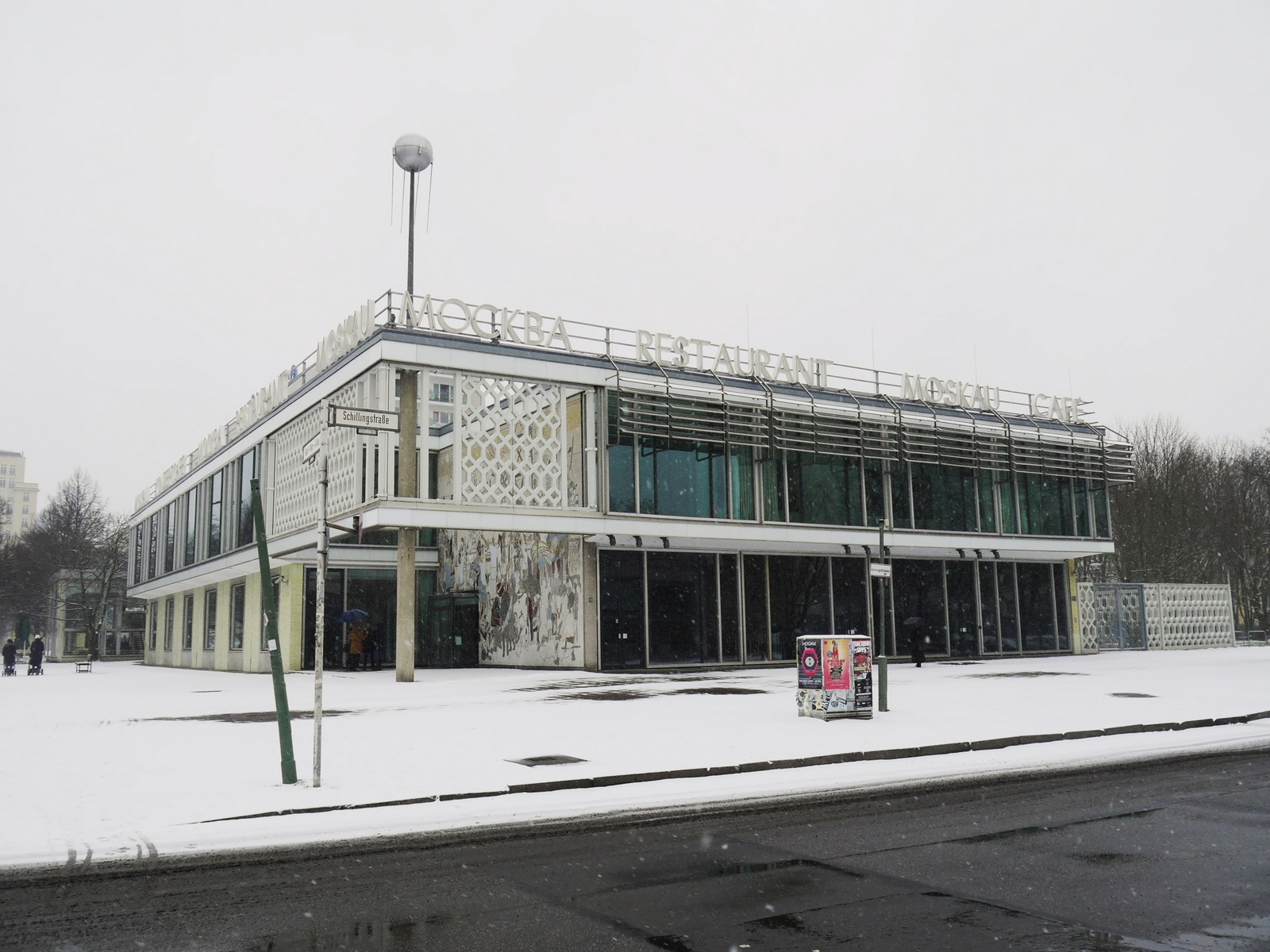 Et franchir les premiers mètres de Karl-Marx-Allee, c’est pousser une espèce de porte sur un autre monde : celui du socialisme triomphant. C’est ici que la DDR tenait ses défilés militaires du 1er mai. Karl-Marx-Allee est un large canyon blanc. Les bâtiment qui la bordent, ressemblent à un alignement de boîte d’une petite dizaine d’étage. C’est étrange et hypnotique. Vive le réalisme soviétique! Enfin, quand on parle de réalisme… On ne peut pas dire que ce style soit à taille humaine. Au contraire, on pourrait dire que tout était fait pour l’écraser, pour impressionner. La Karl-Marx-Allee, construite avec les ruines de la guerre, et l’aide des « pays frères » devait être la vitrine du socialisme en marche. On y logeait pontes du parti et travailleurs méritants (ou pistonnés) On venait s’y promener, manger un morceau aux Cafés Warschau? Bukarest ou Moskau (qui existe encore, avec sa mosaïque) ou regarder un film au Kino International…